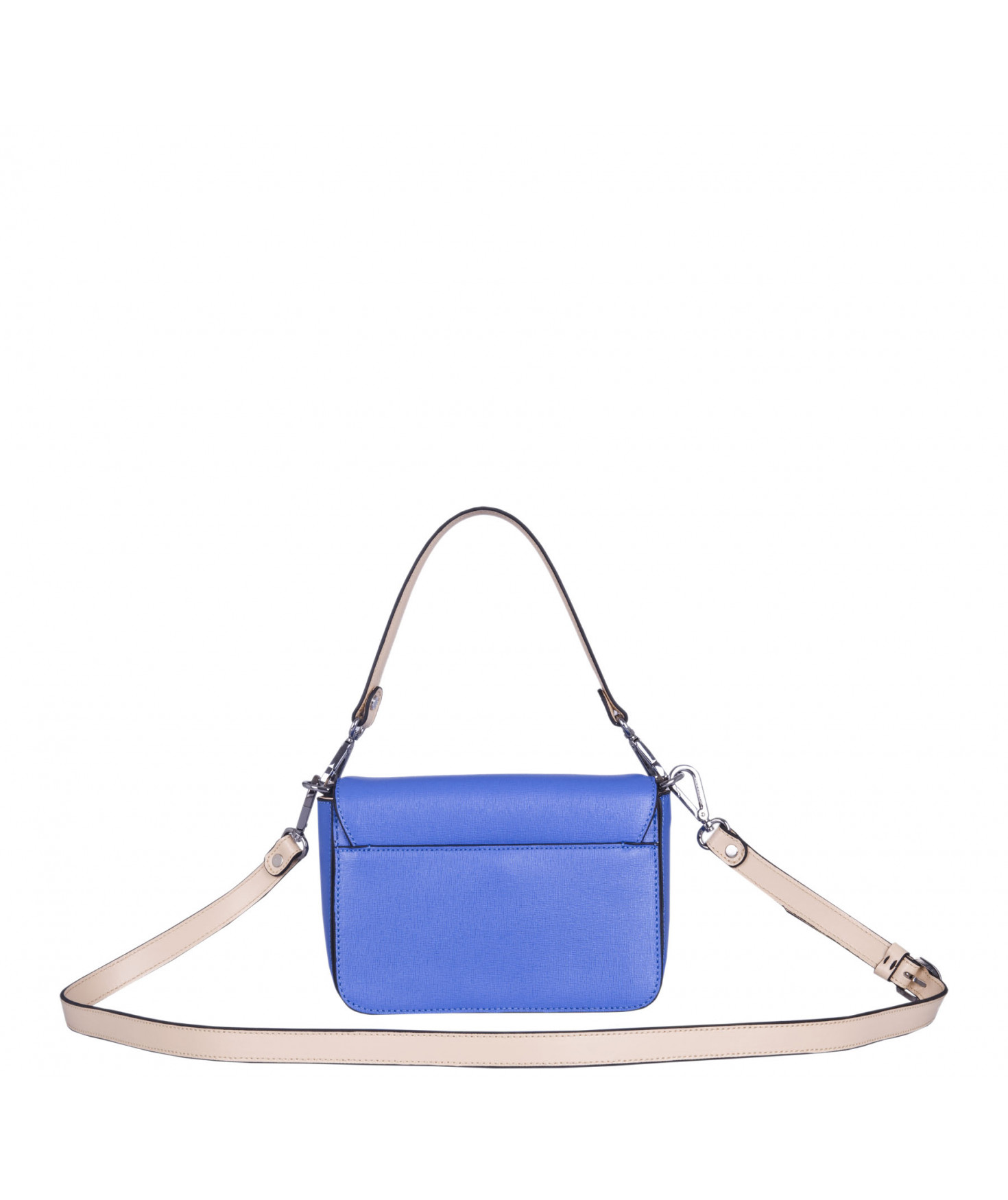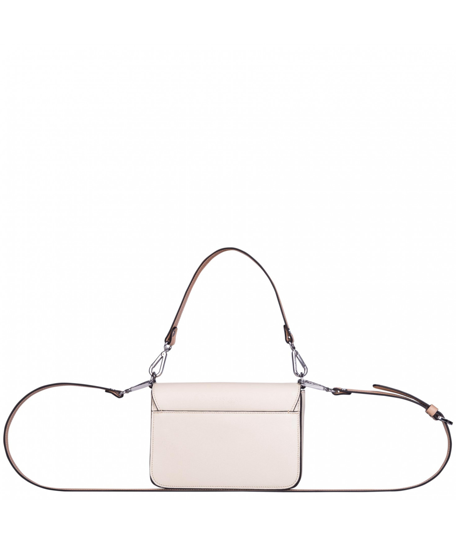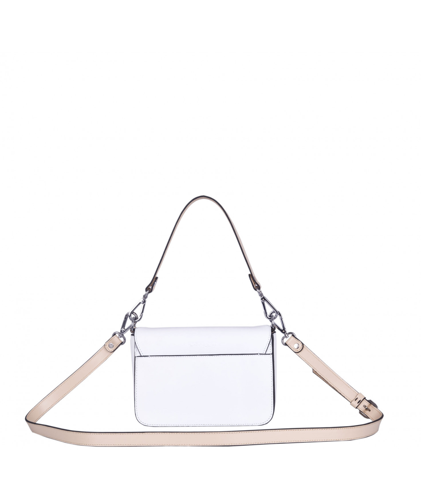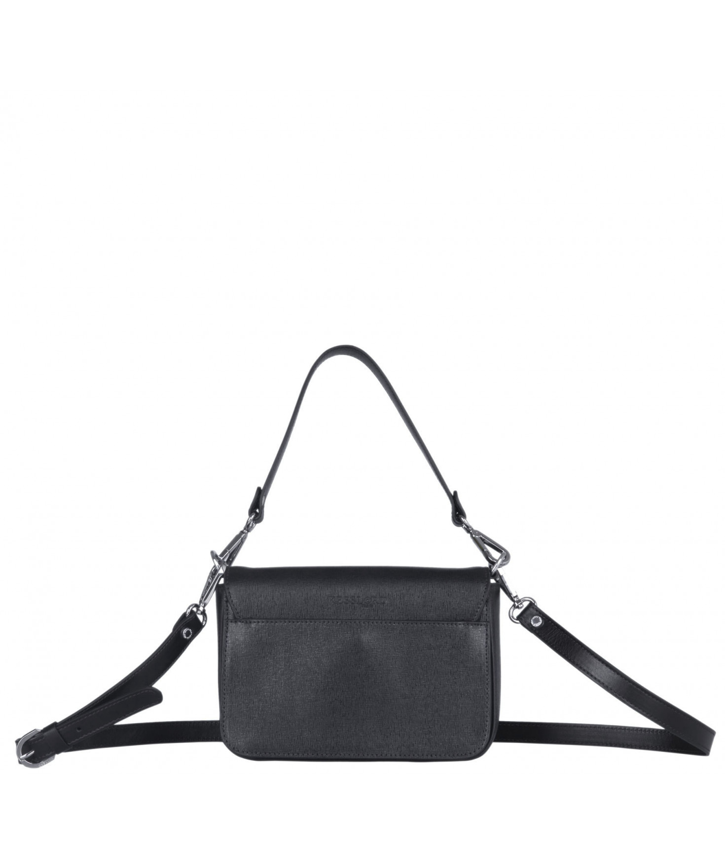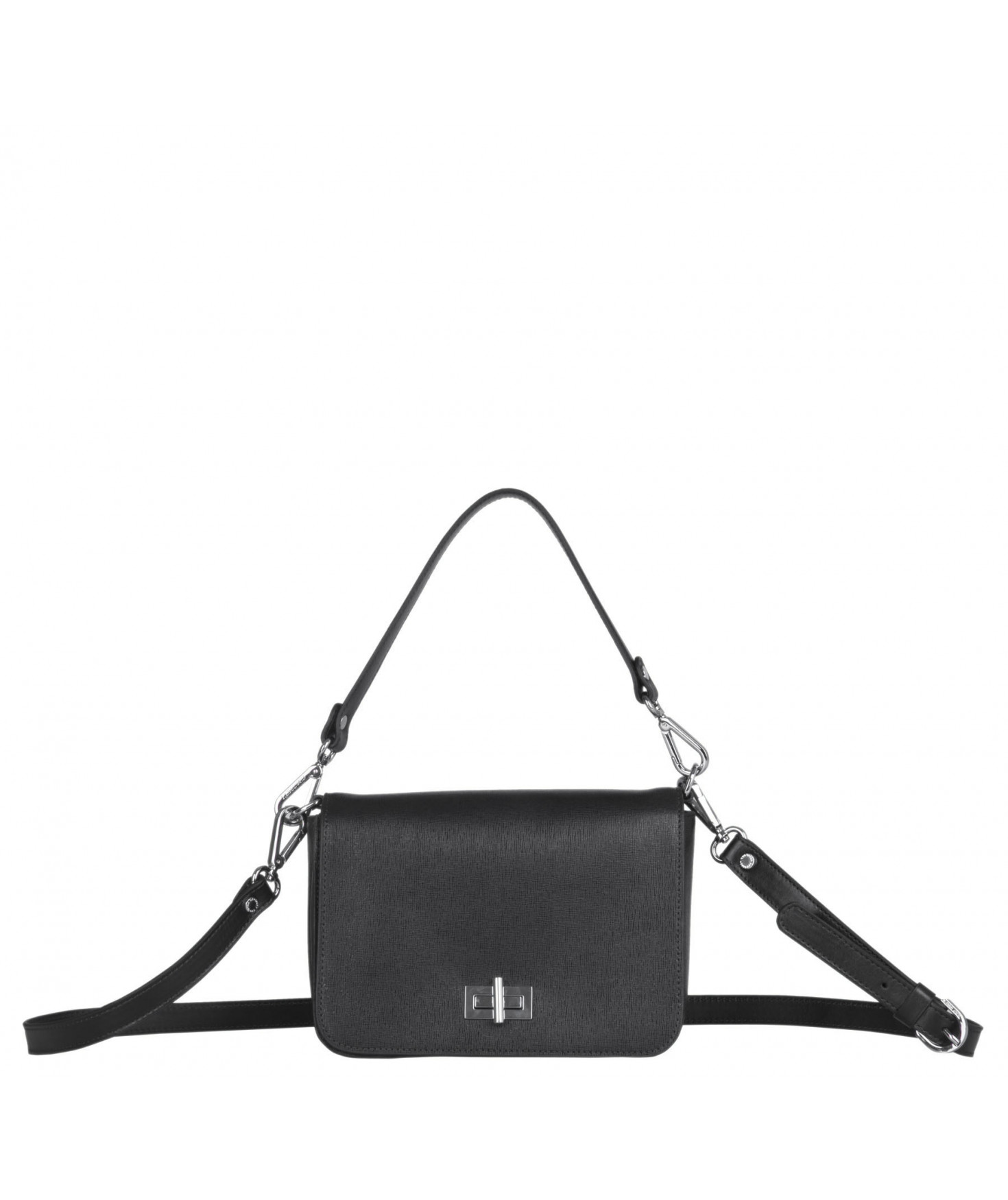 Petit sac à rabat porté main ou croisé grâce à deux bandoulières amovibles de longueurs différentes. La bandoulière la plus longue est réglable.Trois compartiments intérieurs. Une poche intérieure zippée. Poche extérieure à pression aimantée sur l'arrière. Bijouterie en métal finition argentée.