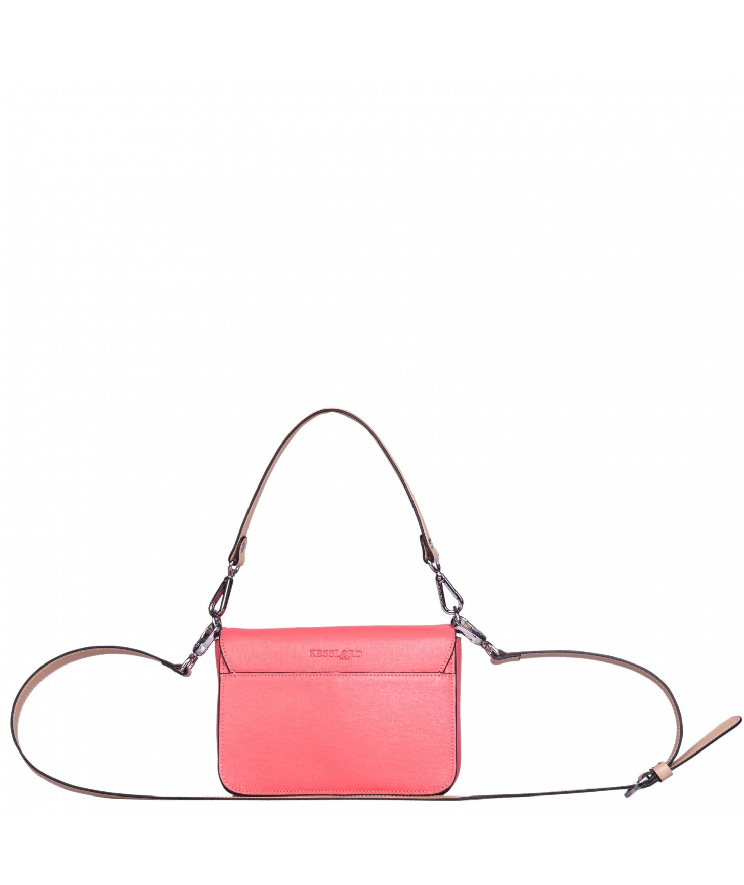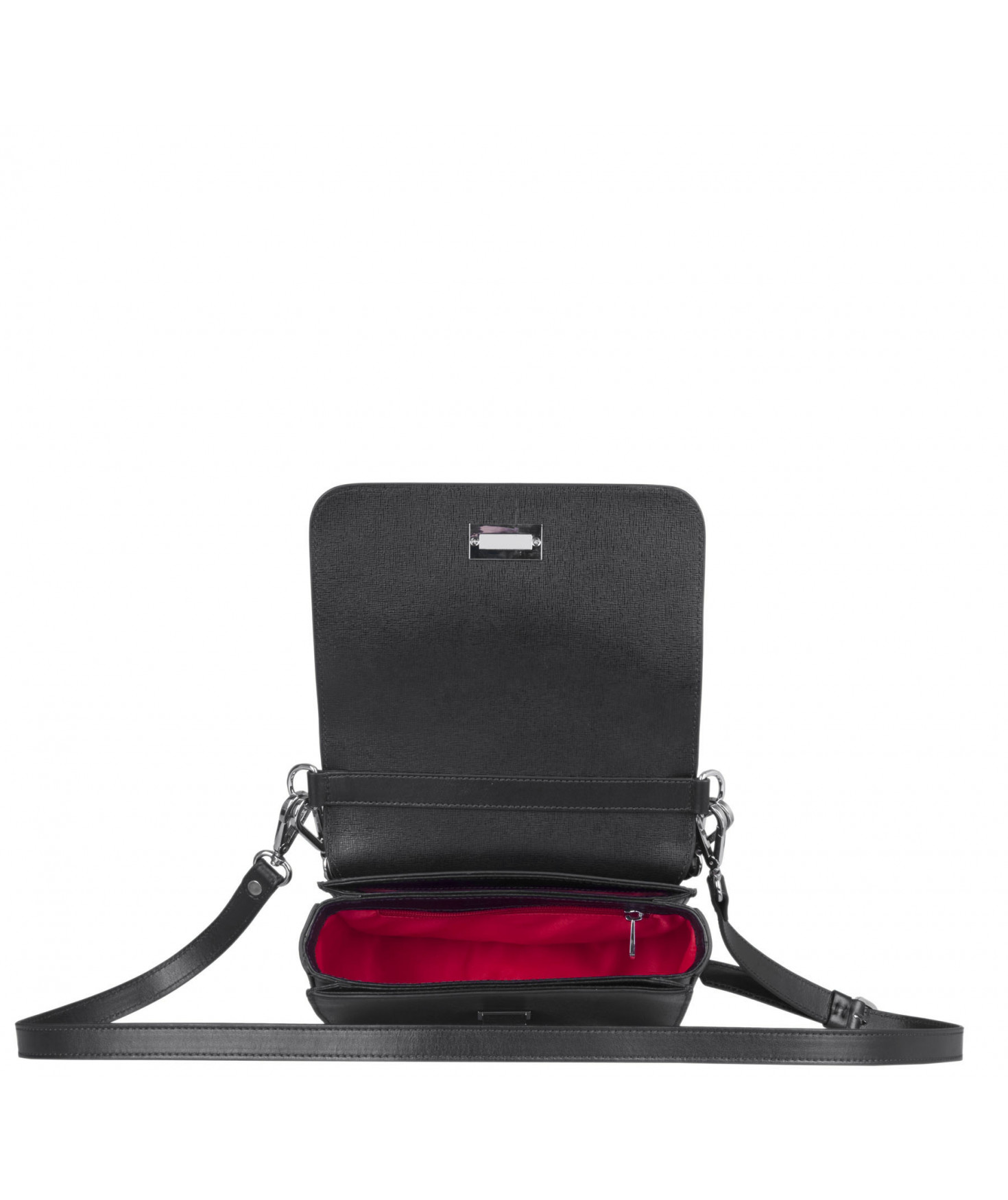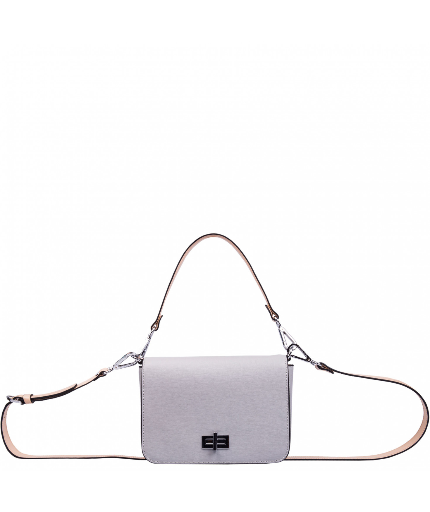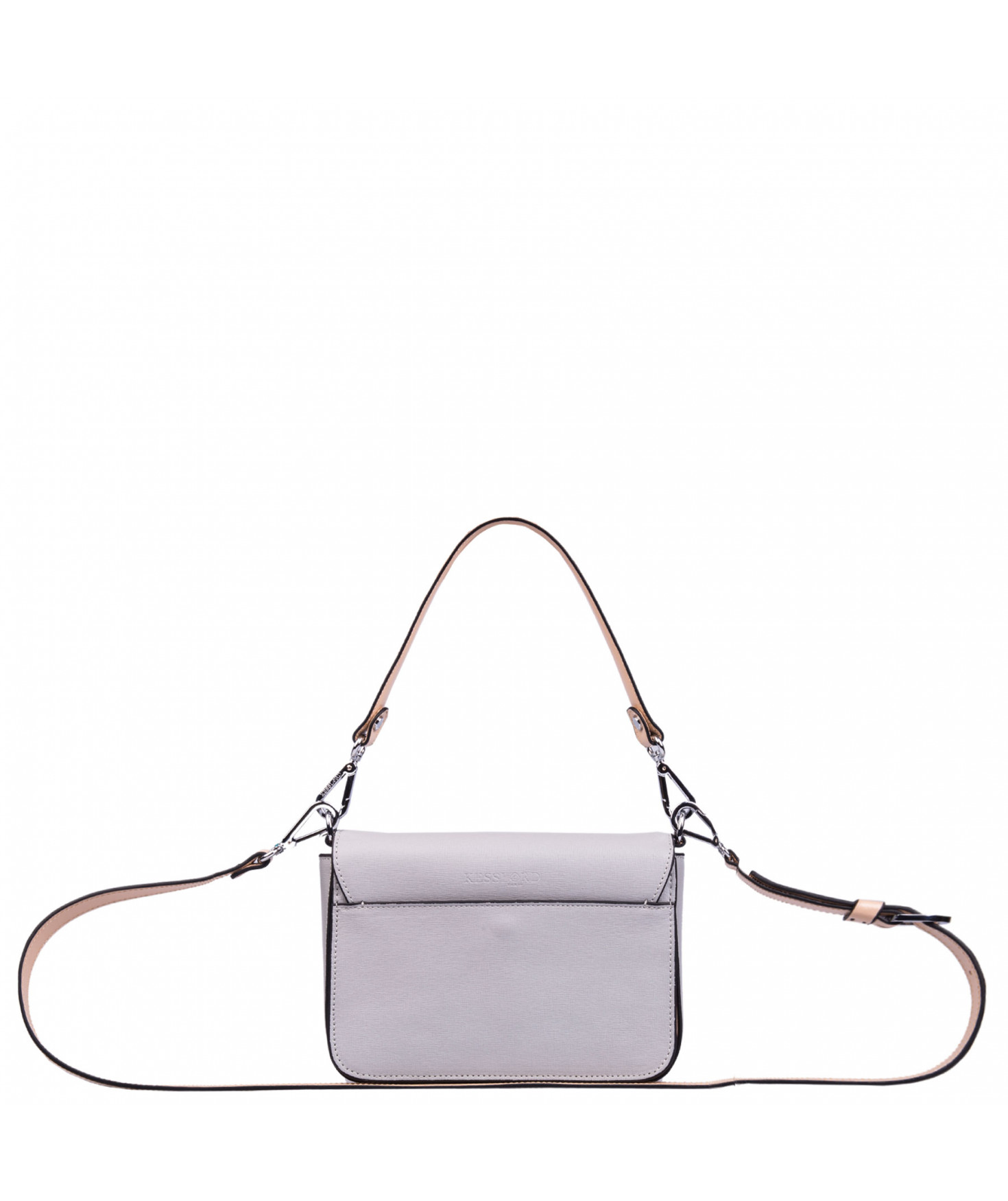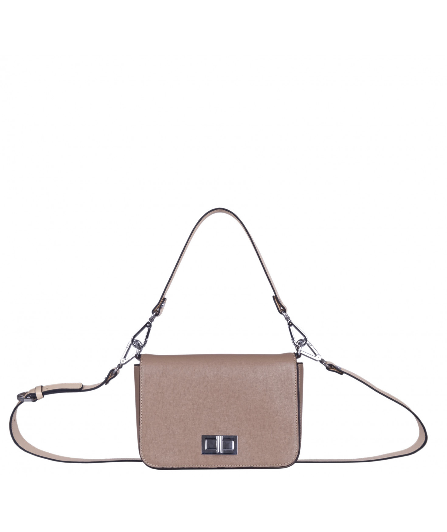 Petit sac à rabat porté main ou croisé grâce à deux bandoulières amovibles de longueurs différentes. La bandoulière la plus longue est réglable.Trois compartiments intérieurs. Une poche intérieure zippée. Poche extérieure à pression aimantée sur l'arrière. Bijouterie en métal finition argentée.