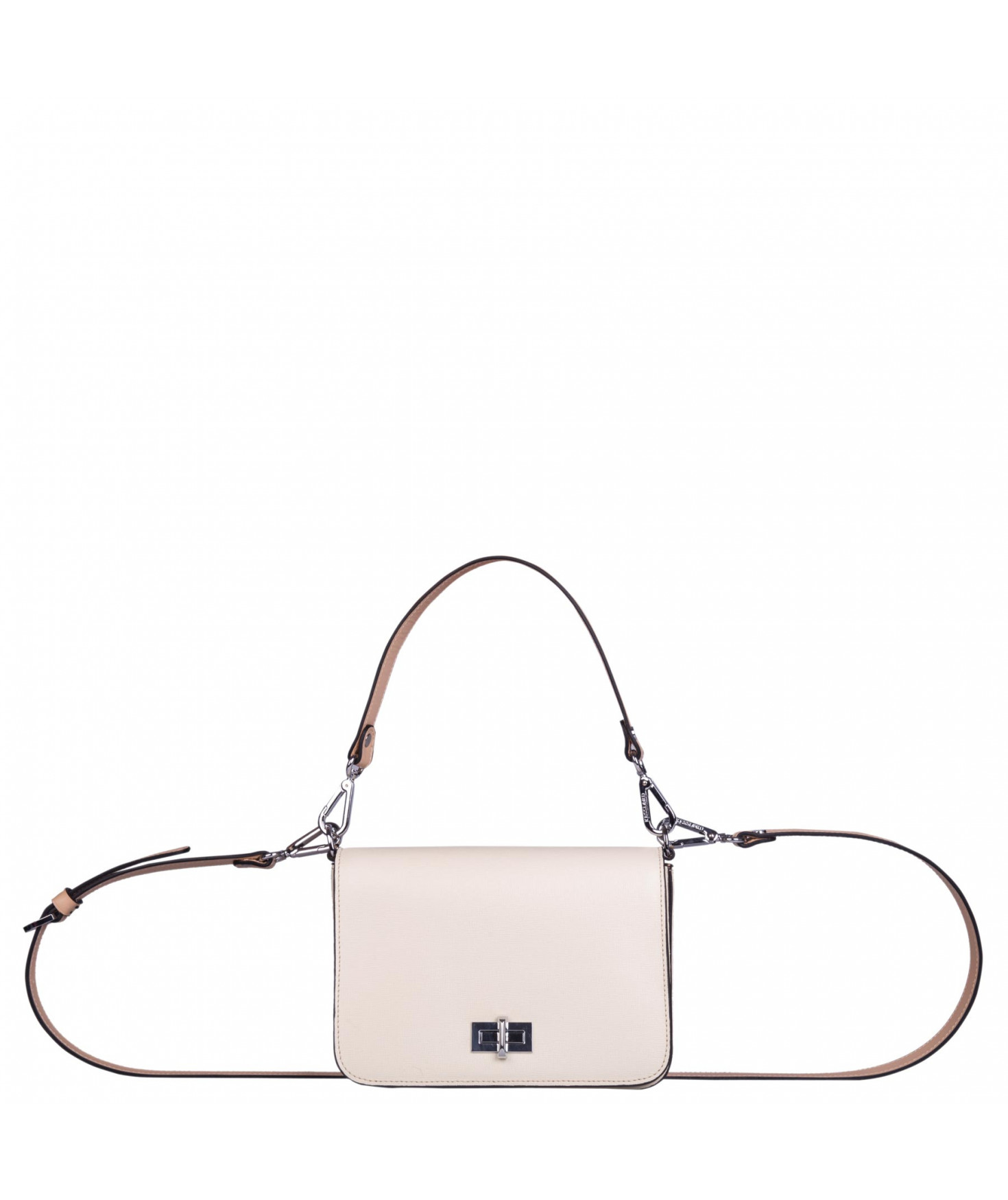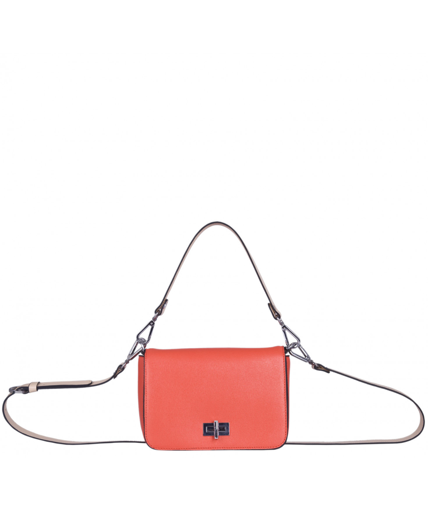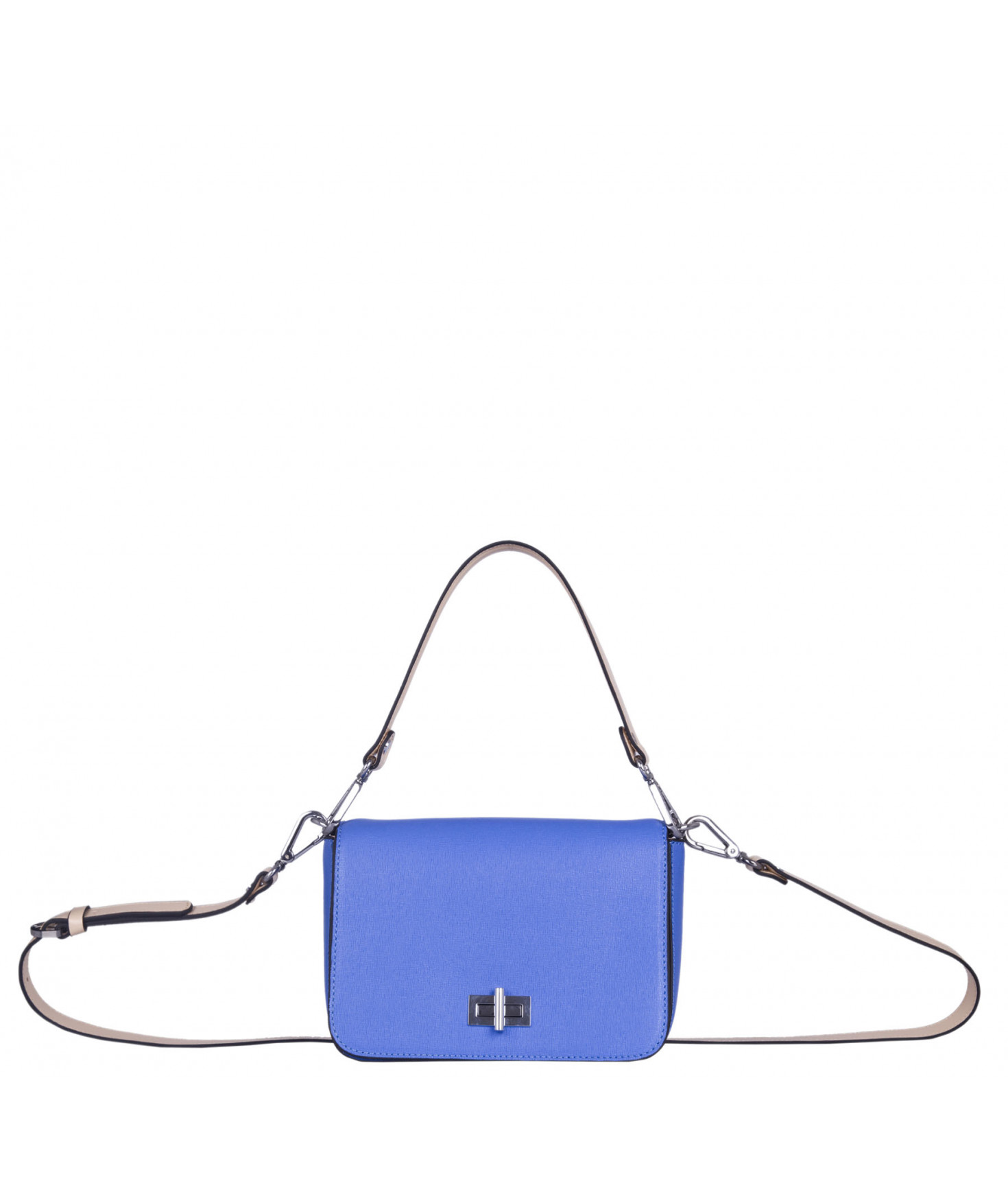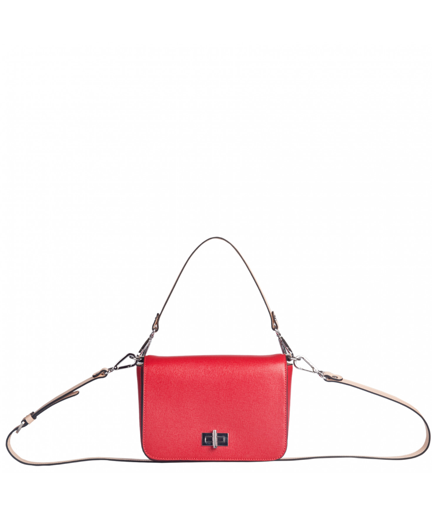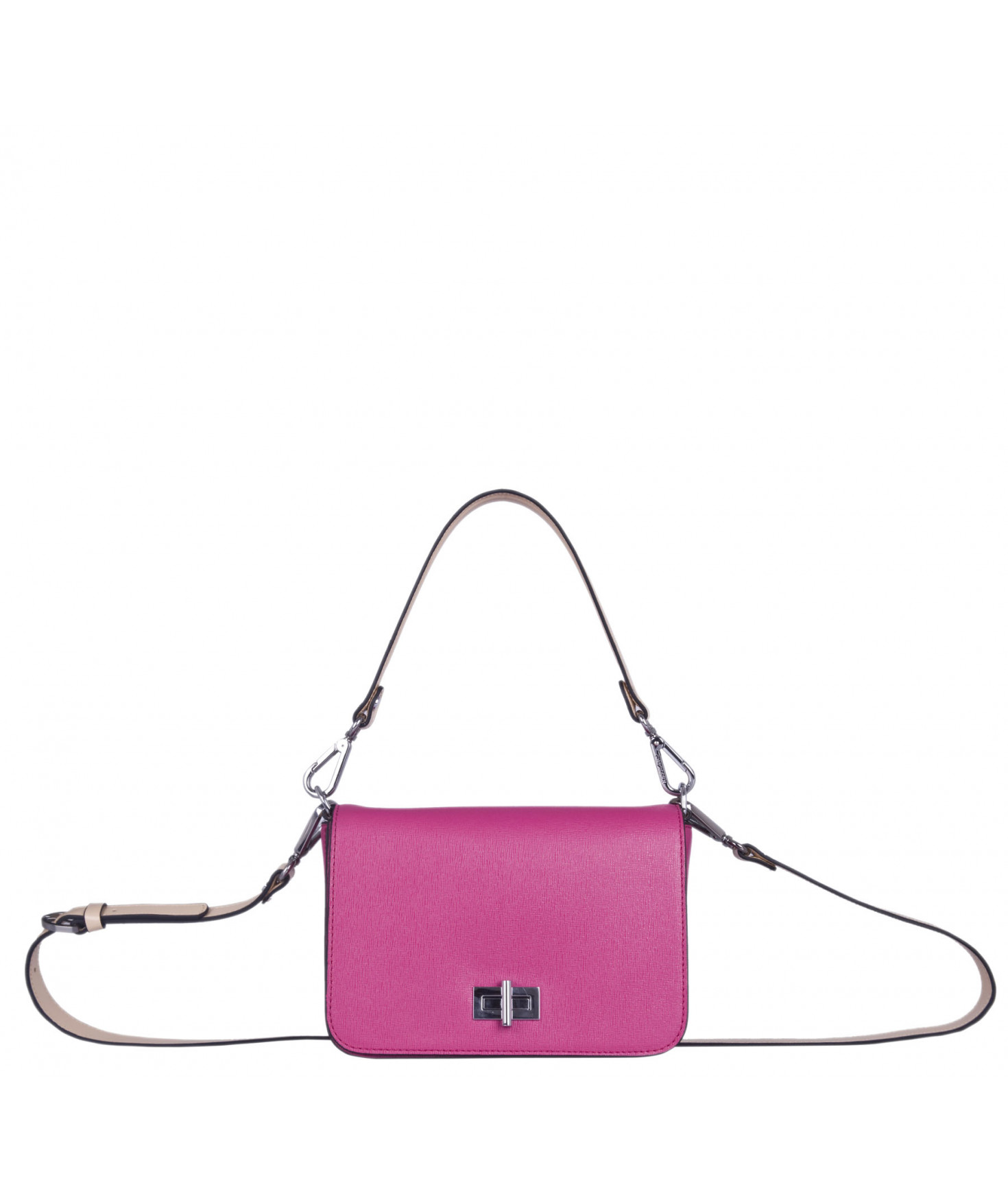 Petit sac à rabat porté main ou croisé grâce à deux bandoulières amovibles de longueurs différentes. La bandoulière la plus longue est réglable.Trois compartiments intérieurs. Une poche intérieure zippée. Poche extérieure à pression aimantée sur l'arrière. Bijouterie en métal finition argentée.