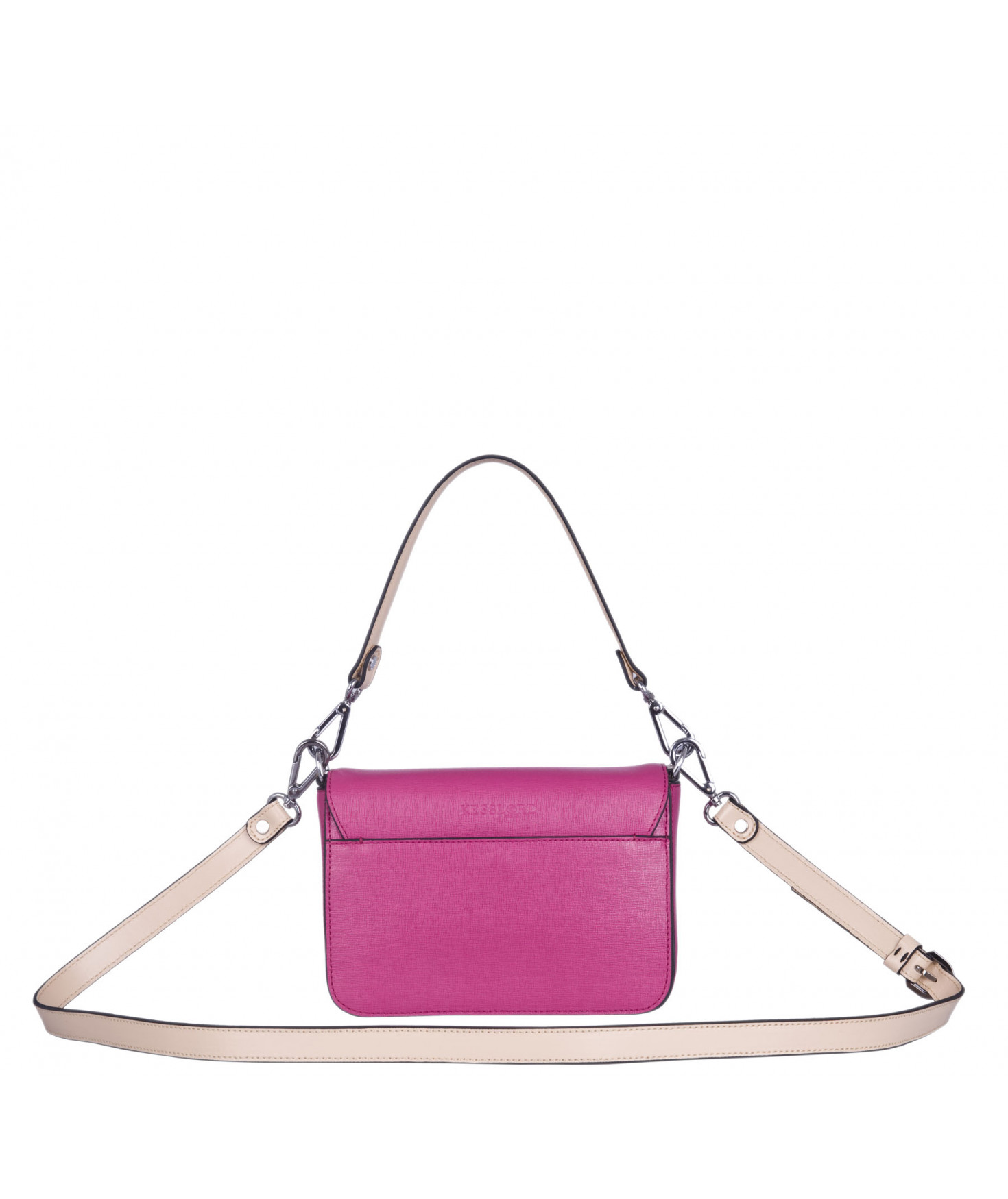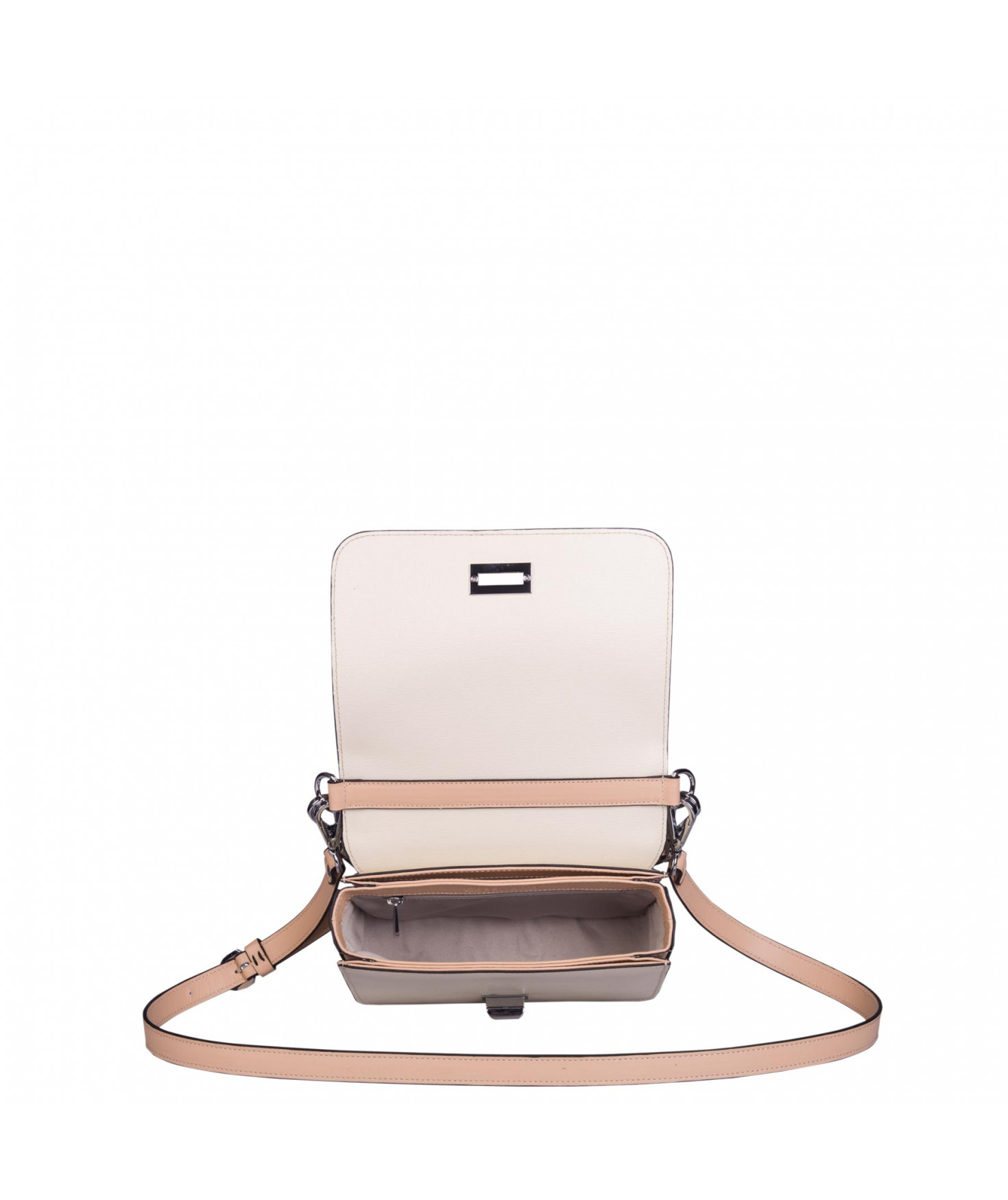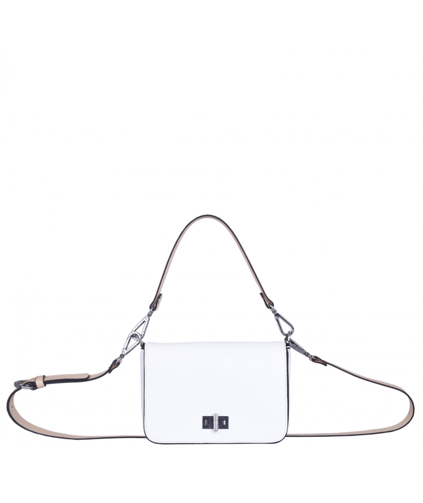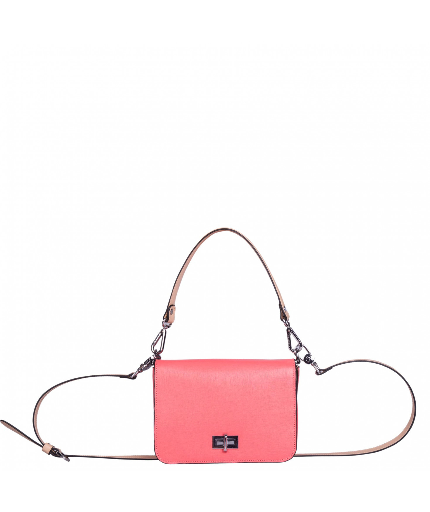 Petit sac à rabat porté main ou croisé grâce à deux bandoulières amovibles de longueurs différentes. La bandoulière la plus longue est réglable.Trois compartiments intérieurs. Une poche intérieure zippée. Poche extérieure à pression aimantée sur l'arrière. Bijouterie en métal finition argentée.