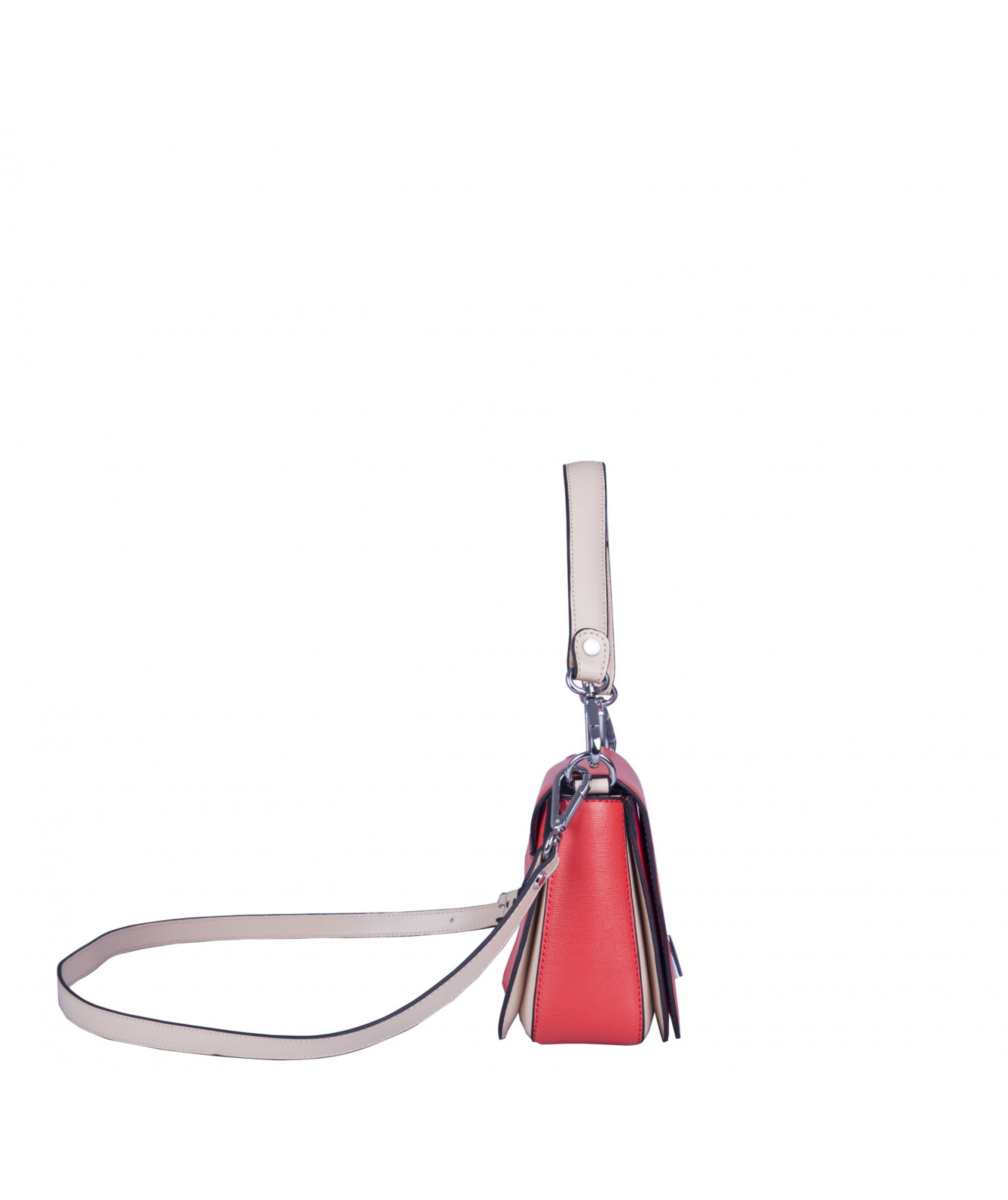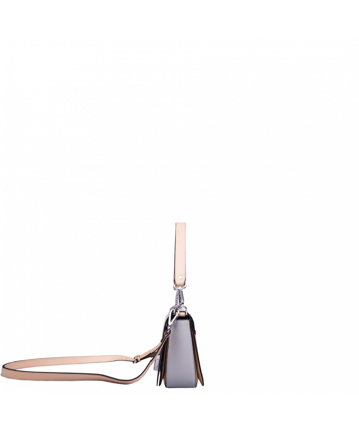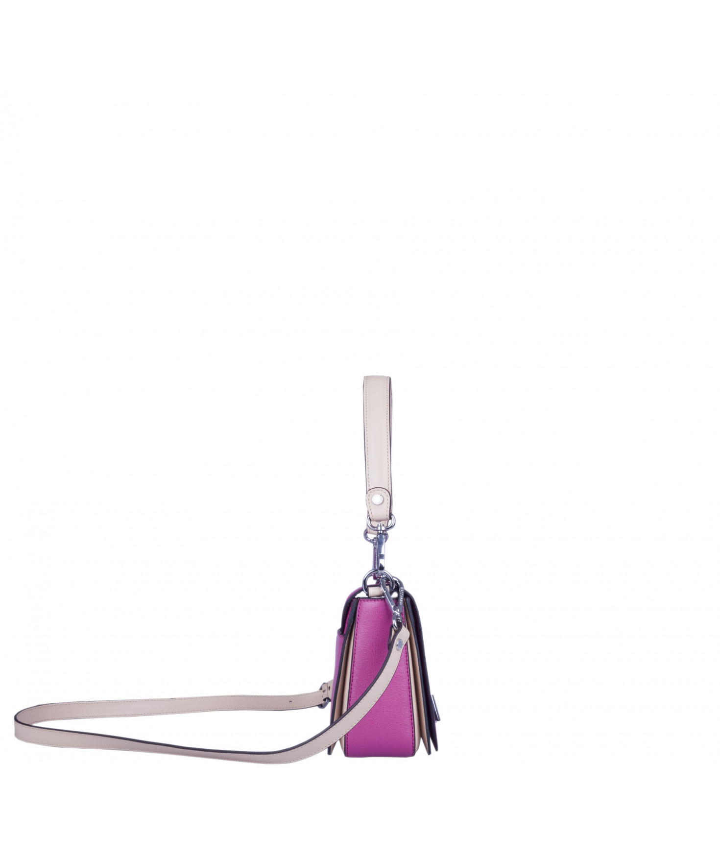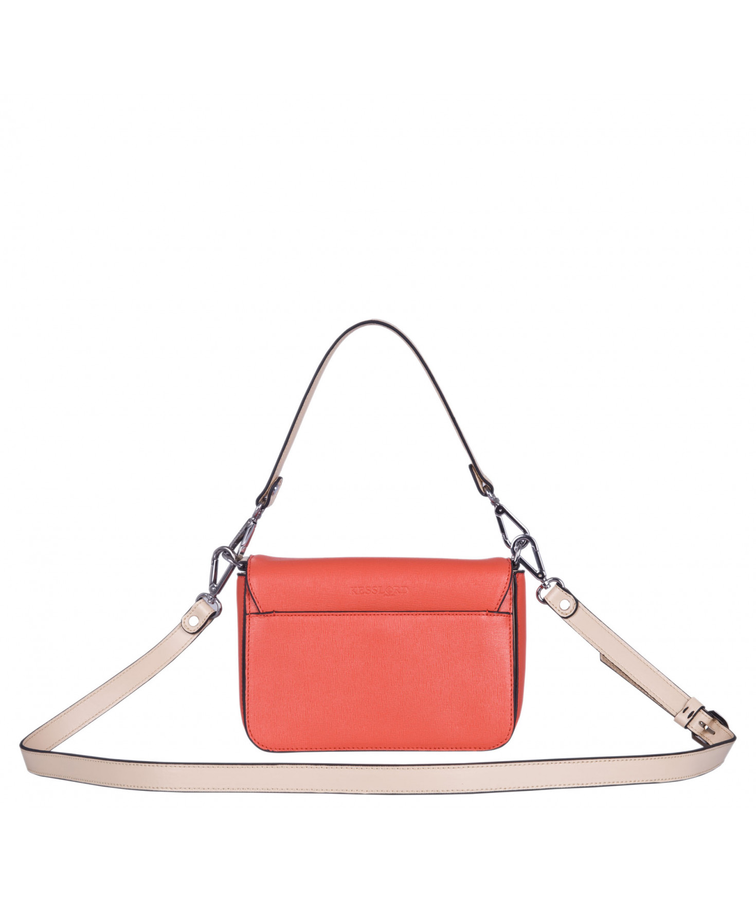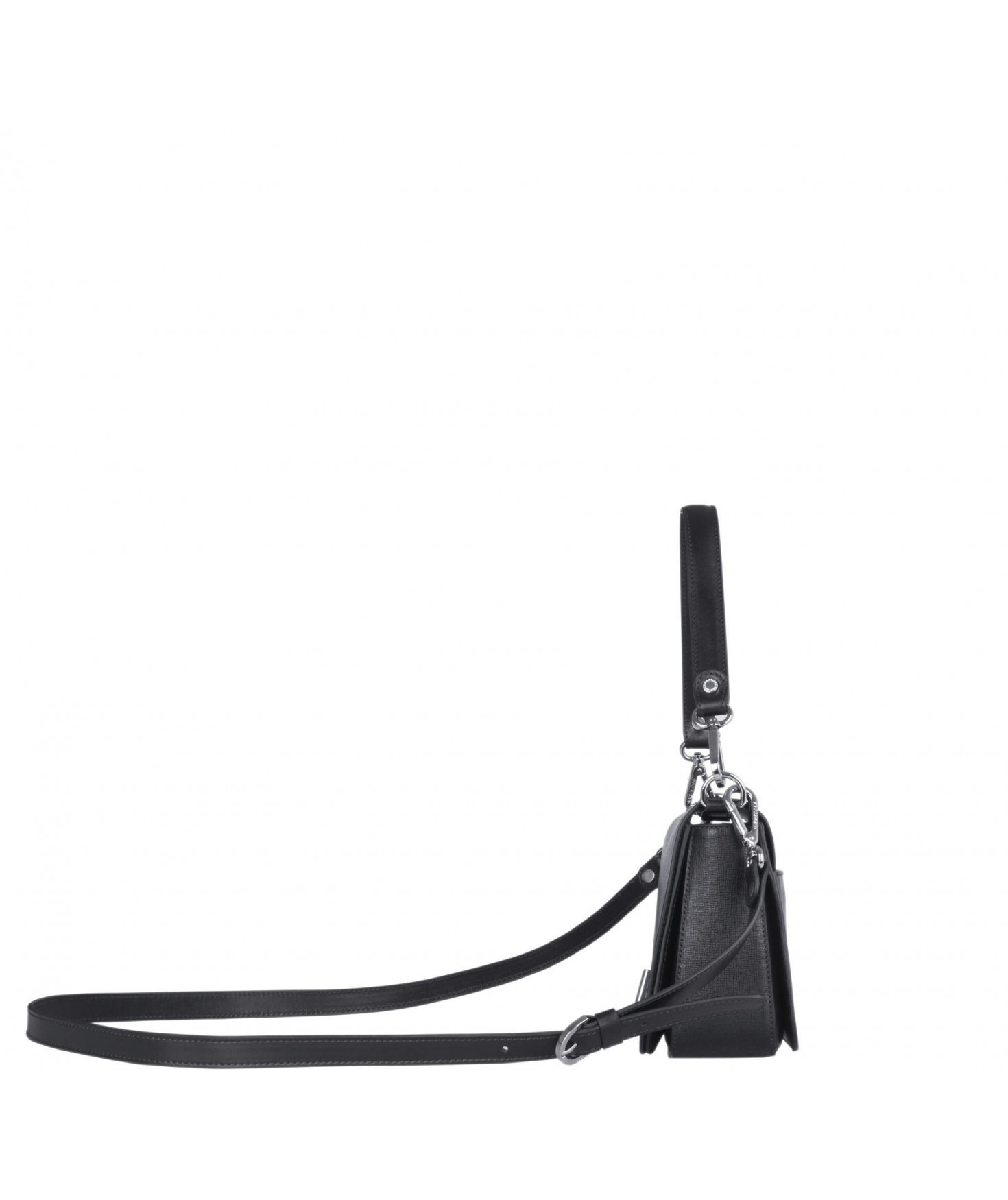 Petit sac à rabat porté main ou croisé grâce à deux bandoulières amovibles de longueurs différentes. La bandoulière la plus longue est réglable.Trois compartiments intérieurs. Une poche intérieure zippée. Poche extérieure à pression aimantée sur l'arrière. Bijouterie en métal finition argentée.