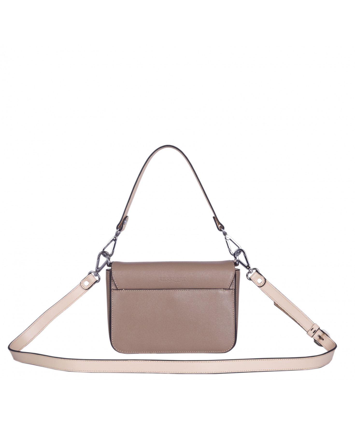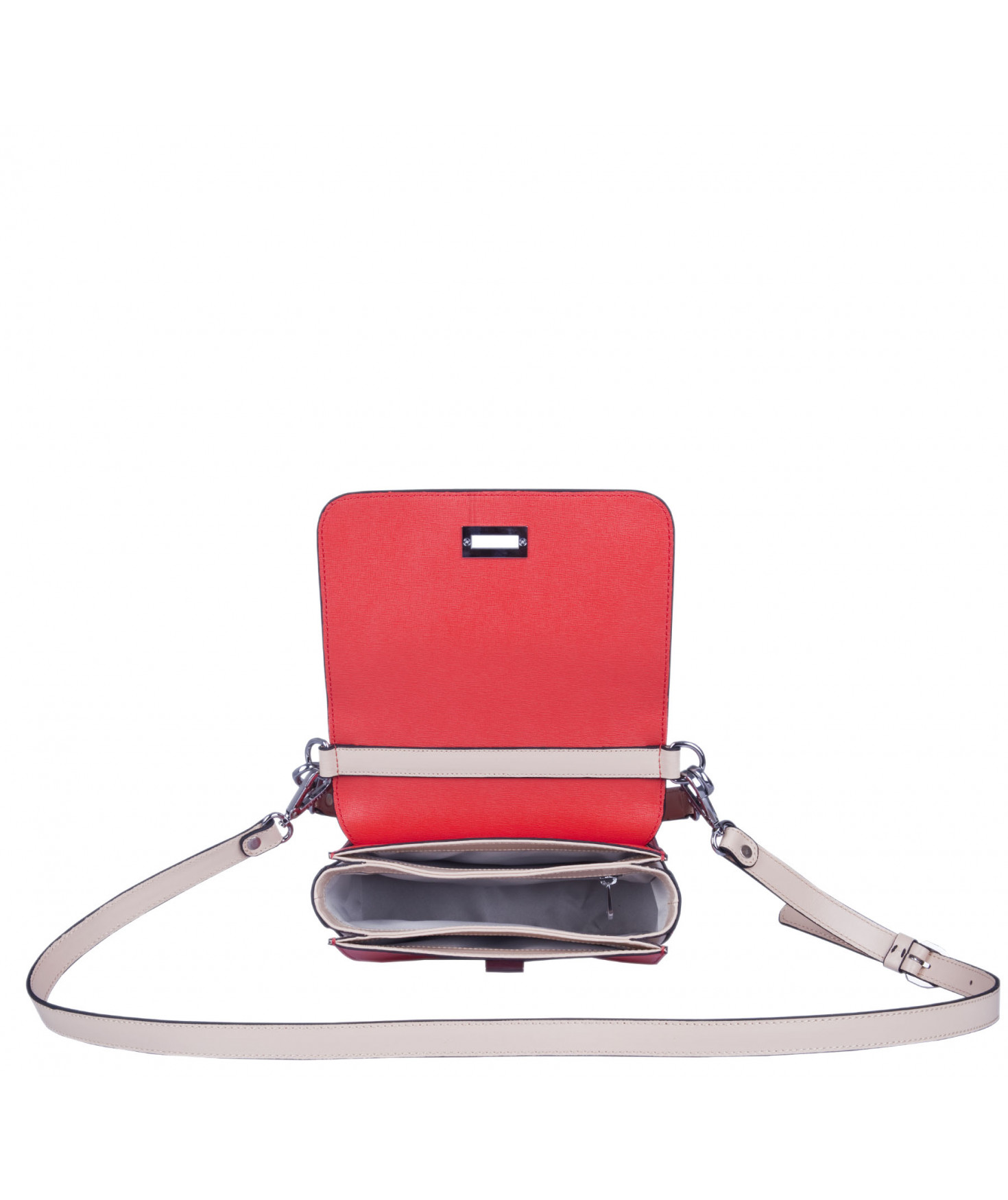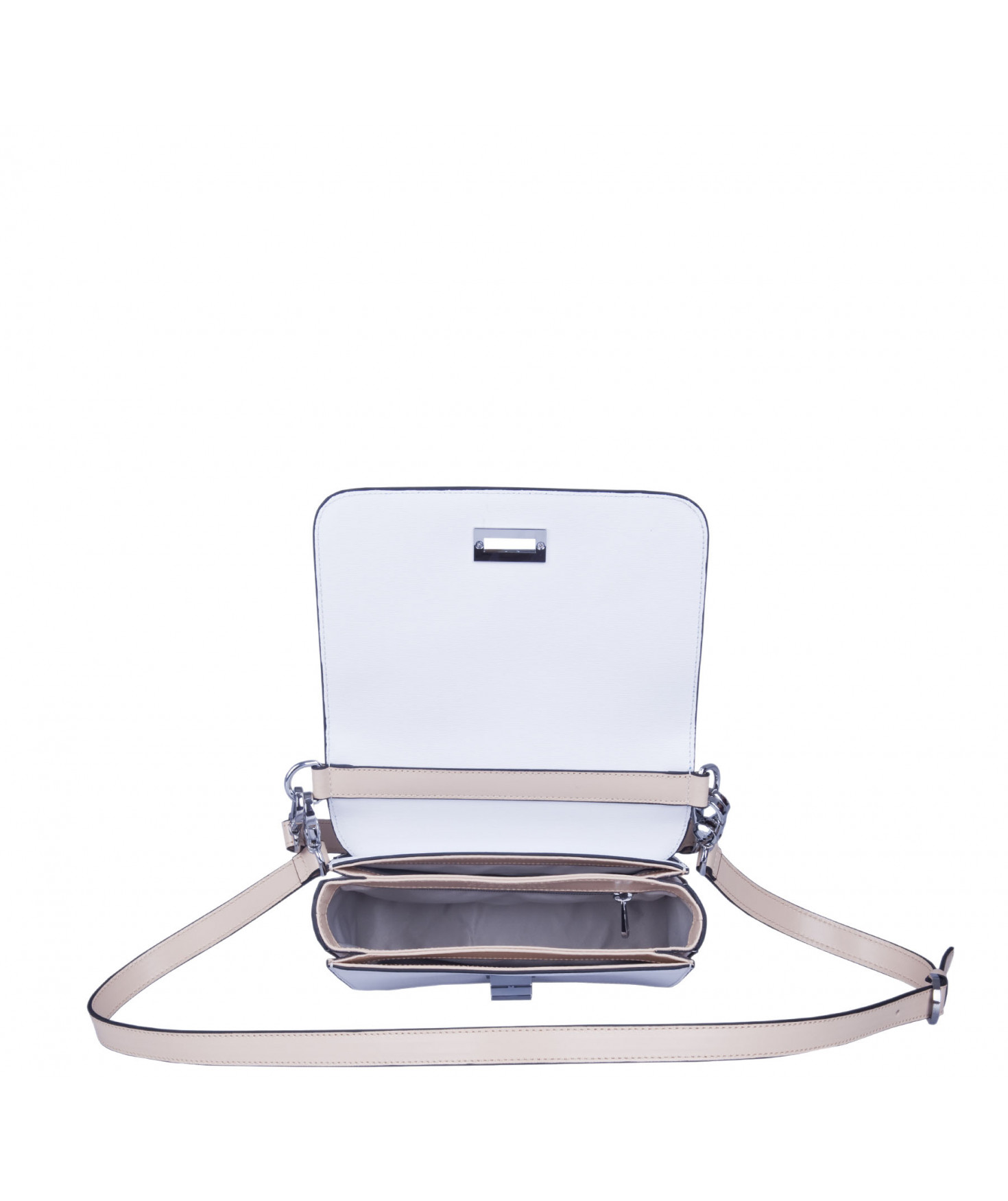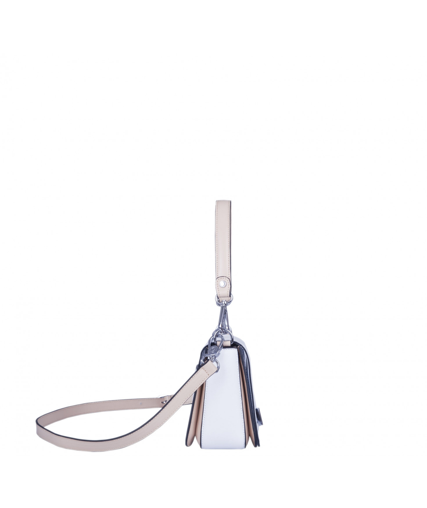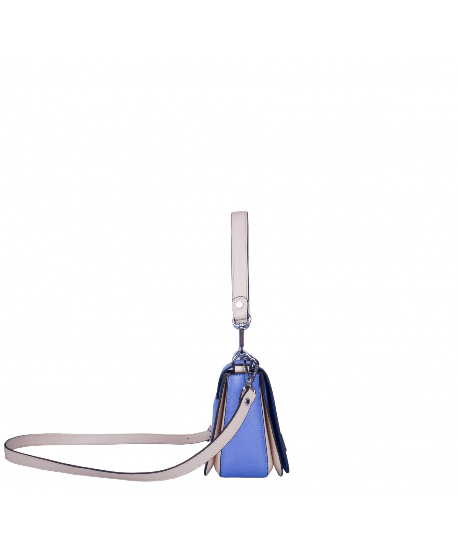 Petit sac à rabat porté main ou croisé grâce à deux bandoulières amovibles de longueurs différentes. La bandoulière la plus longue est réglable.Trois compartiments intérieurs. Une poche intérieure zippée. Poche extérieure à pression aimantée sur l'arrière. Bijouterie en métal finition argentée.