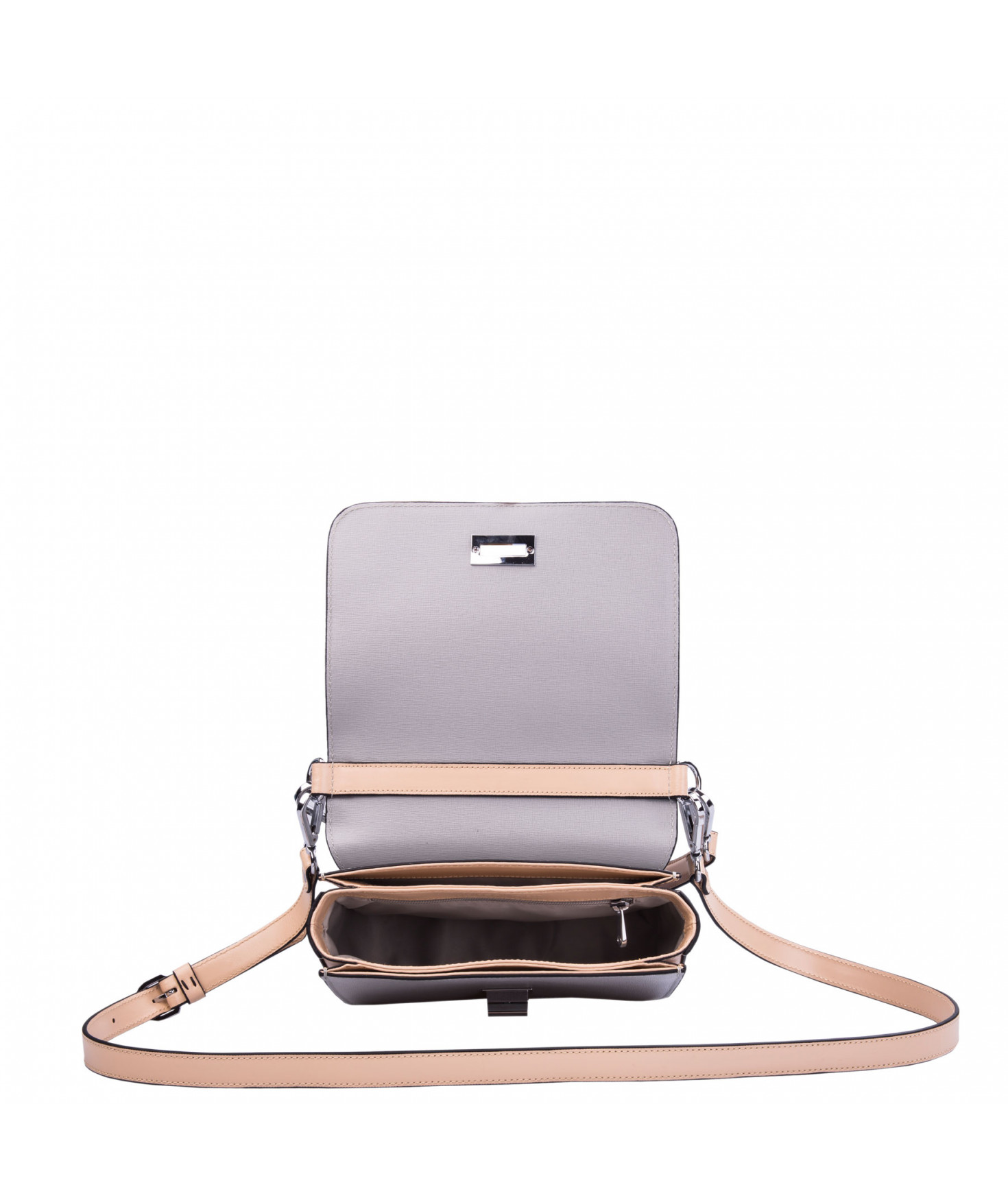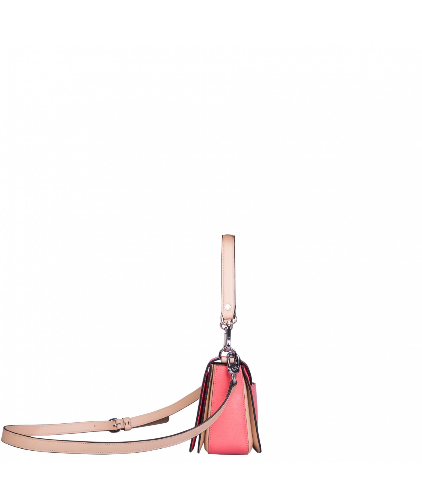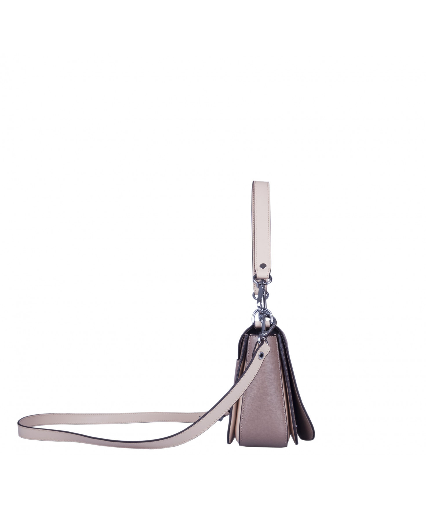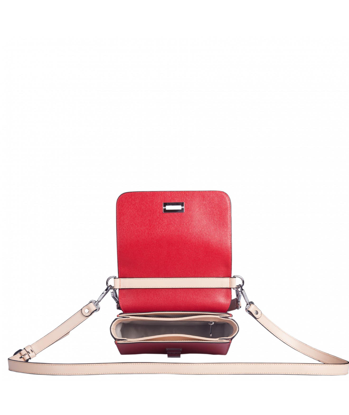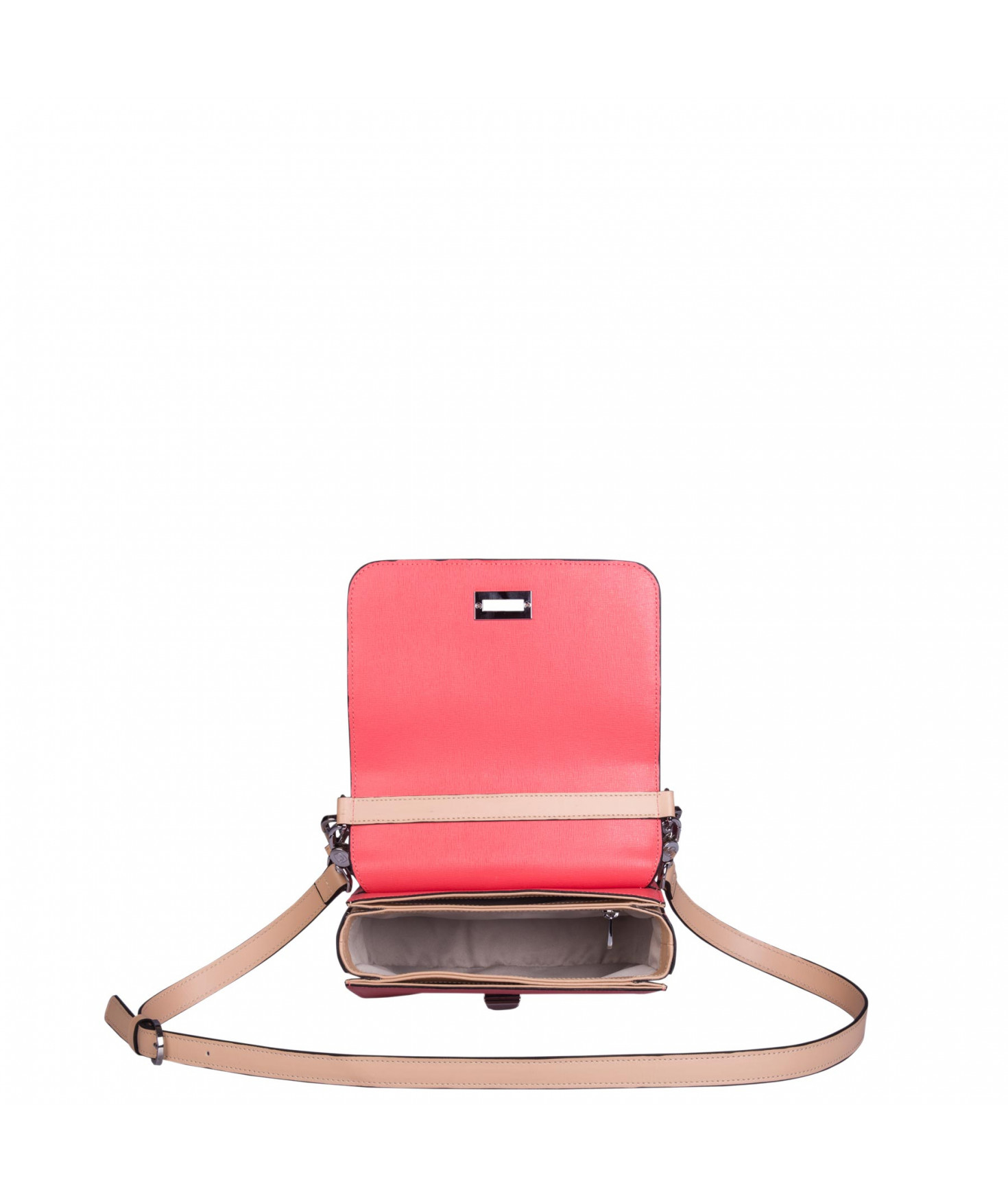 Petit sac à rabat porté main ou croisé grâce à deux bandoulières amovibles de longueurs différentes. La bandoulière la plus longue est réglable.Trois compartiments intérieurs. Une poche intérieure zippée. Poche extérieure à pression aimantée sur l'arrière. Bijouterie en métal finition argentée.