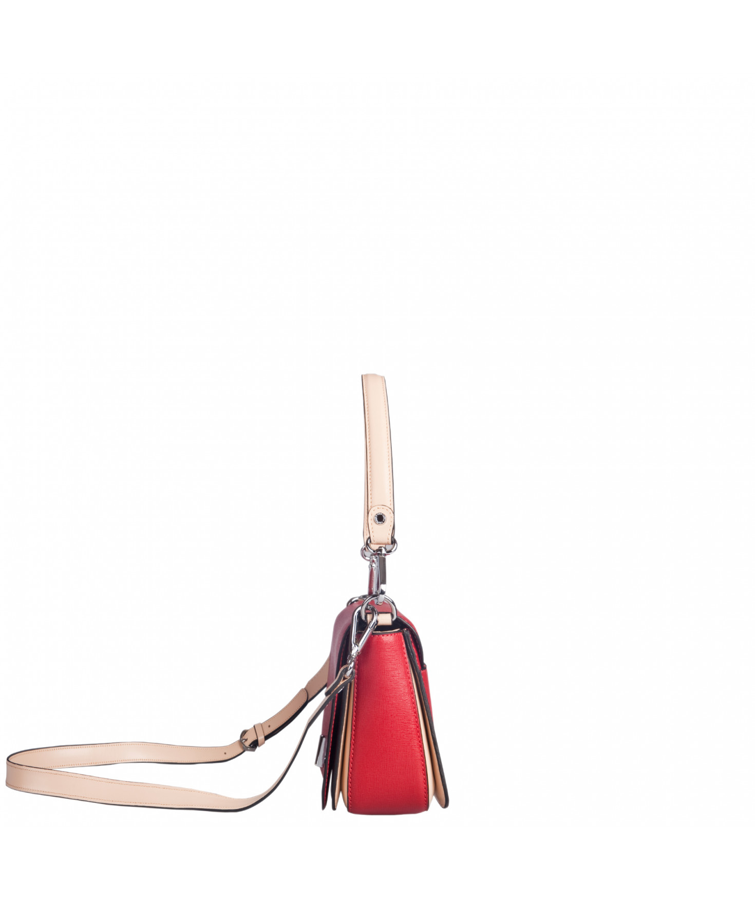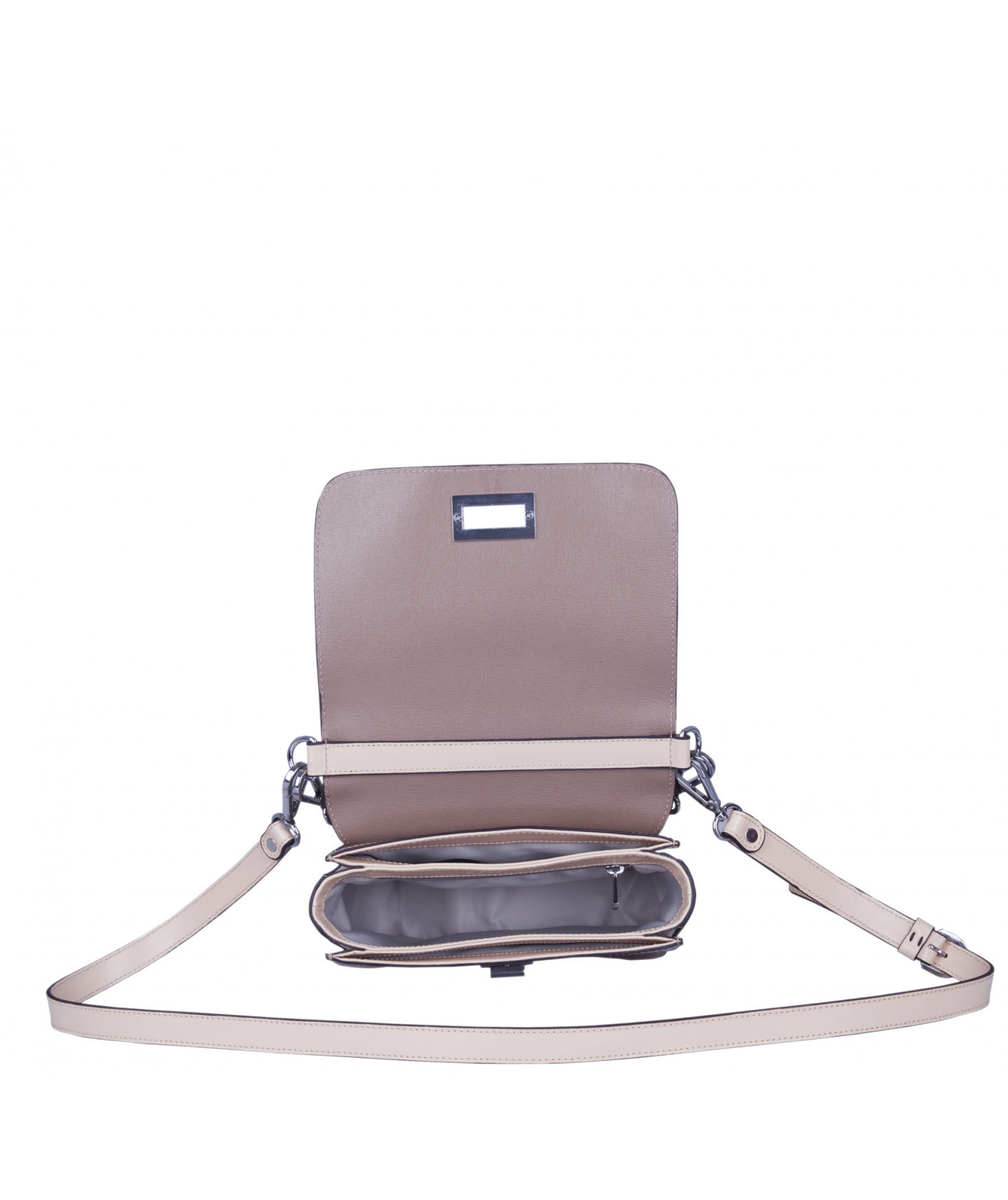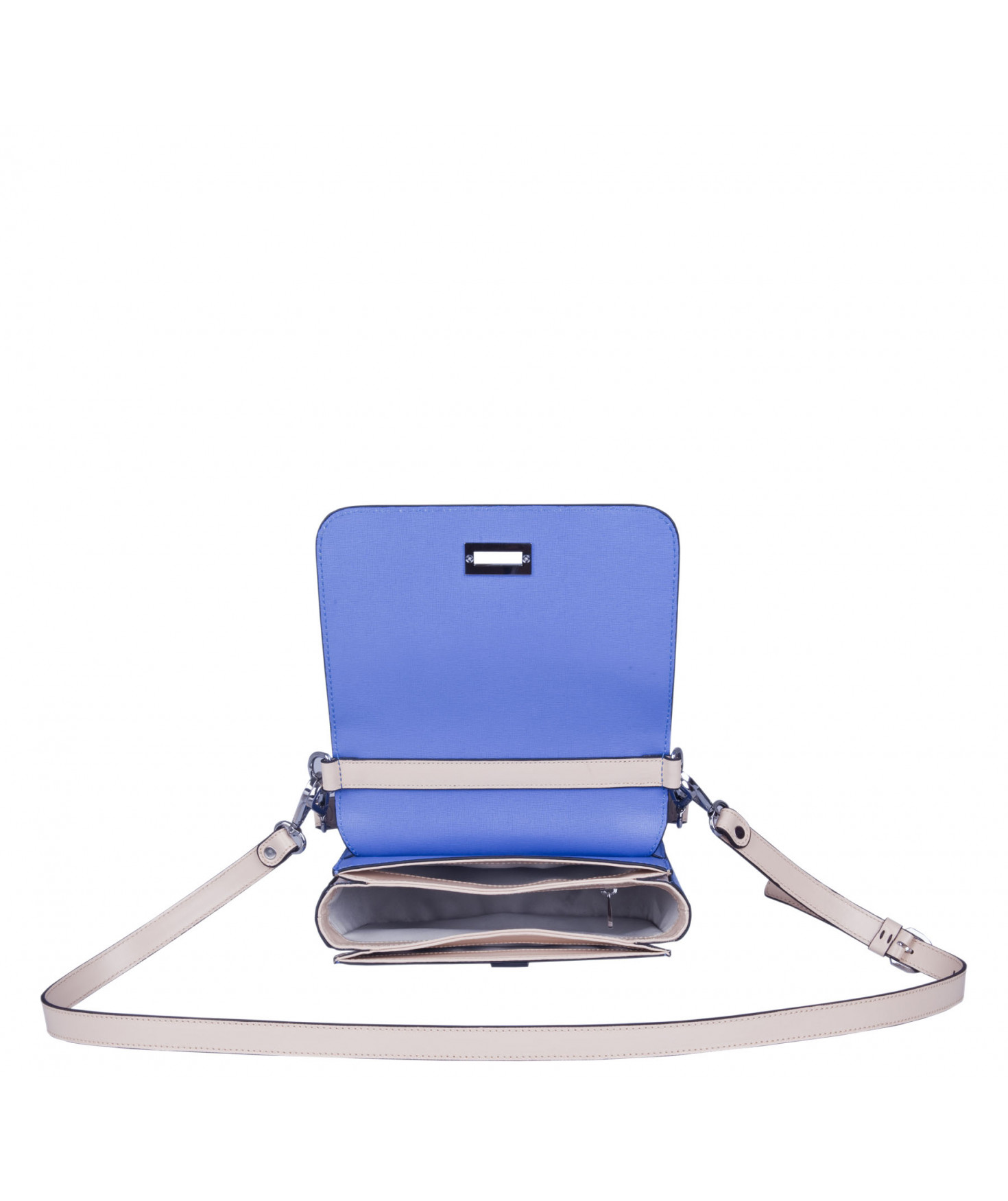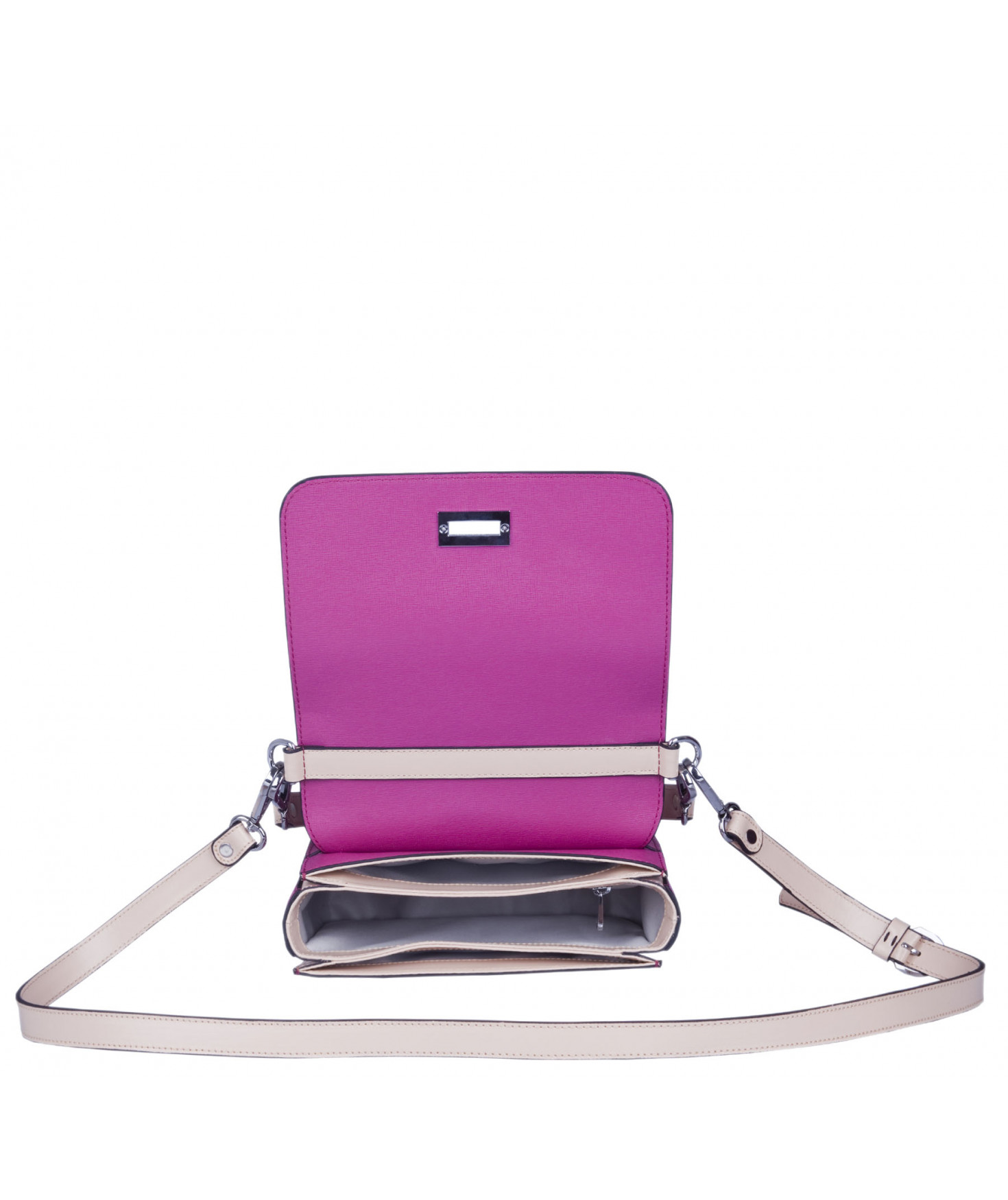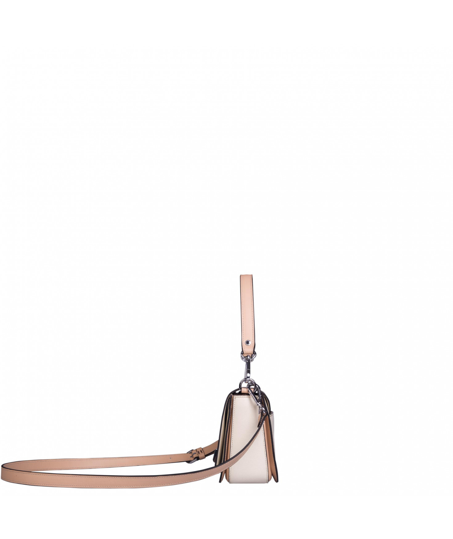 Petit sac à rabat porté main ou croisé grâce à deux bandoulières amovibles de longueurs différentes. La bandoulière la plus longue est réglable.Trois compartiments intérieurs. Une poche intérieure zippée. Poche extérieure à pression aimantée sur l'arrière. Bijouterie en métal finition argentée.