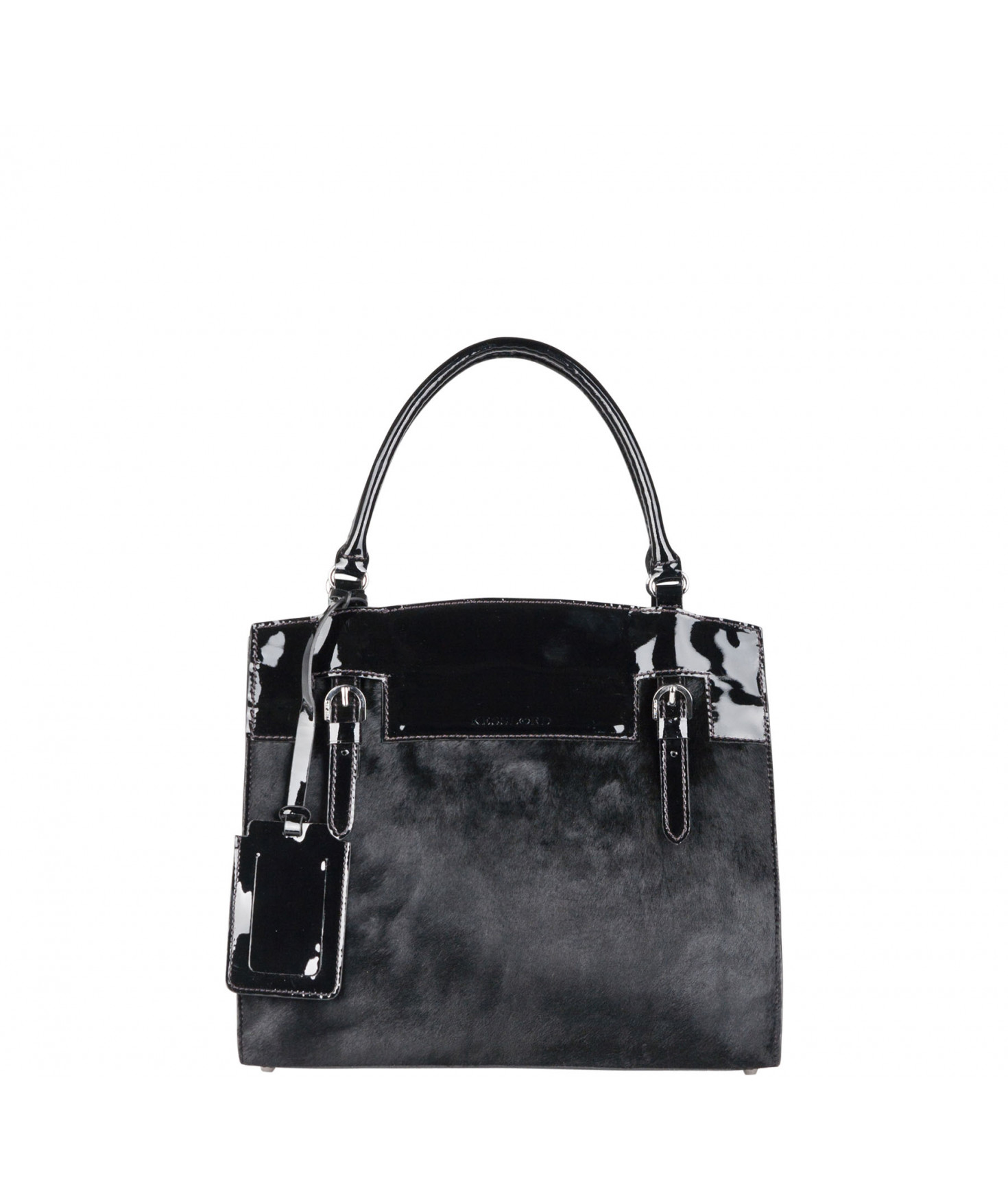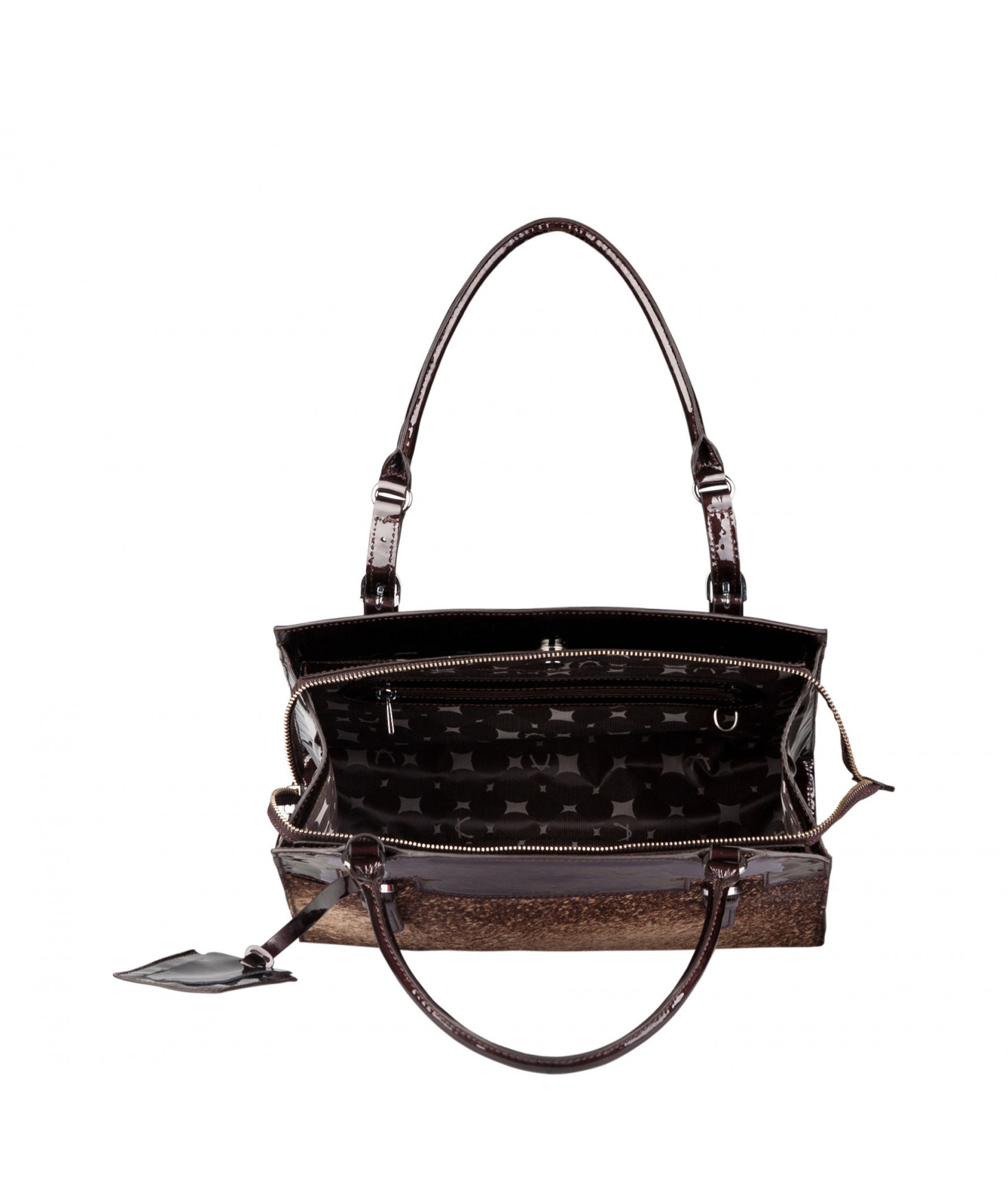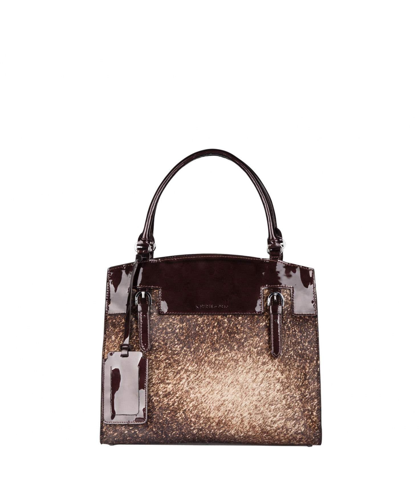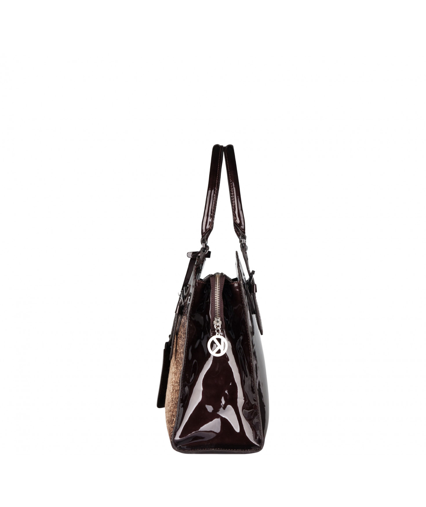 Sac porté main, en cuir glacé et cuir façon poulain, anses réglables, 2 compartiments extérieurs à fermoirs aimantés.