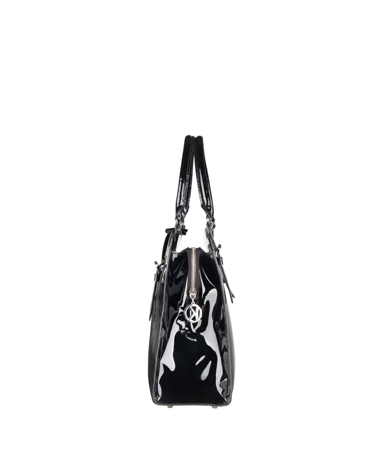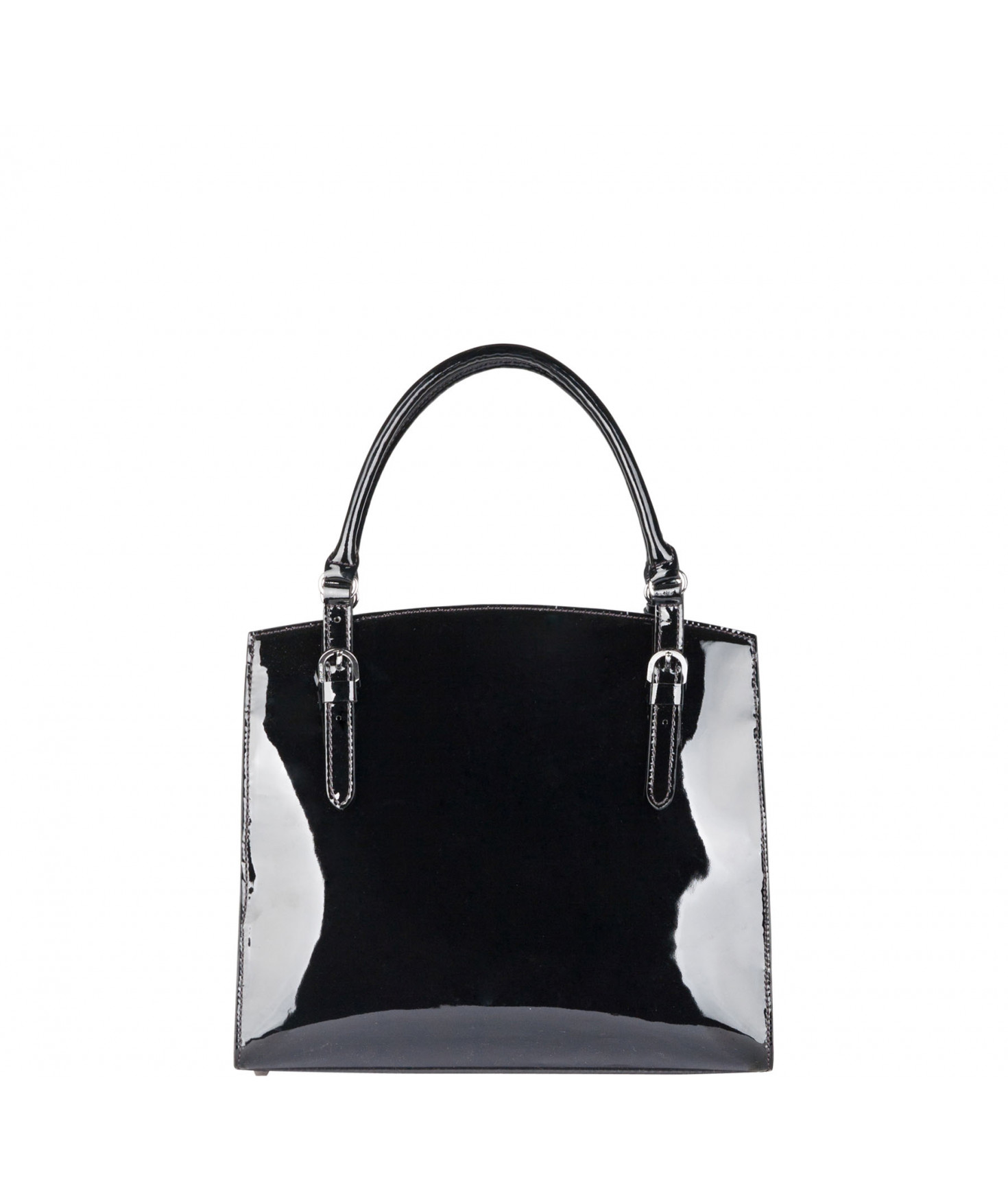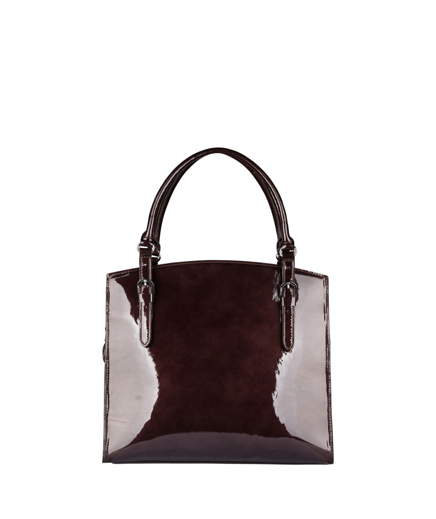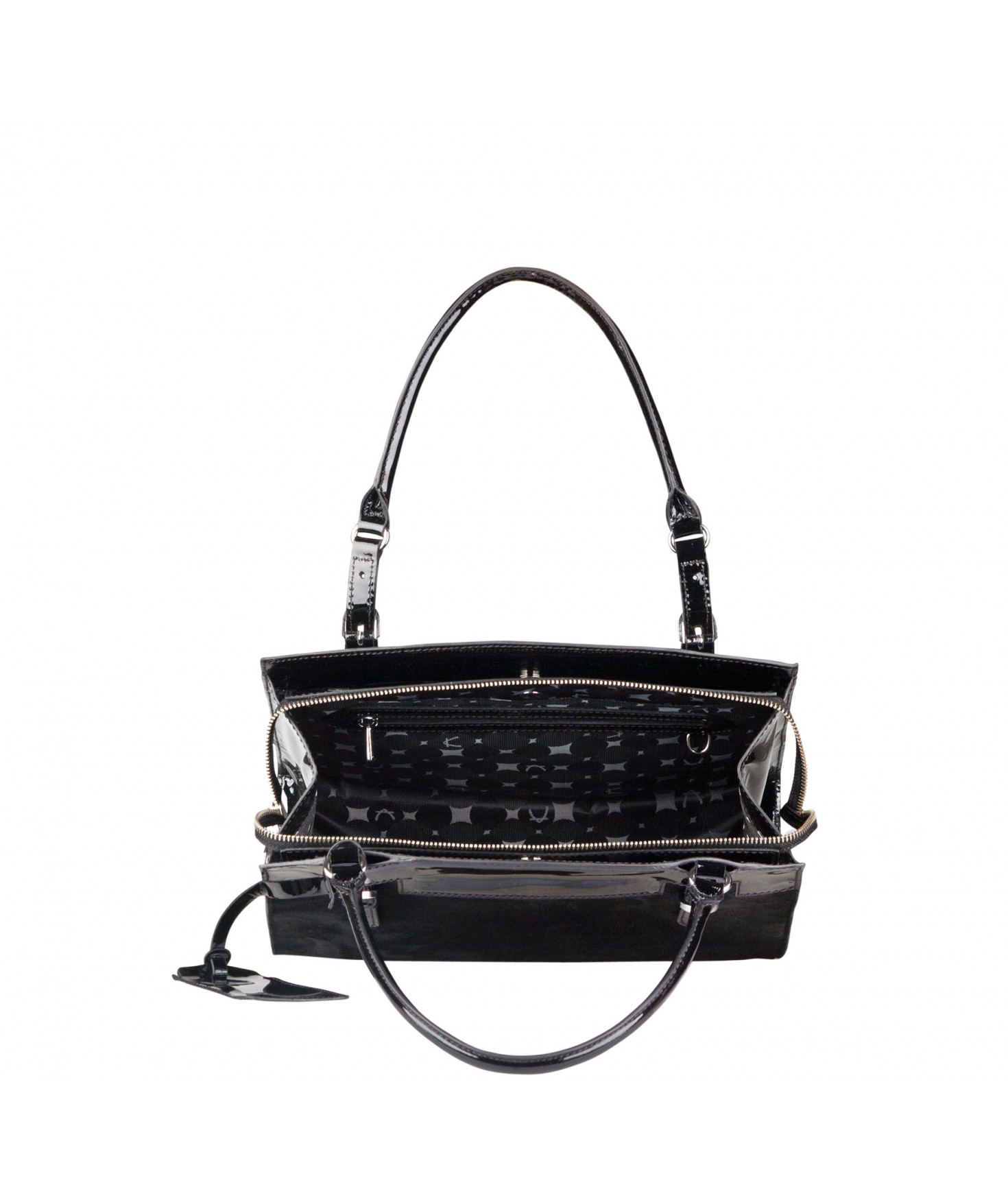 Sac porté main, en cuir glacé et cuir façon poulain, anses réglables, 2 compartiments extérieurs à fermoirs aimantés.