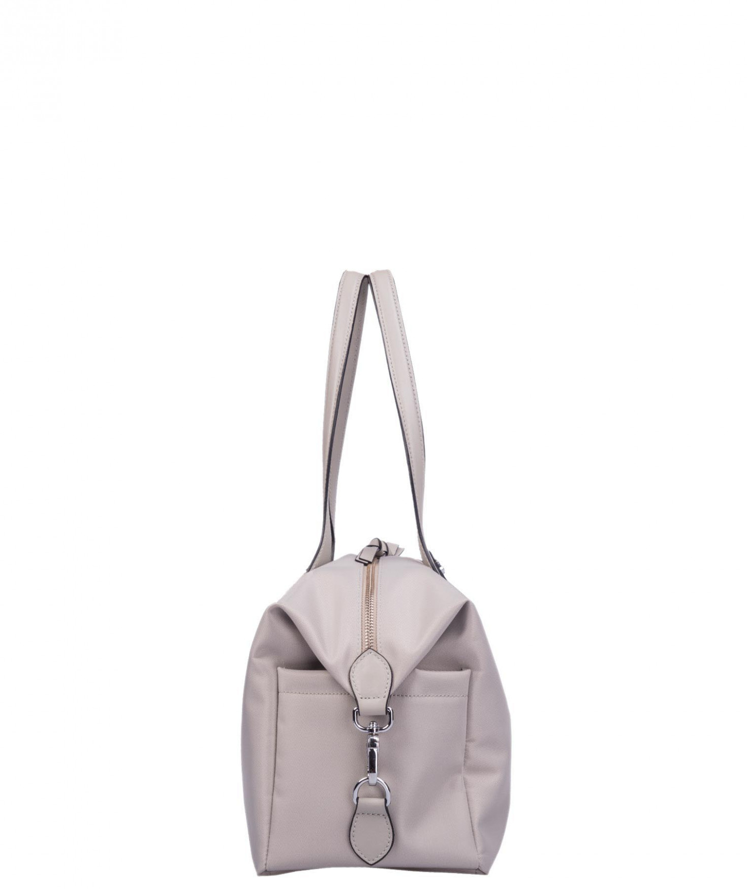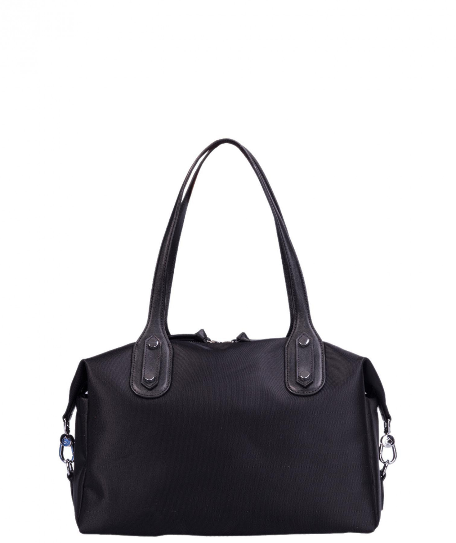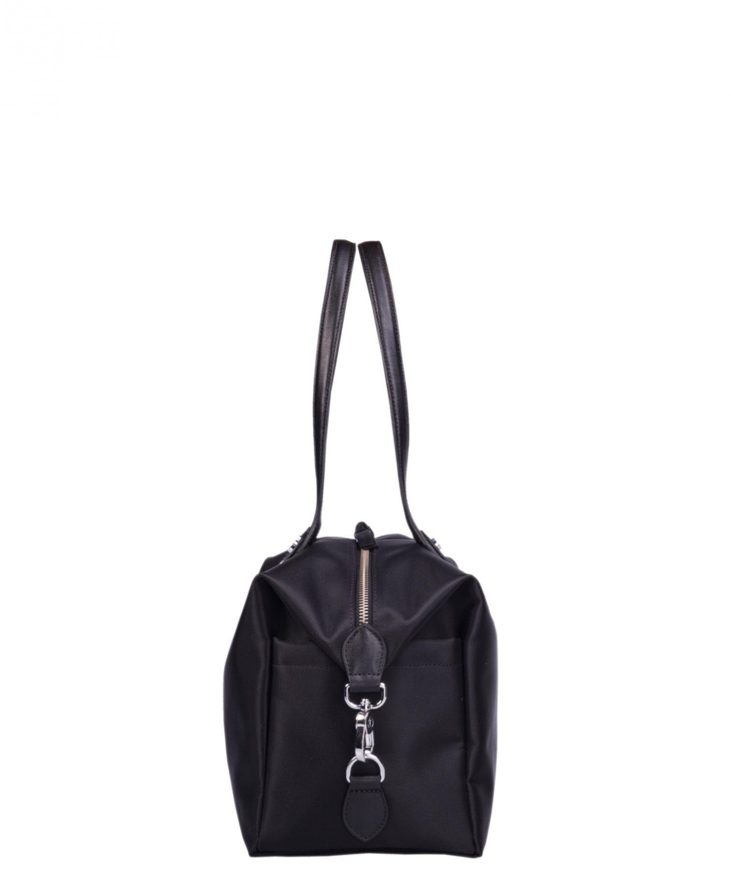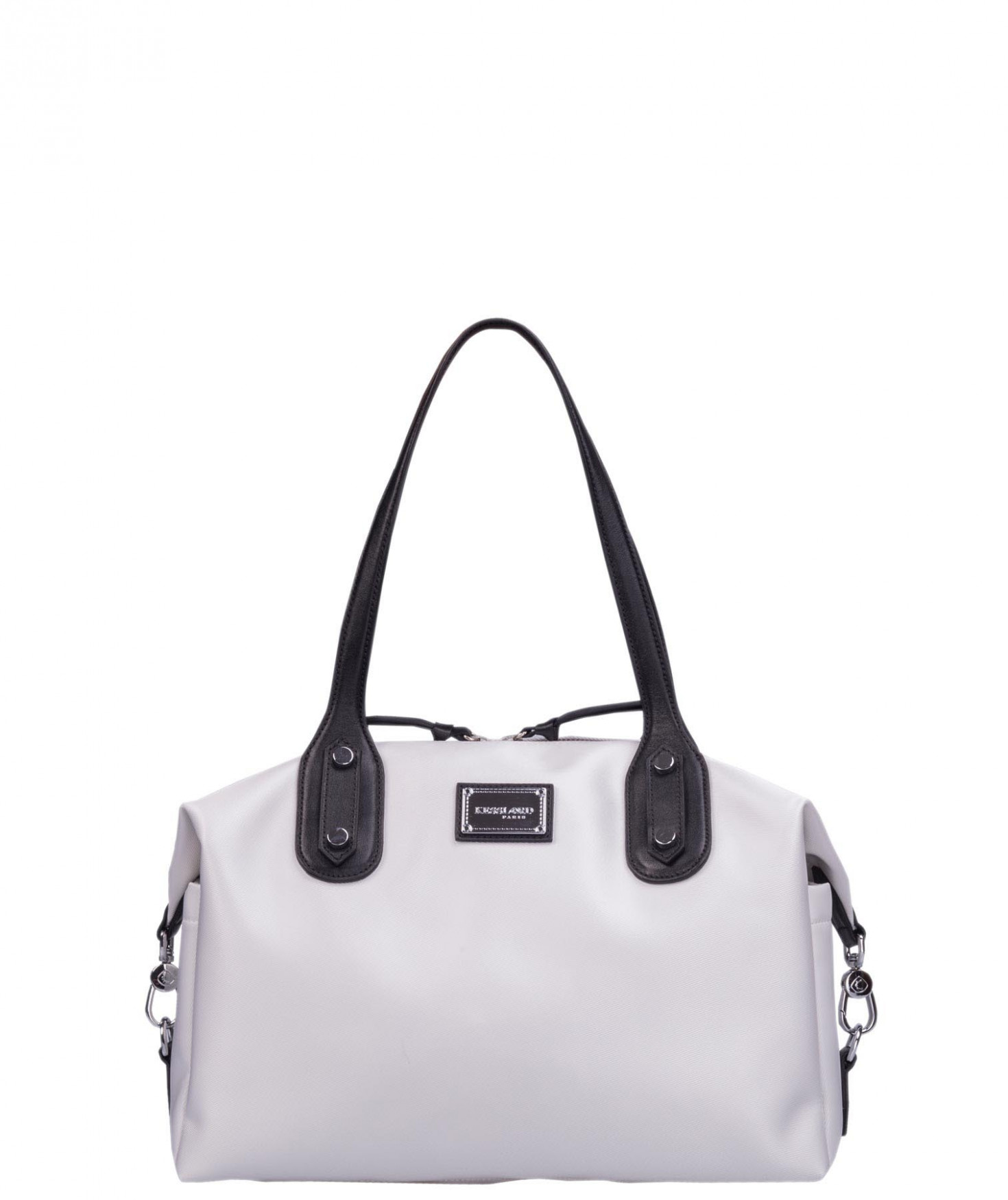 Sac shopping porté main ou épaule court. Fermeture par zip. 2 poches latérales extérieures plaquées. 2 mousquetons latéraux ferment le sac. 1 poche intérieure zippée et 2 poches intérieures plaquées. Bijouterie en métal finition argentée.