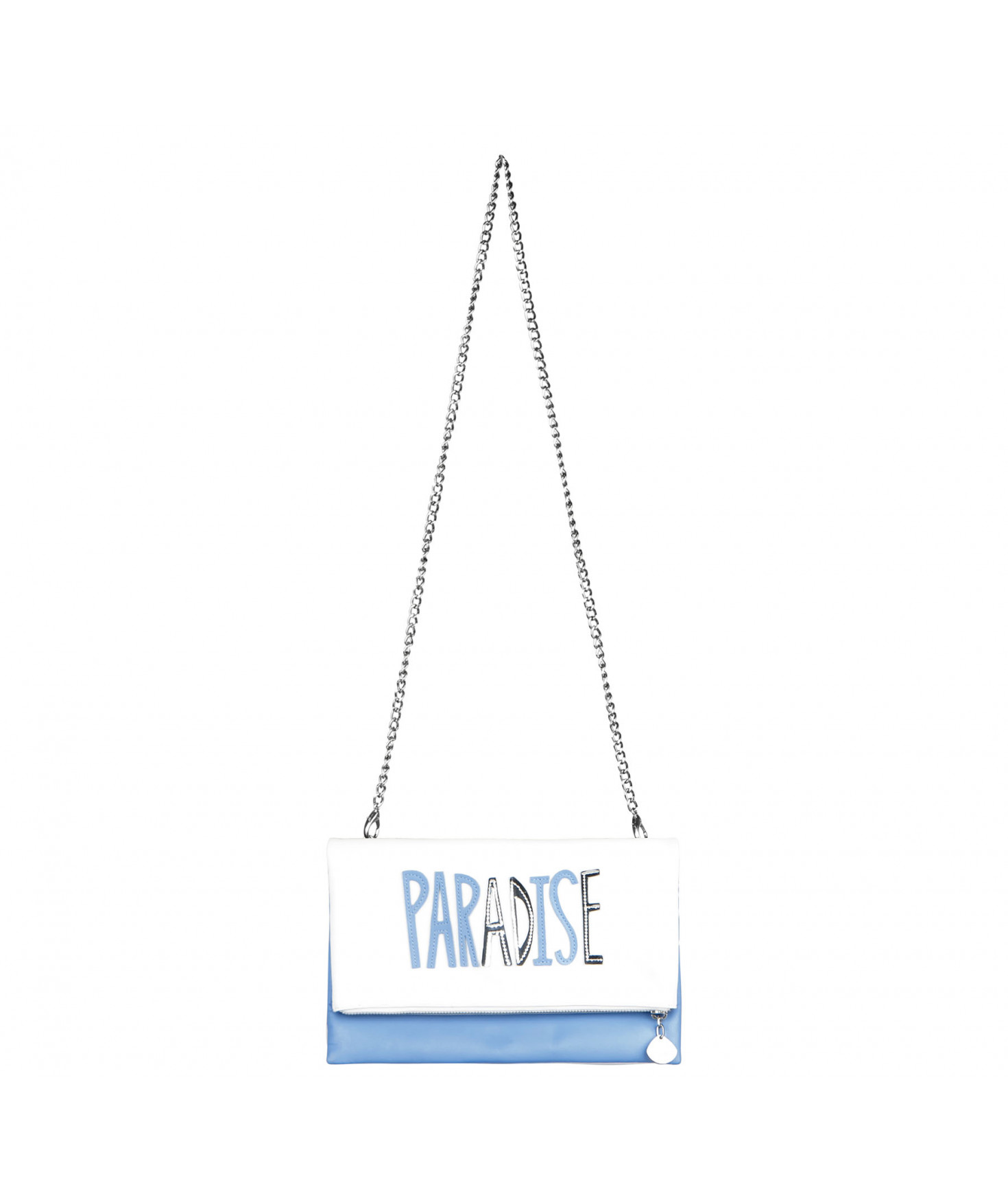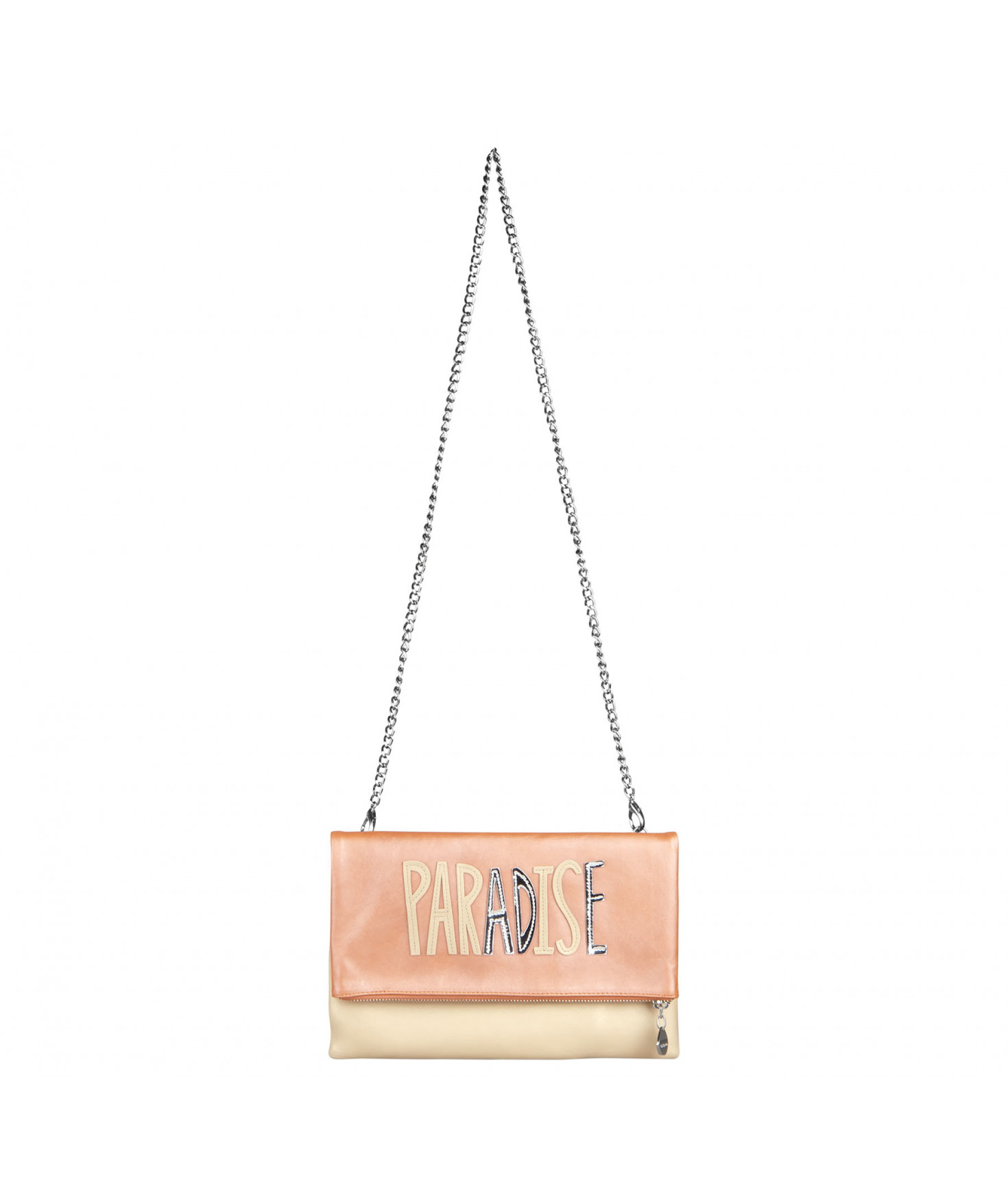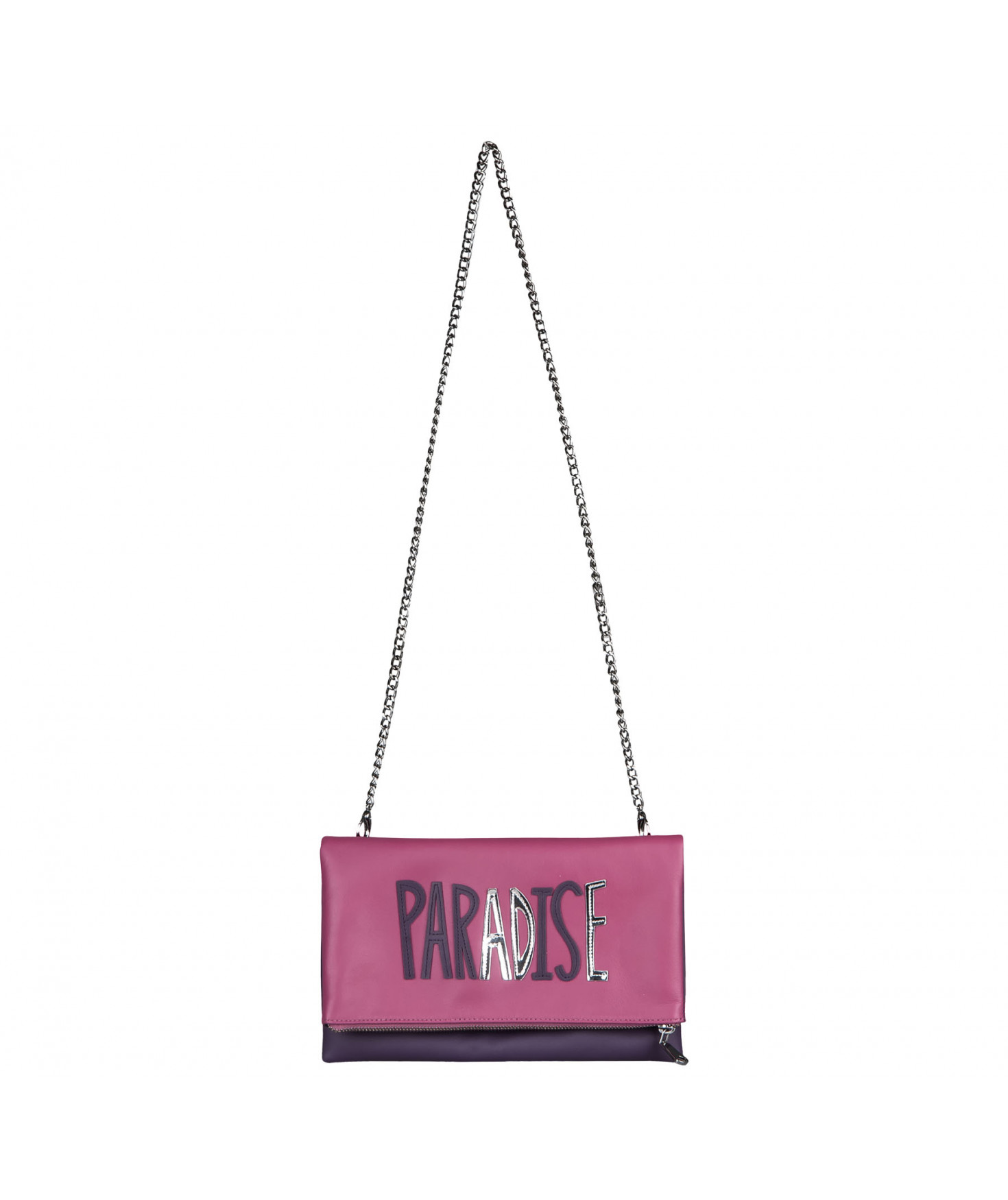 Pochette zippée qui se plie. Deux poches intérieures plaquées. Chaîne amovible. Bijouterie en métal finition argentée.