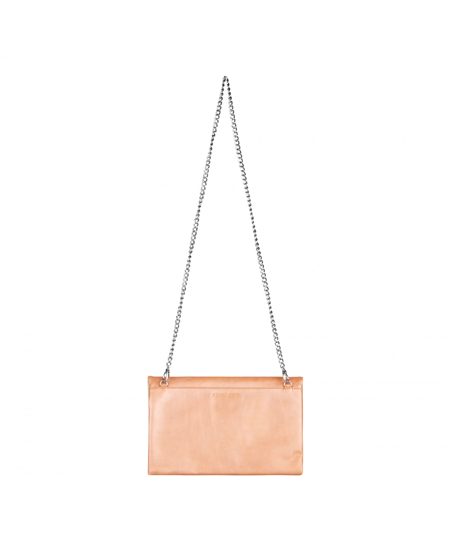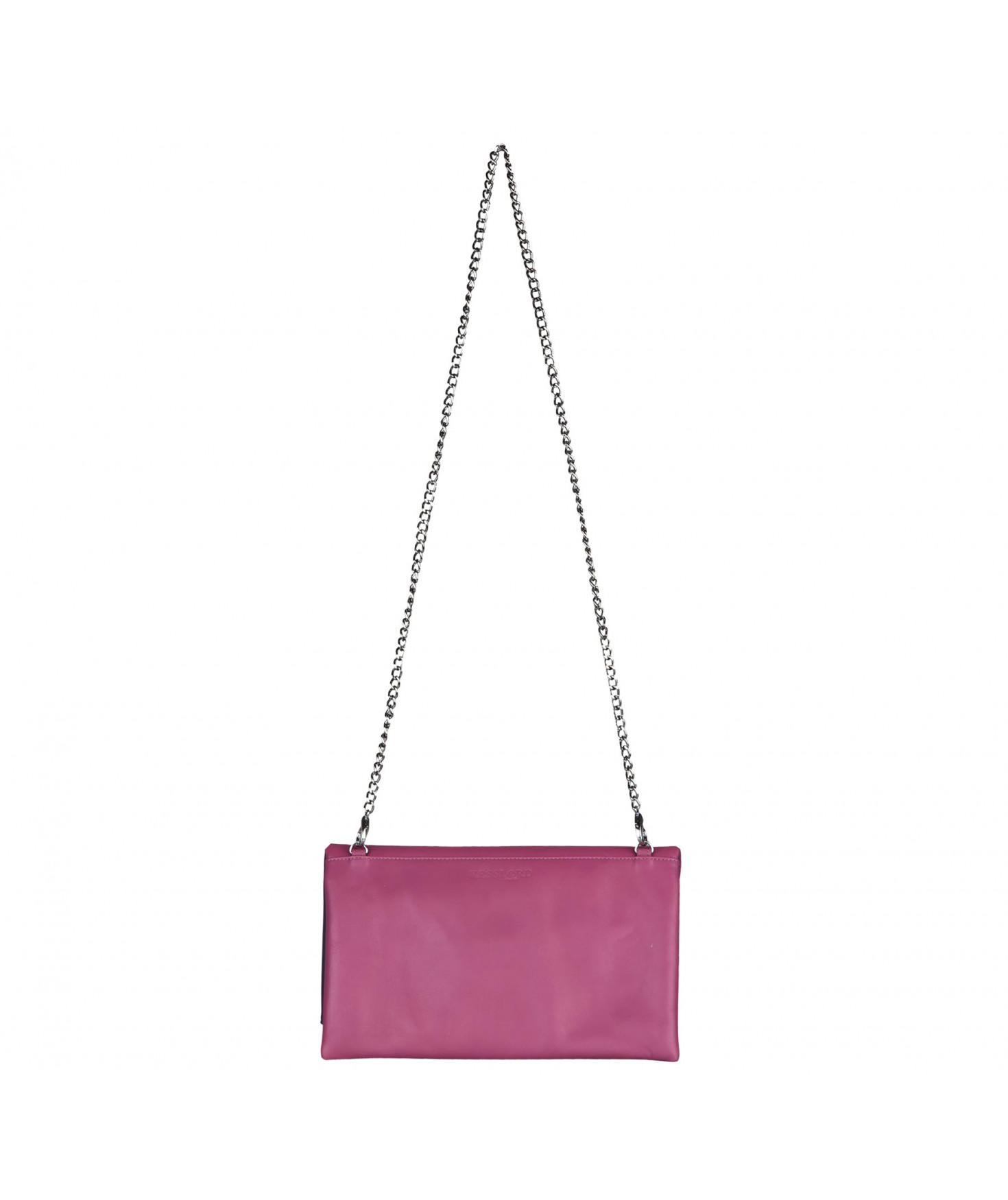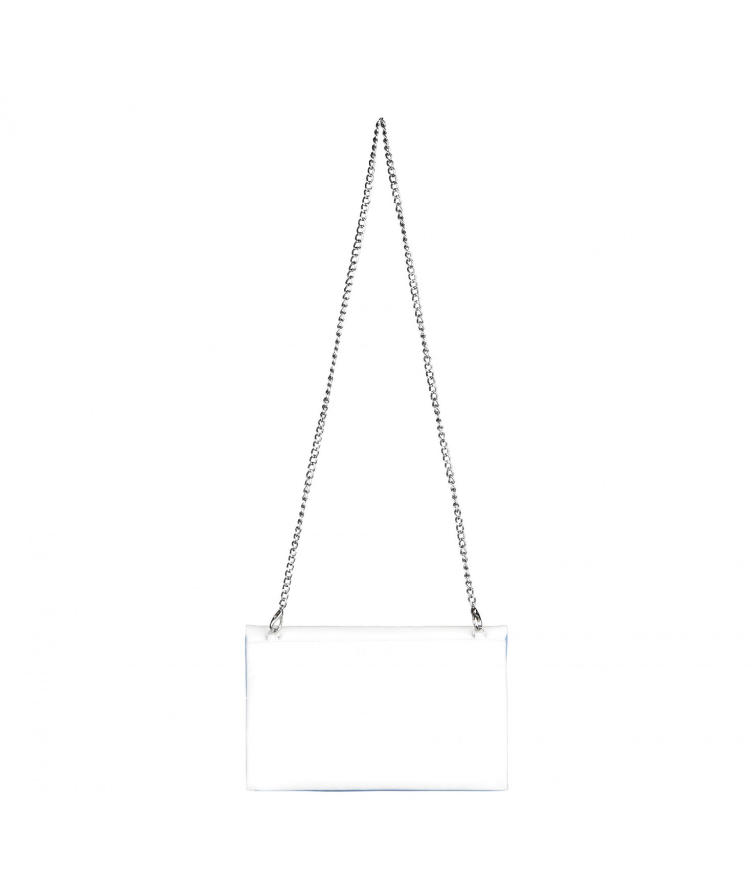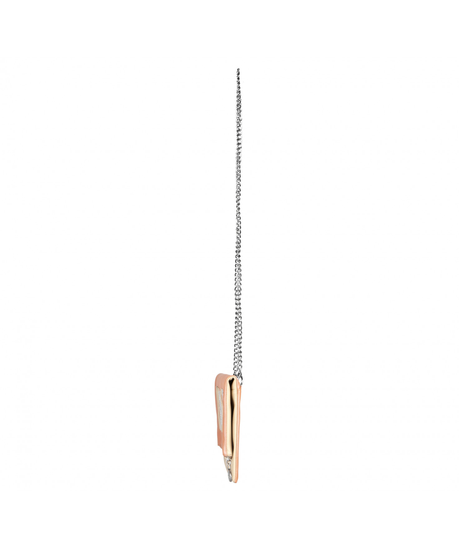 Pochette zippée qui se plie. Deux poches intérieures plaquées. Chaîne amovible. Bijouterie en métal finition argentée.