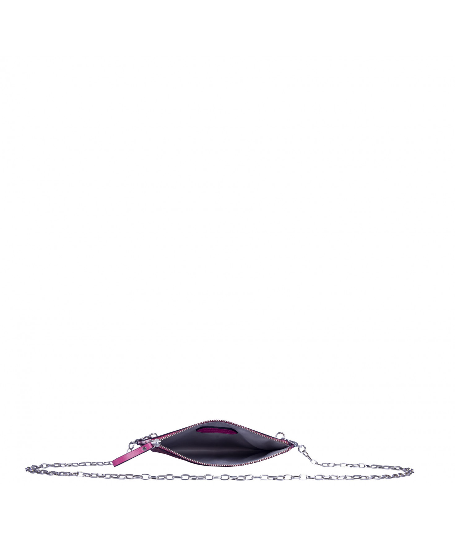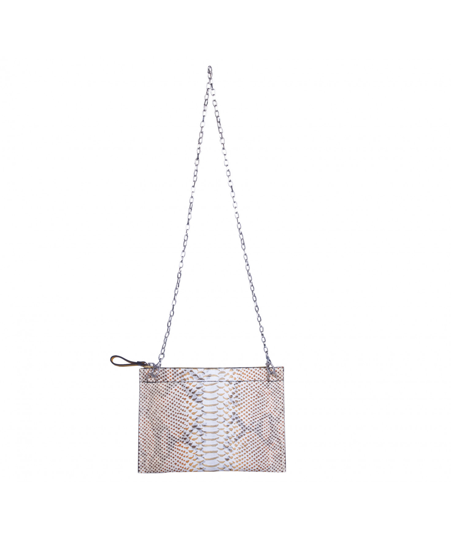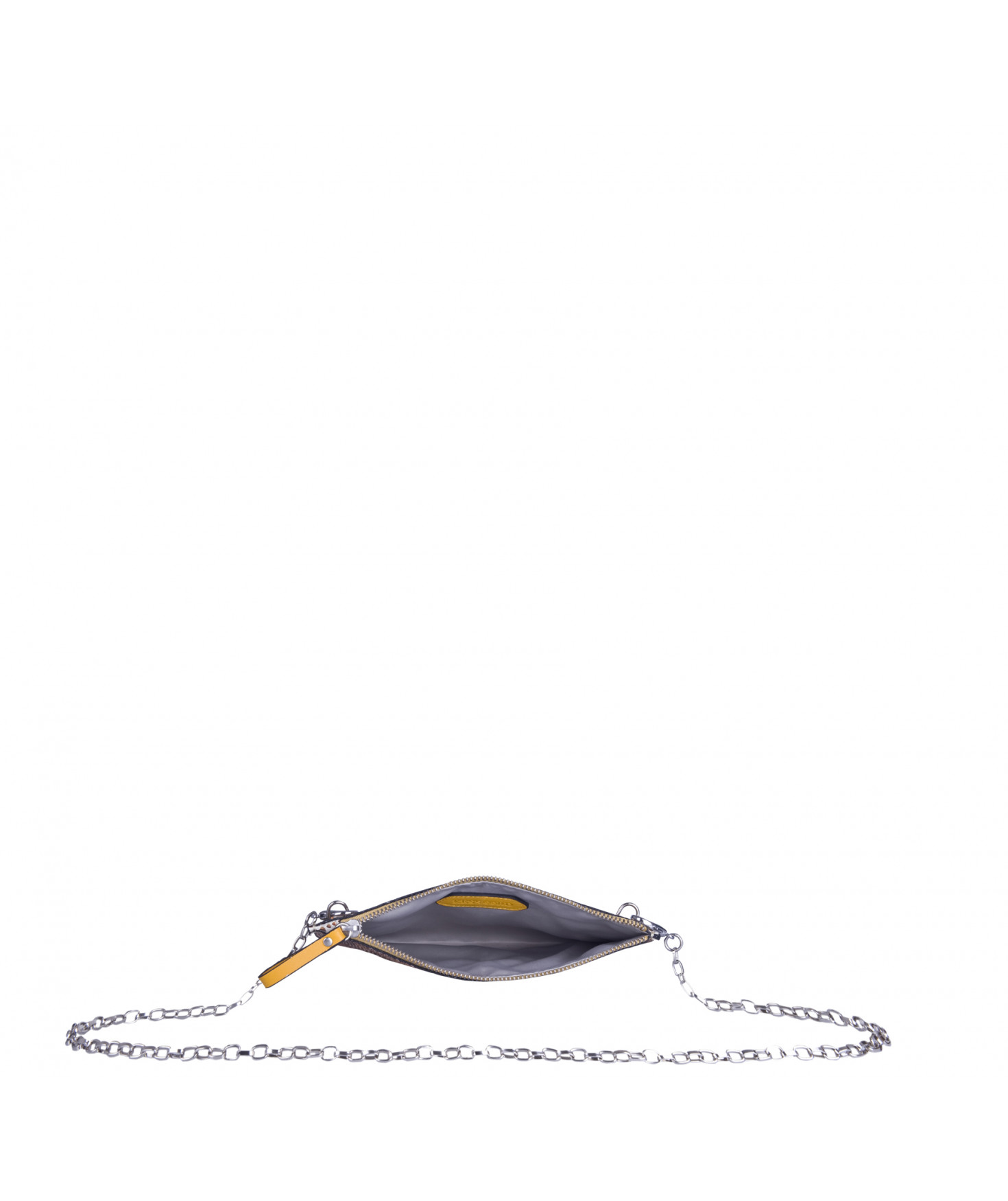 Pochette plate, fermeture par zip. Porté main ou croisé grâce à une chaîne amovible.