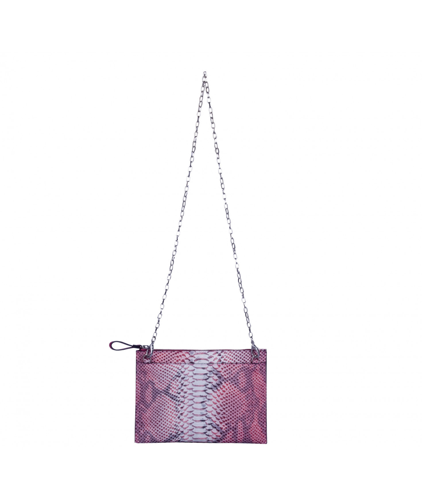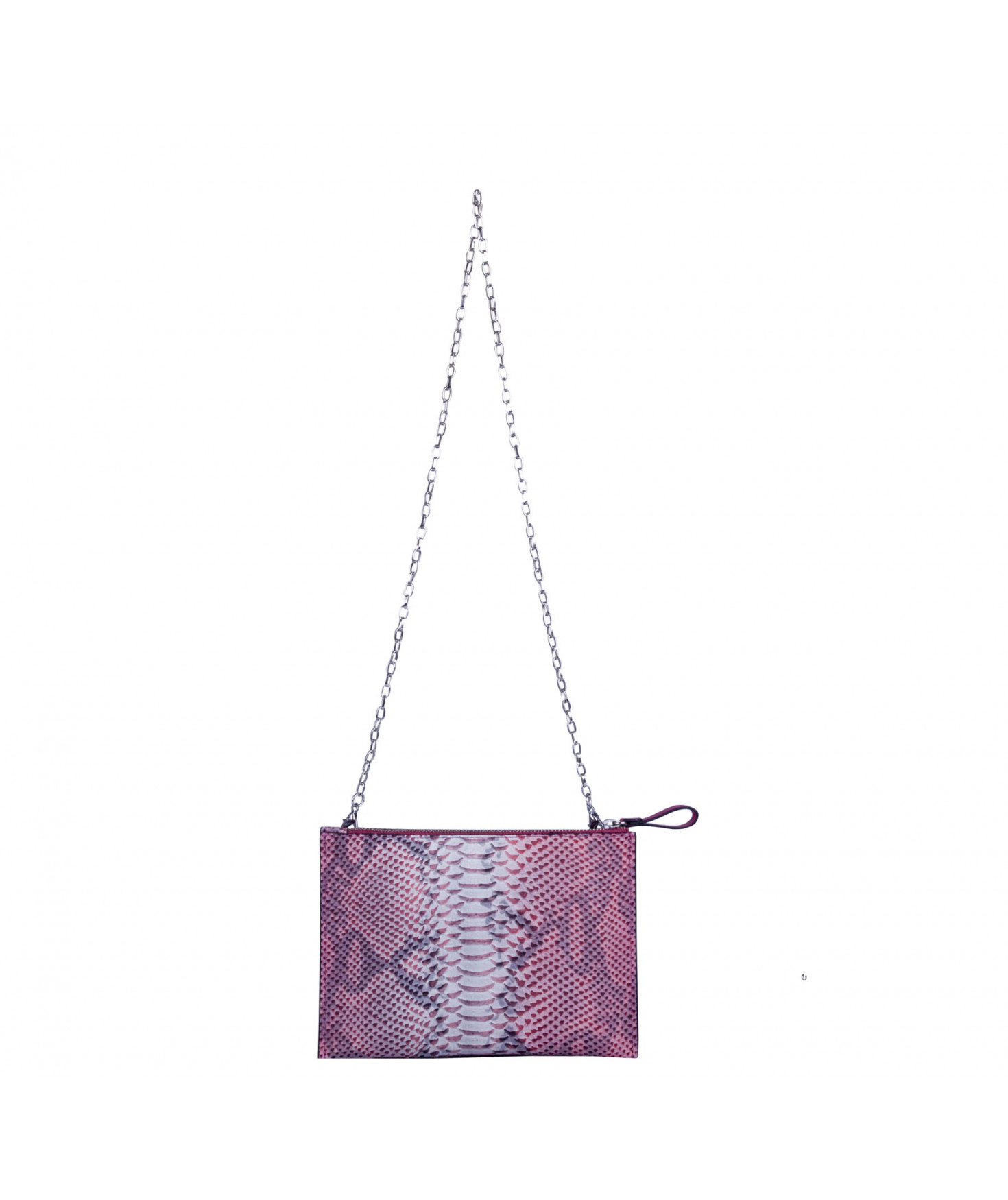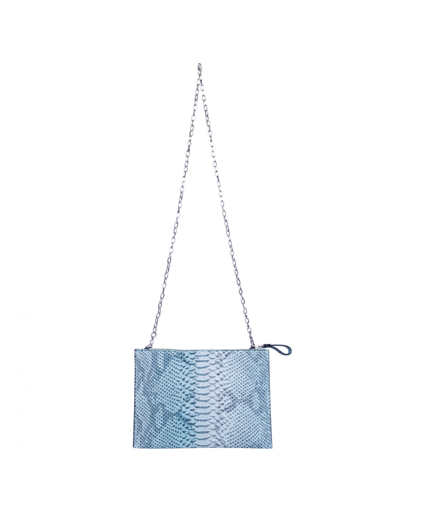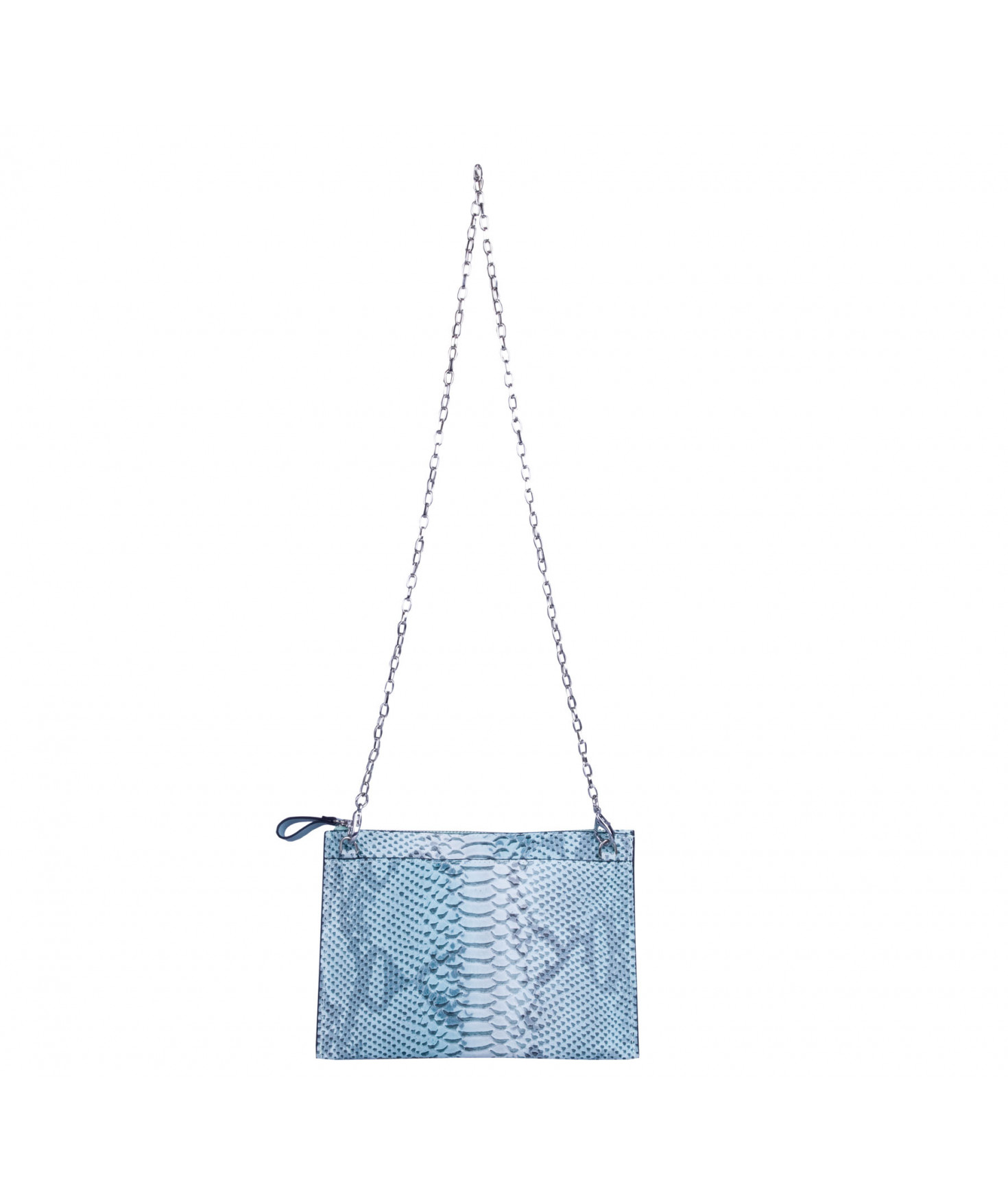 Pochette plate, fermeture par zip. Porté main ou croisé grâce à une chaîne amovible.