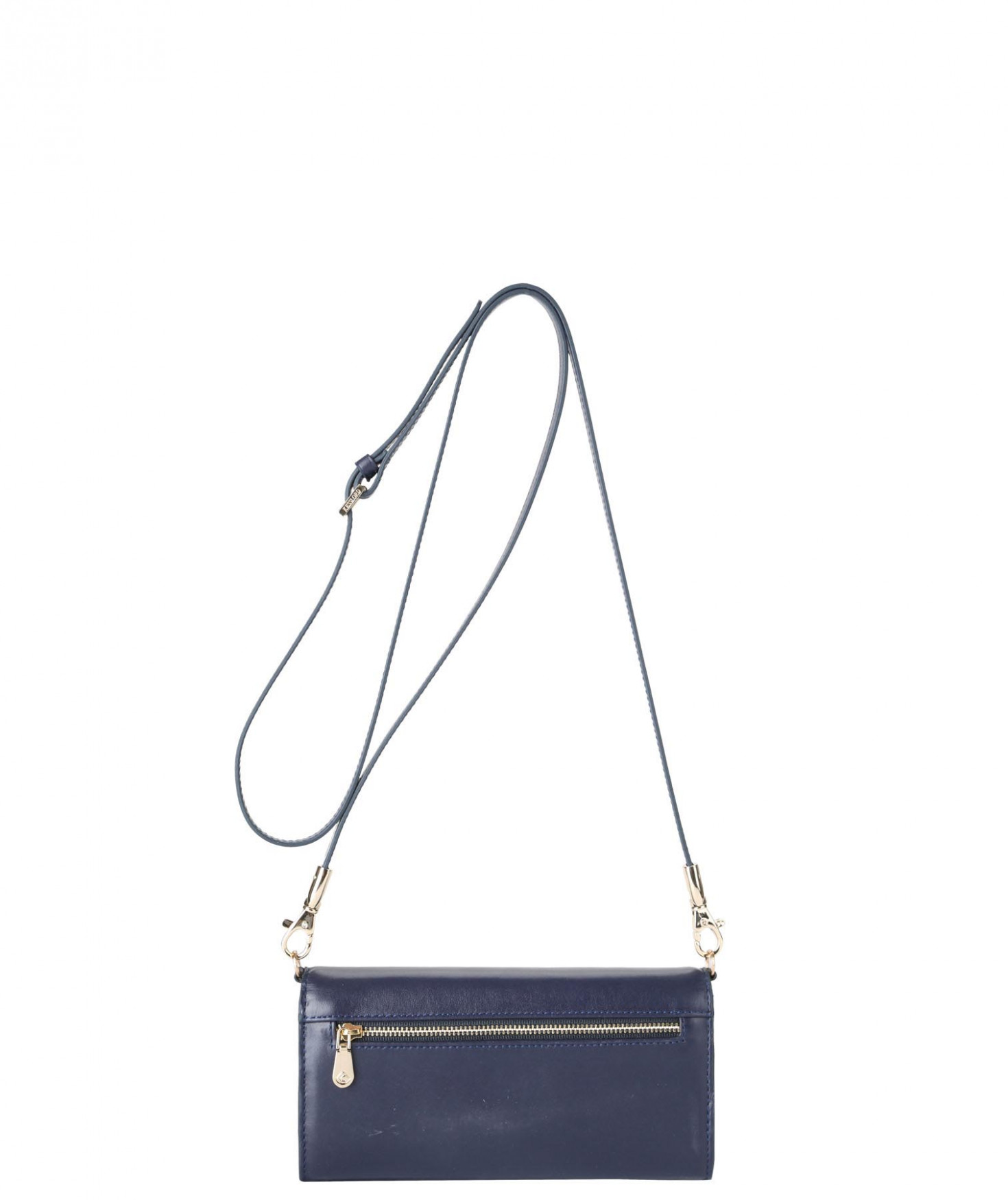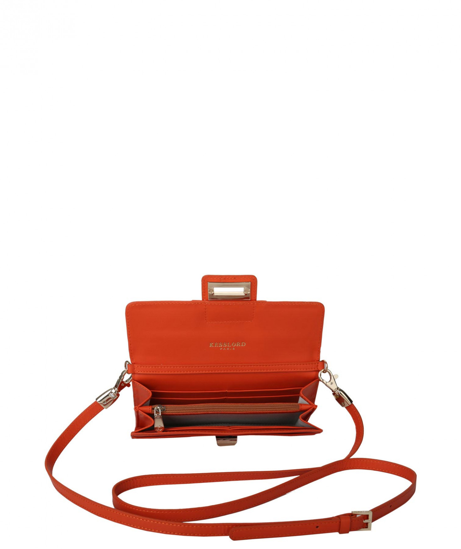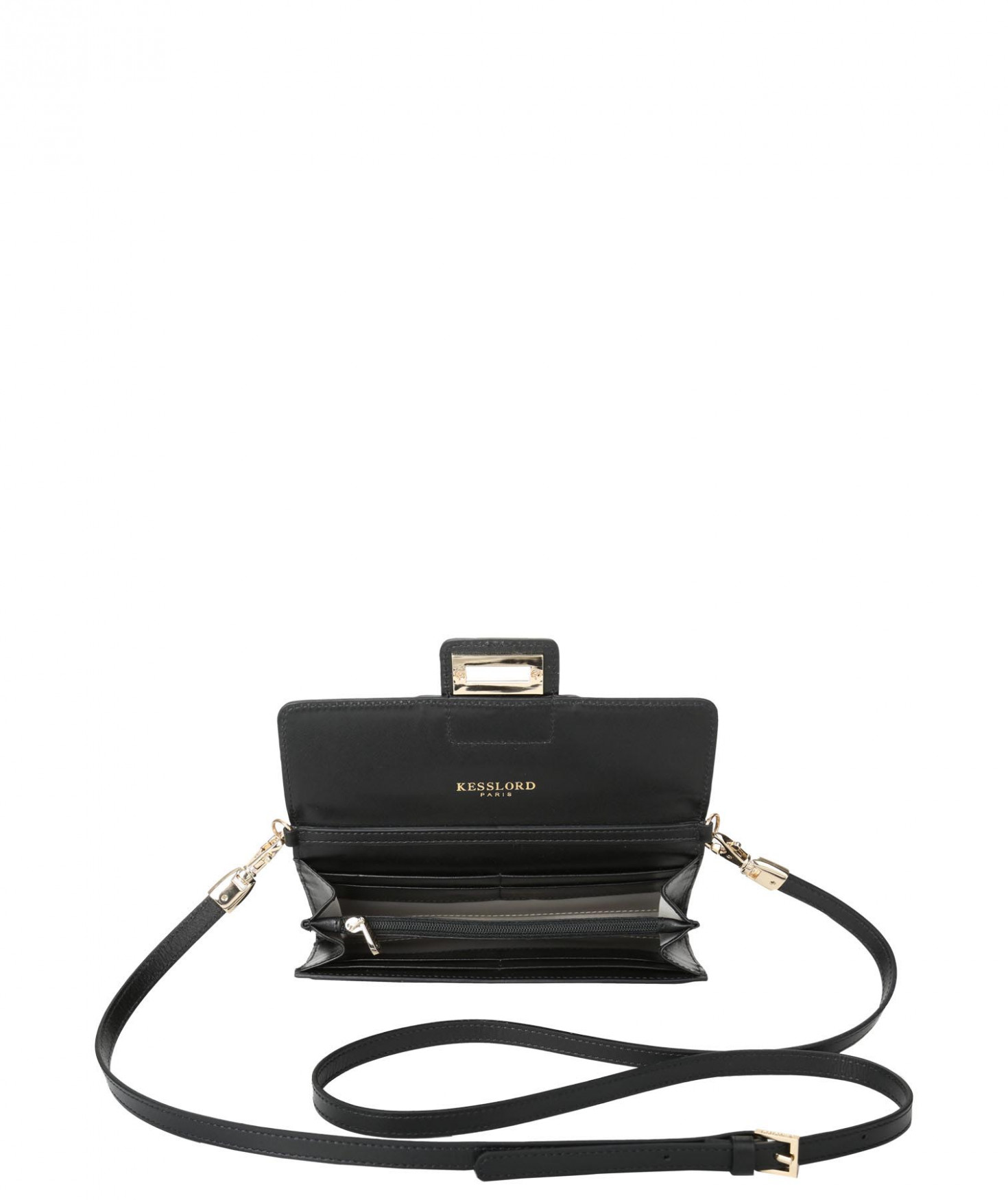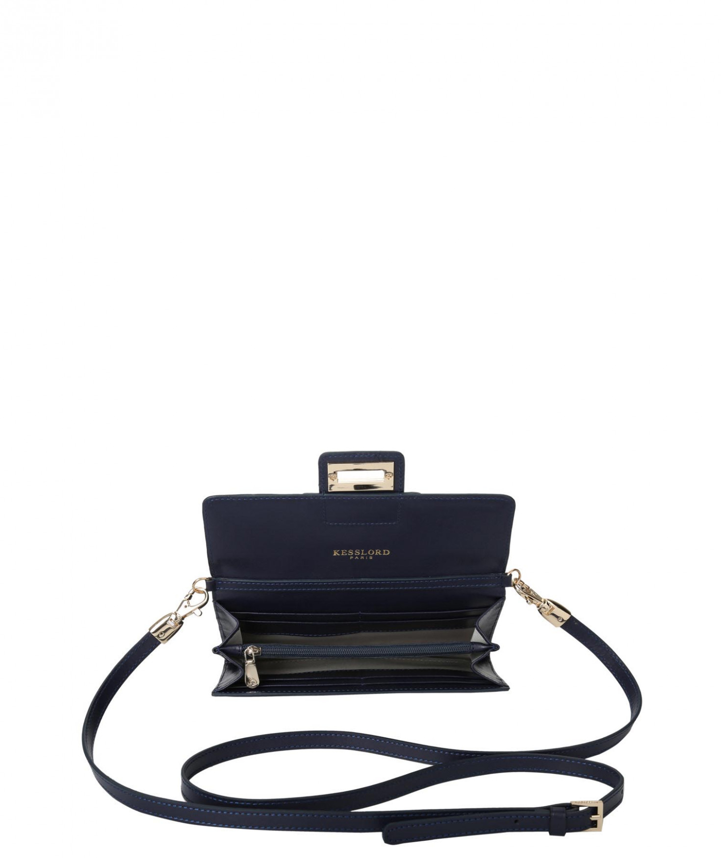 Pochette dotée d'une bandoulière réglable et amovible. Fermeture par un rabat à fermoir. Sous le rabat, des emplacements pour les cartes. A l'intérieur, trois compartiments dont un zippé, de nombreux emplacements pour les cartes. Une poche zippée derrière. Bijouterie finition dorée.