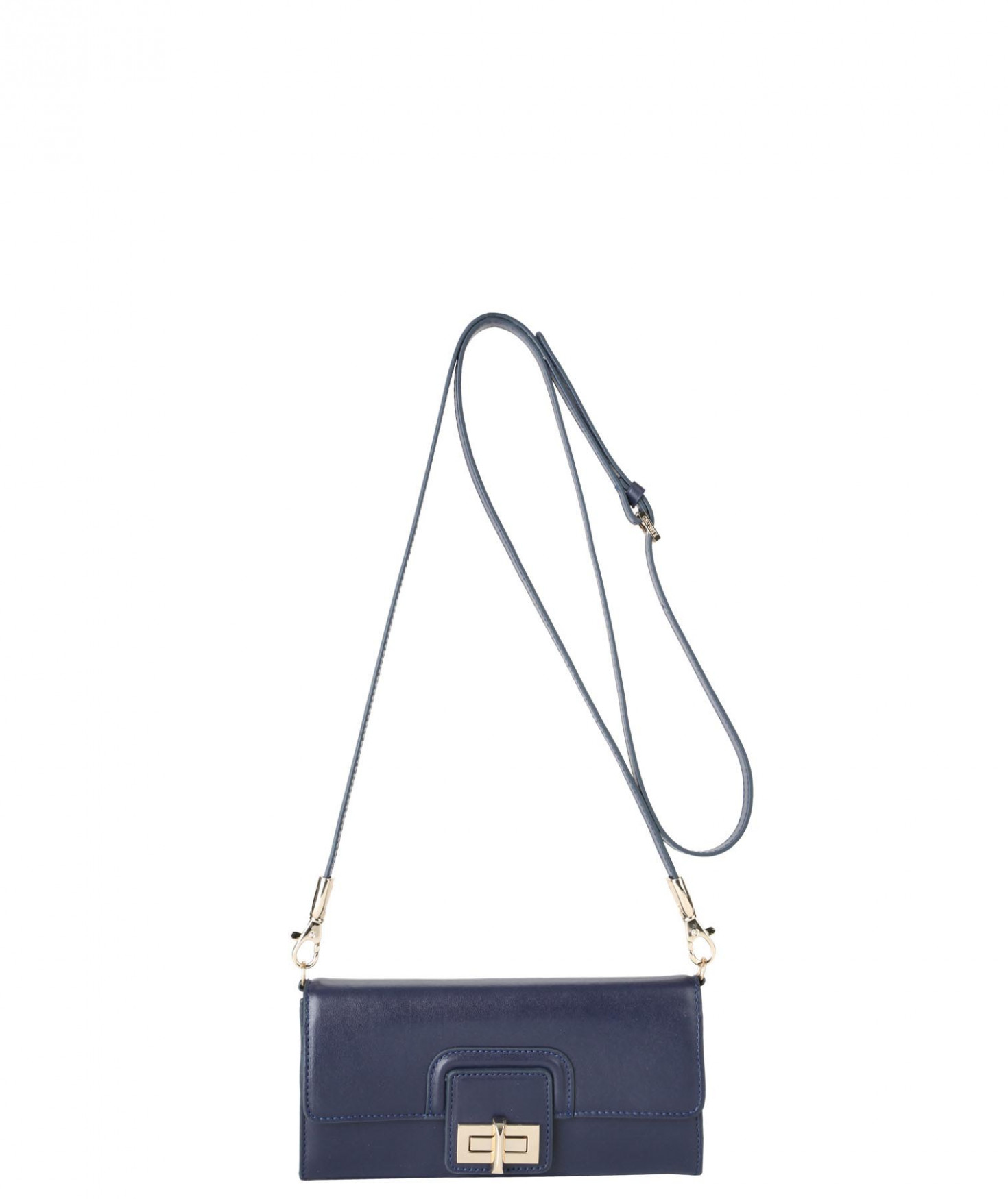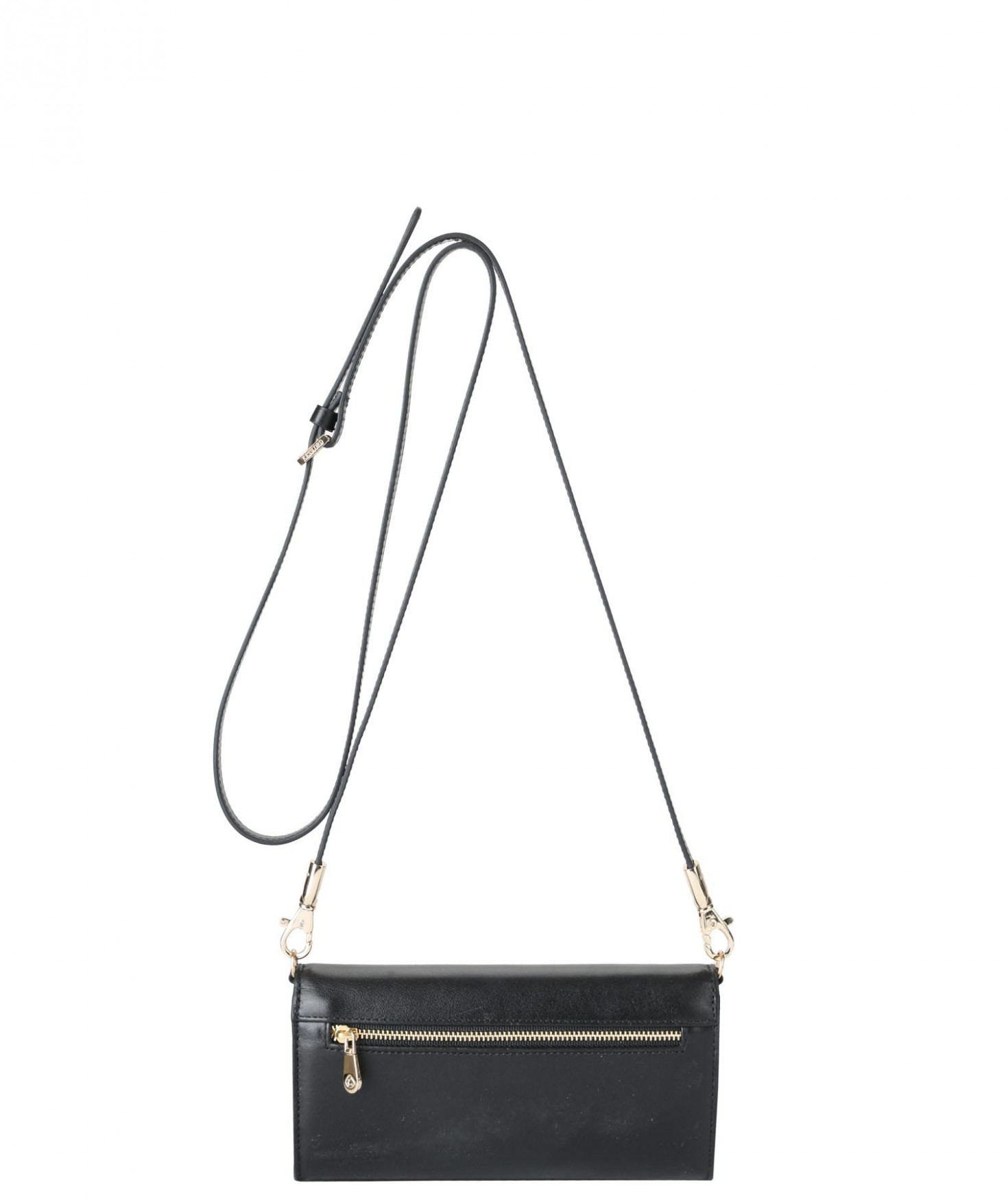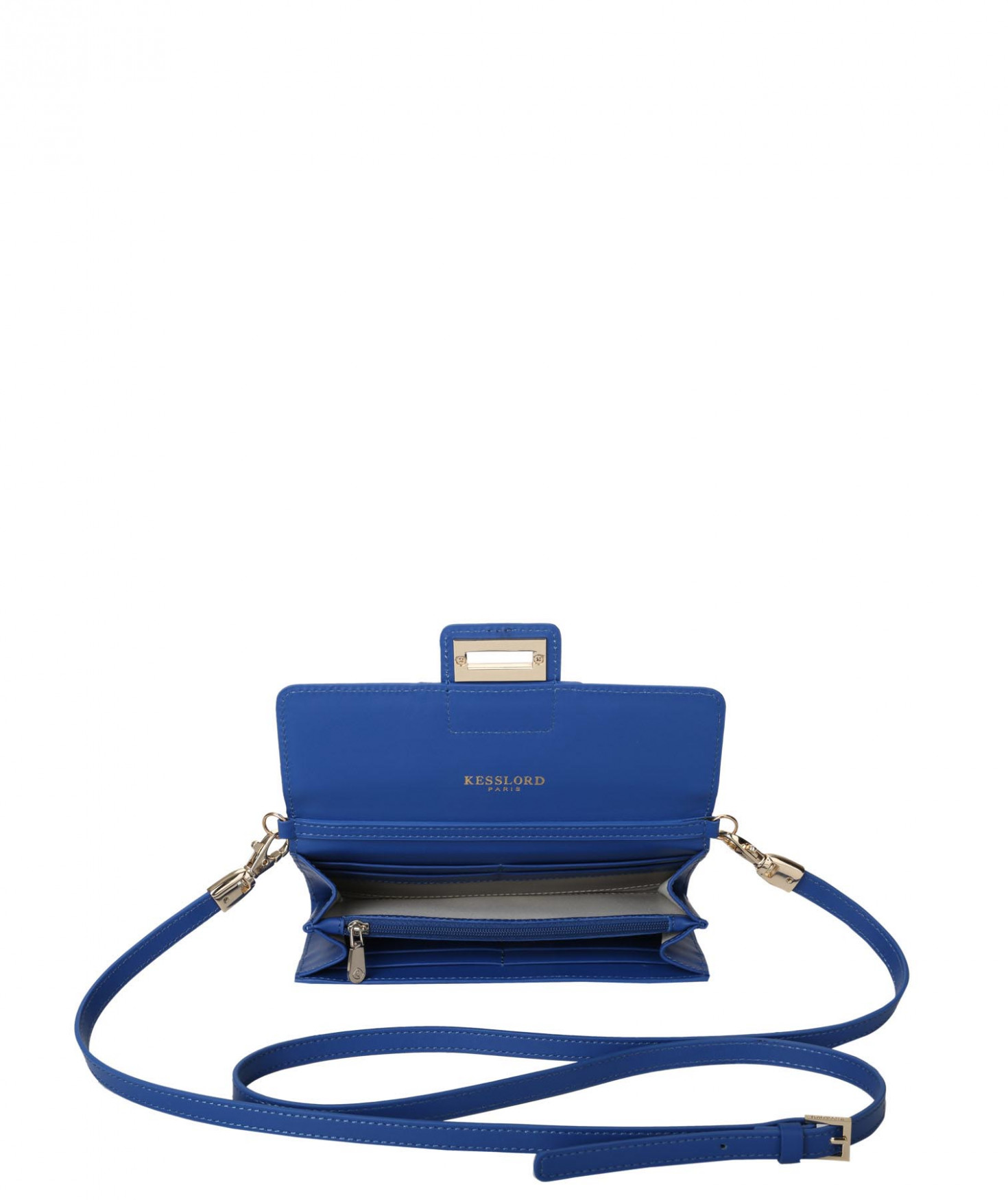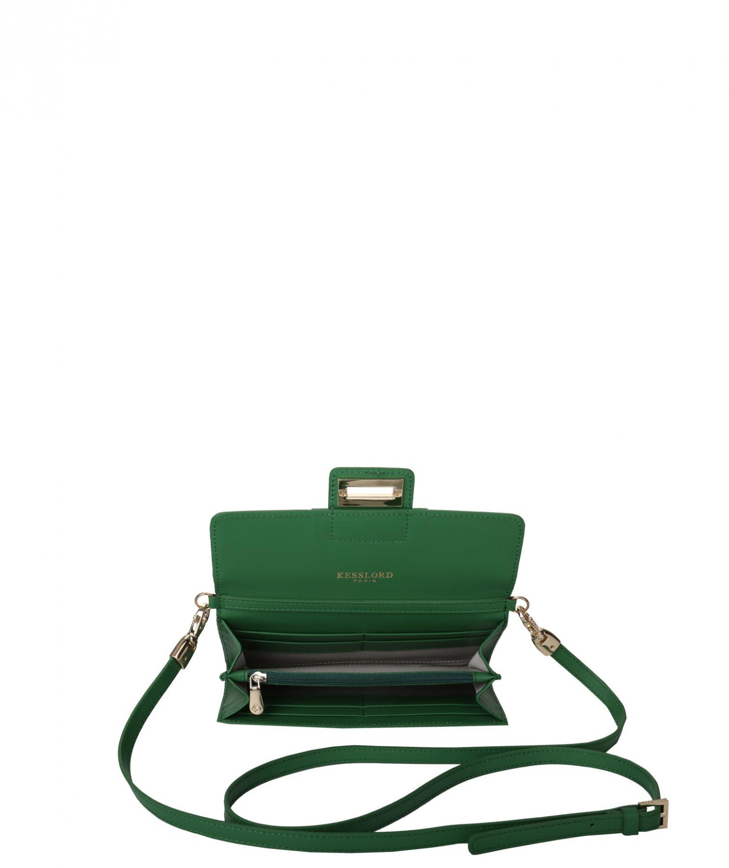 Pochette dotée d'une bandoulière réglable et amovible. Fermeture par un rabat à fermoir. Sous le rabat, des emplacements pour les cartes. A l'intérieur, trois compartiments dont un zippé, de nombreux emplacements pour les cartes. Une poche zippée derrière. Bijouterie finition dorée.