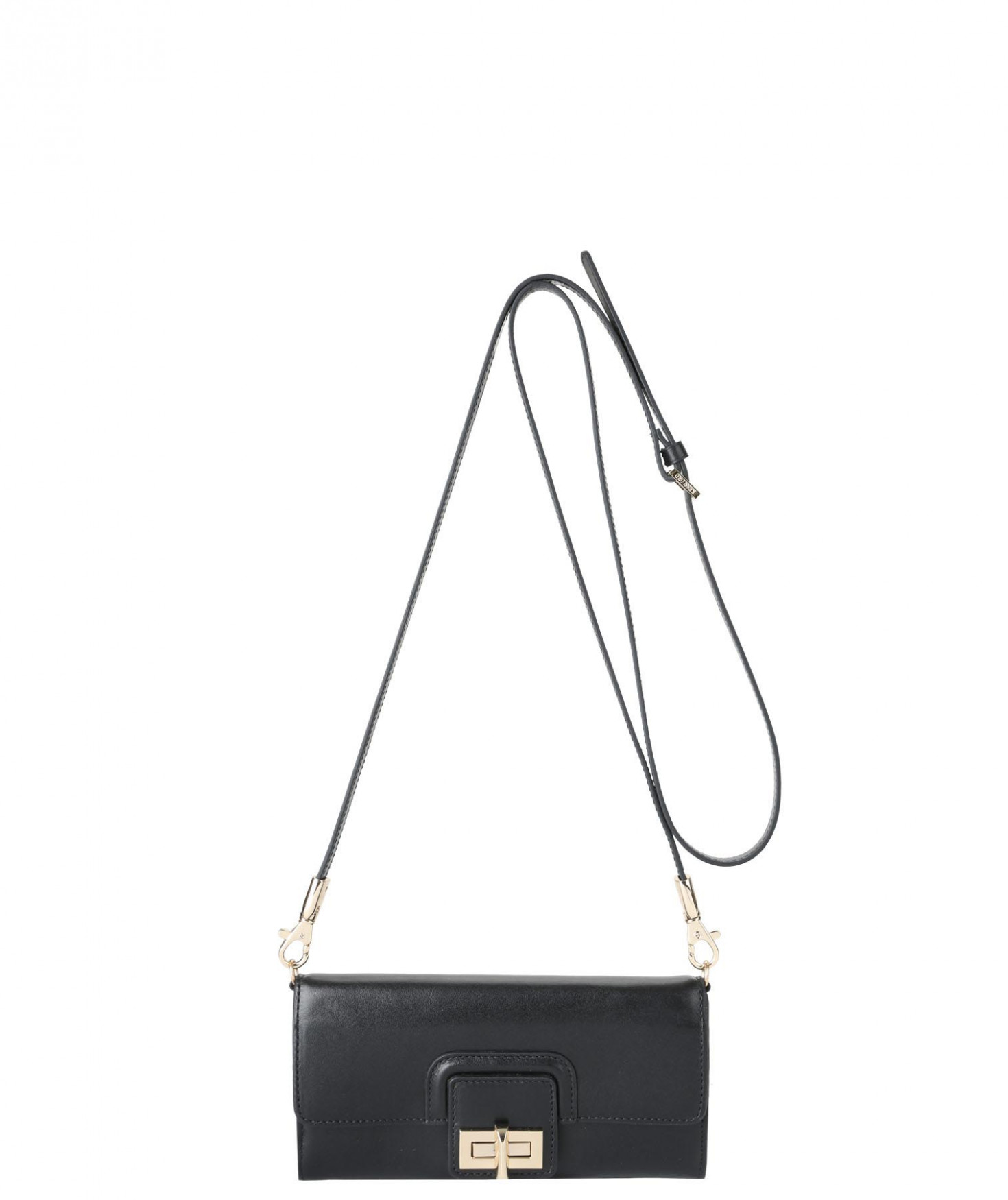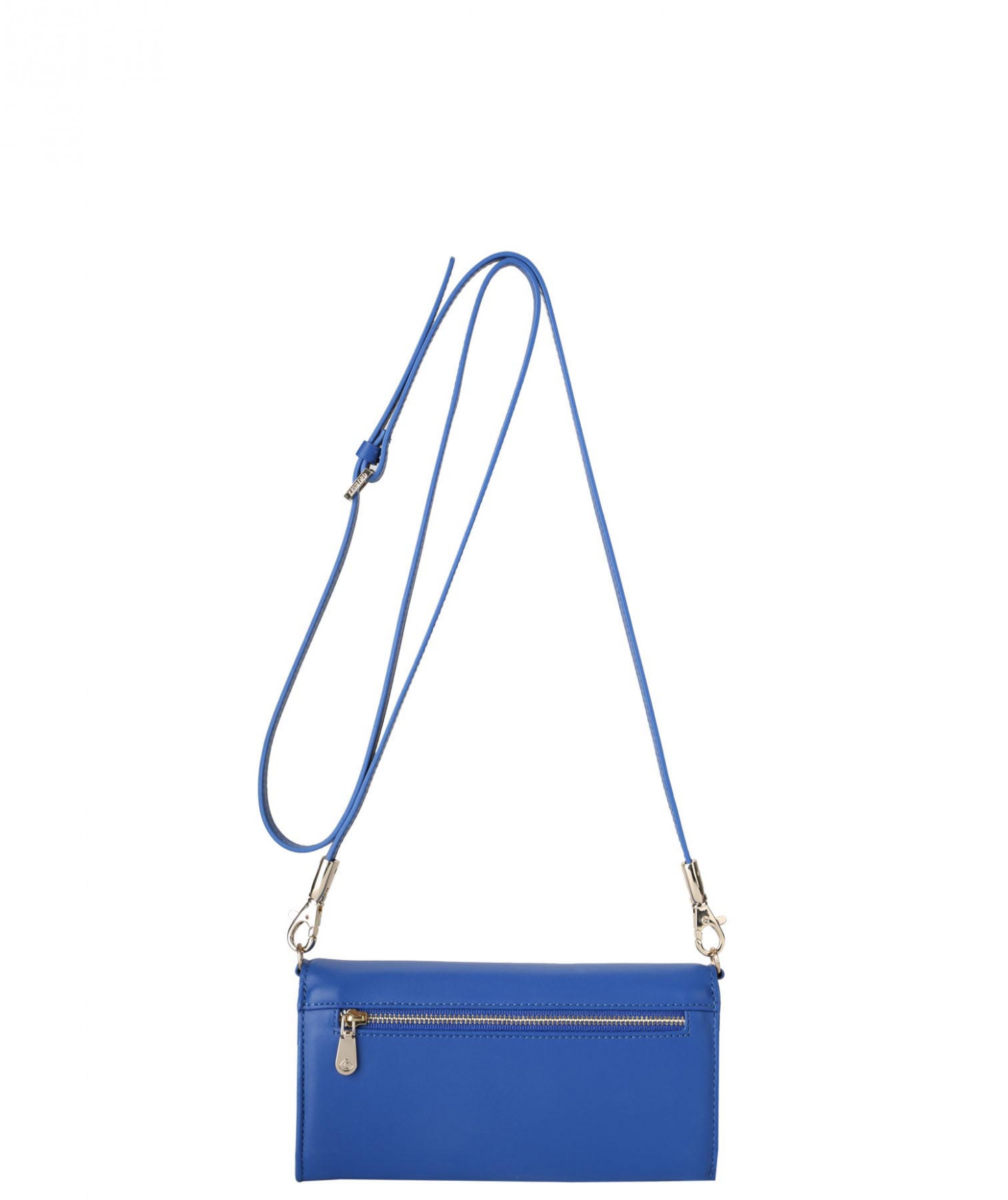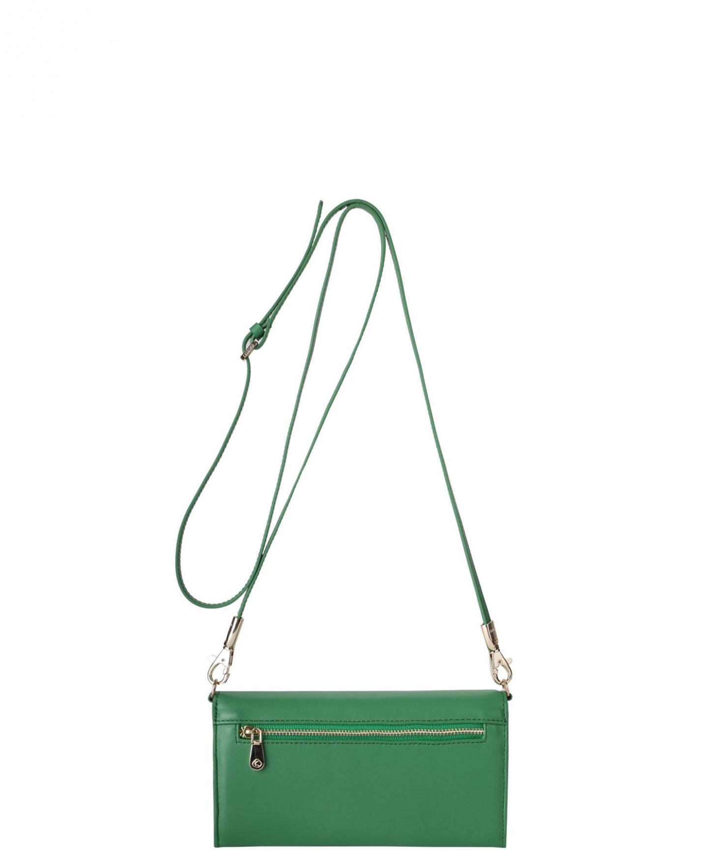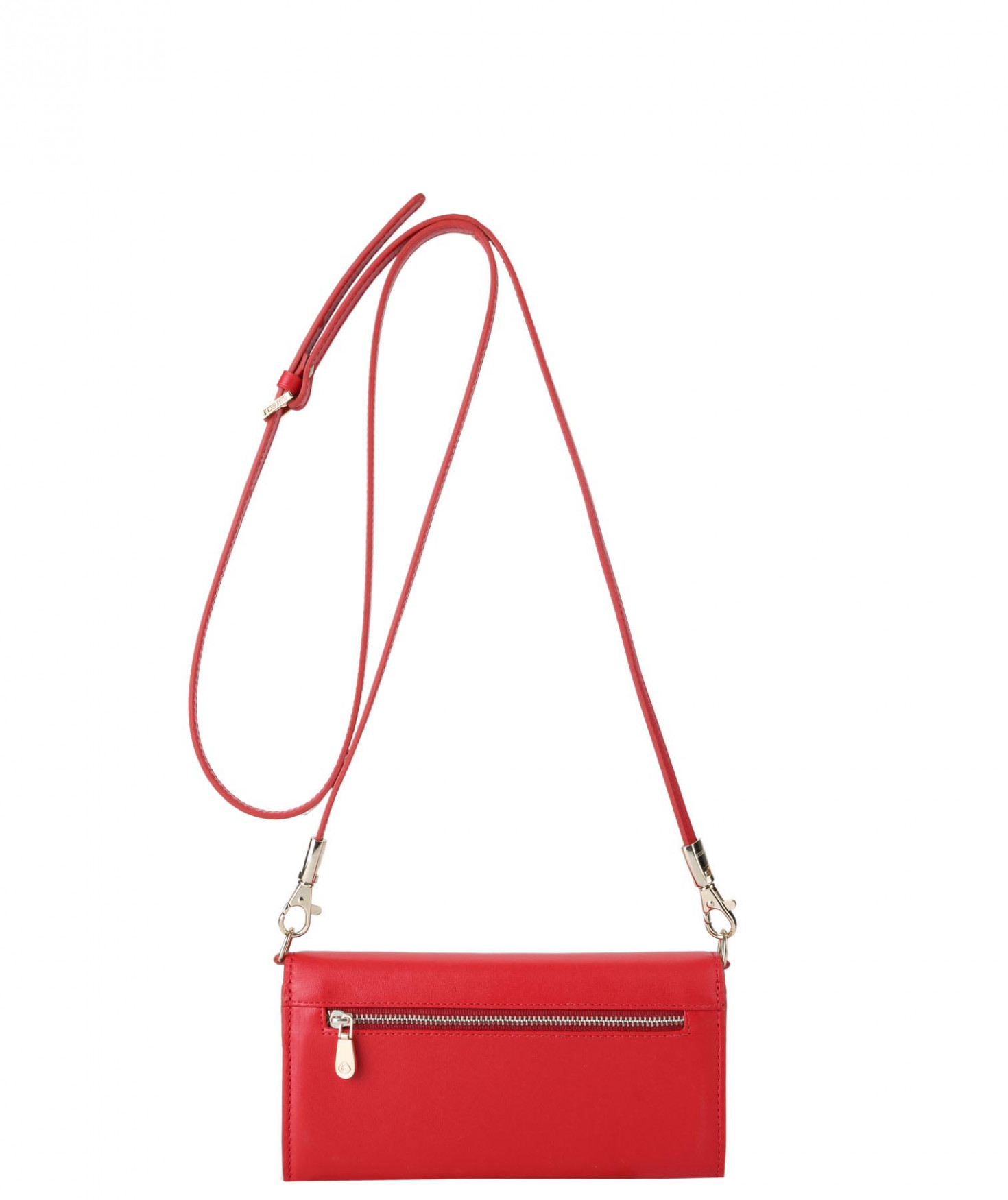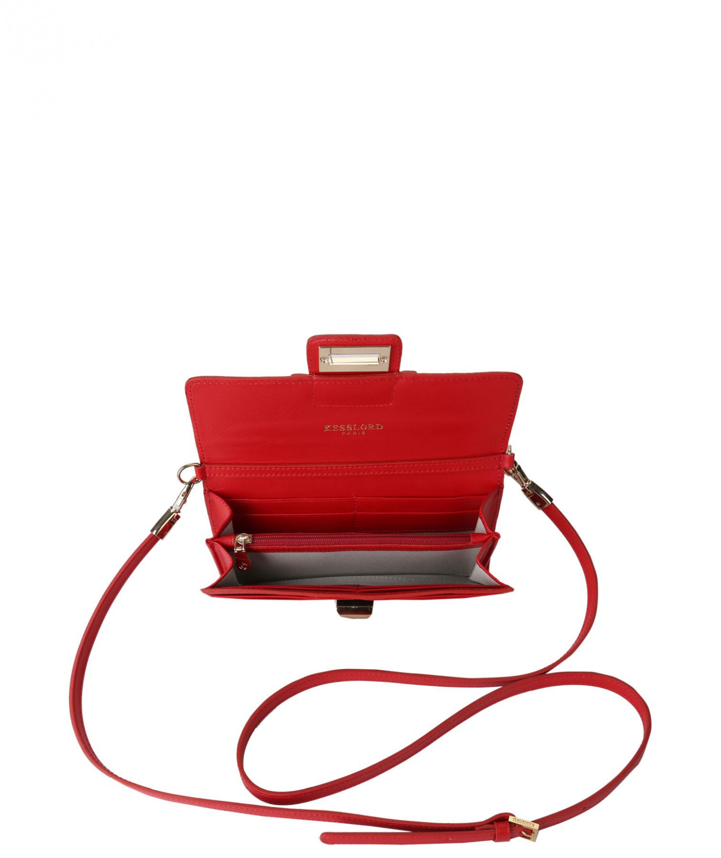 Pochette dotée d'une bandoulière réglable et amovible. Fermeture par un rabat à fermoir. Sous le rabat, des emplacements pour les cartes. A l'intérieur, trois compartiments dont un zippé, de nombreux emplacements pour les cartes. Une poche zippée derrière. Bijouterie finition dorée.
