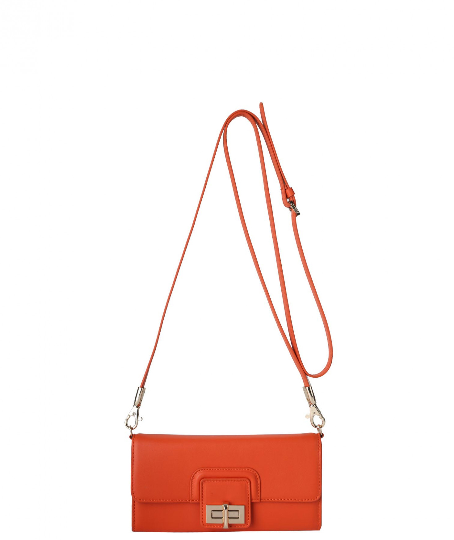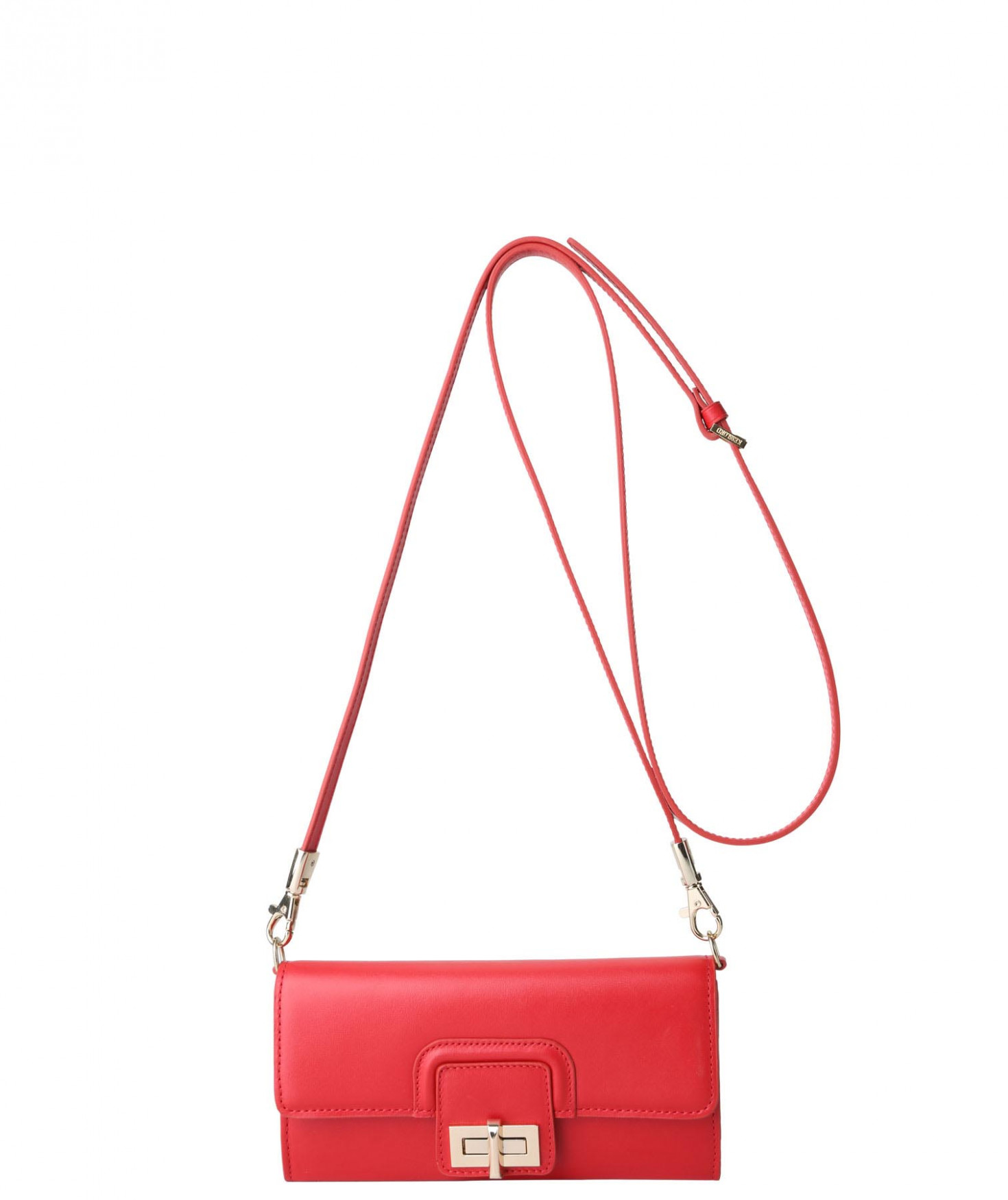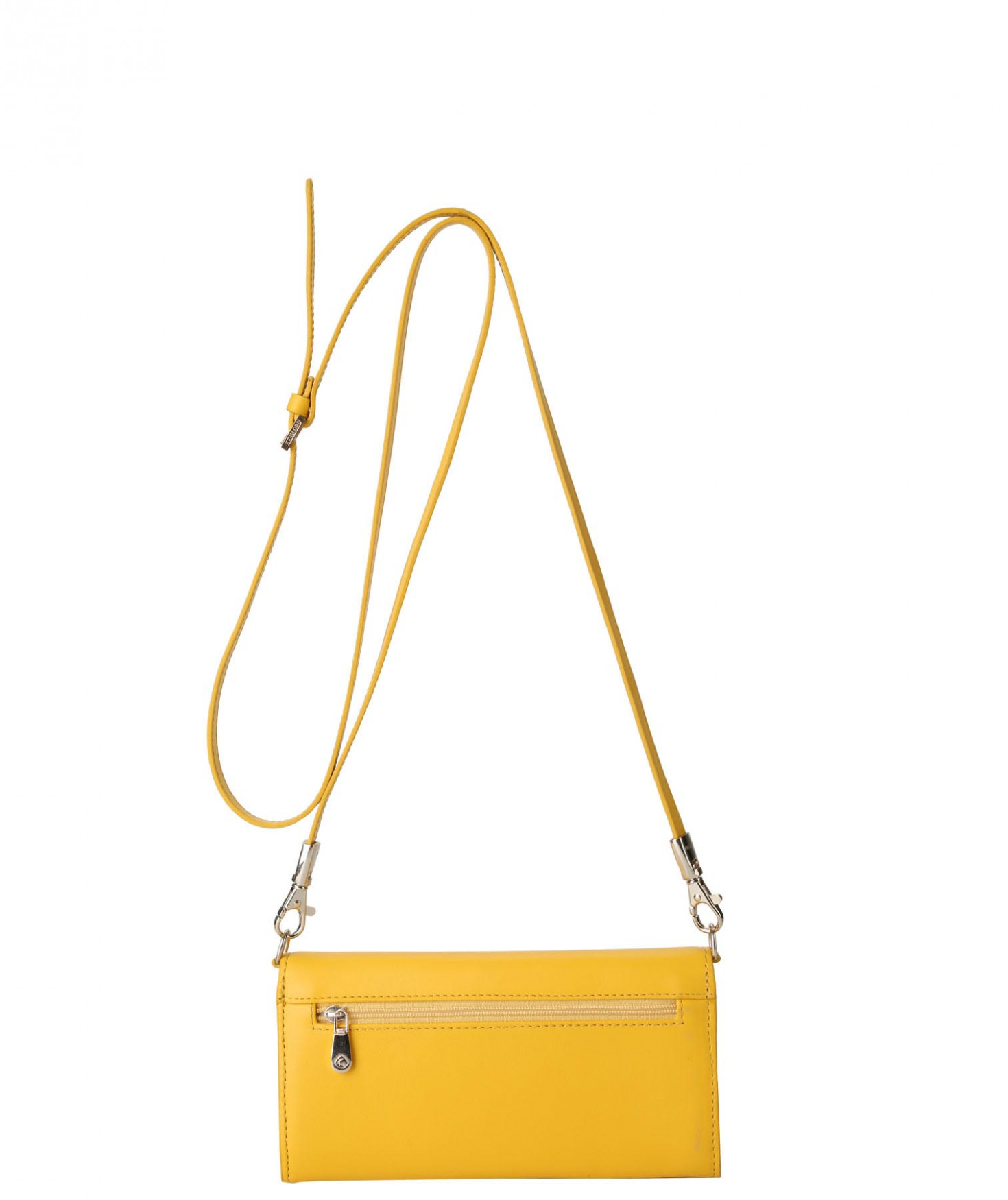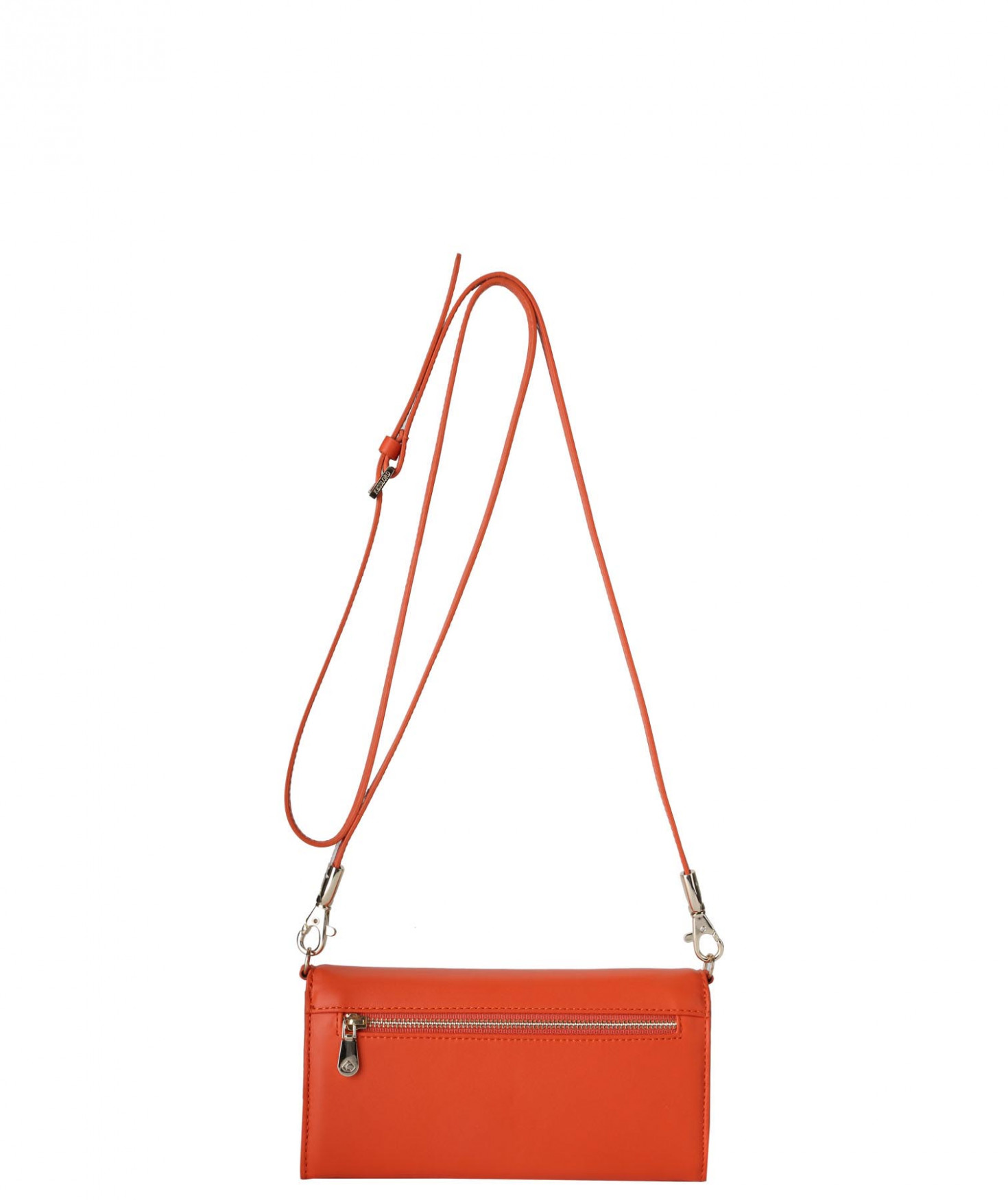 Pochette dotée d'une bandoulière réglable et amovible. Fermeture par un rabat à fermoir. Sous le rabat, des emplacements pour les cartes. A l'intérieur, trois compartiments dont un zippé, de nombreux emplacements pour les cartes. Une poche zippée derrière. Bijouterie finition dorée.