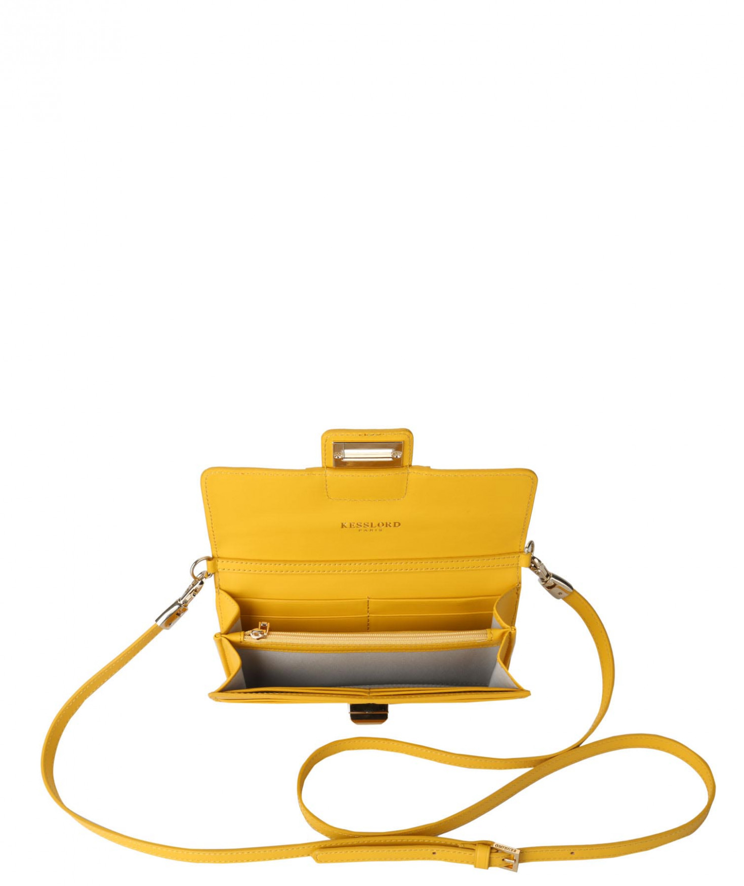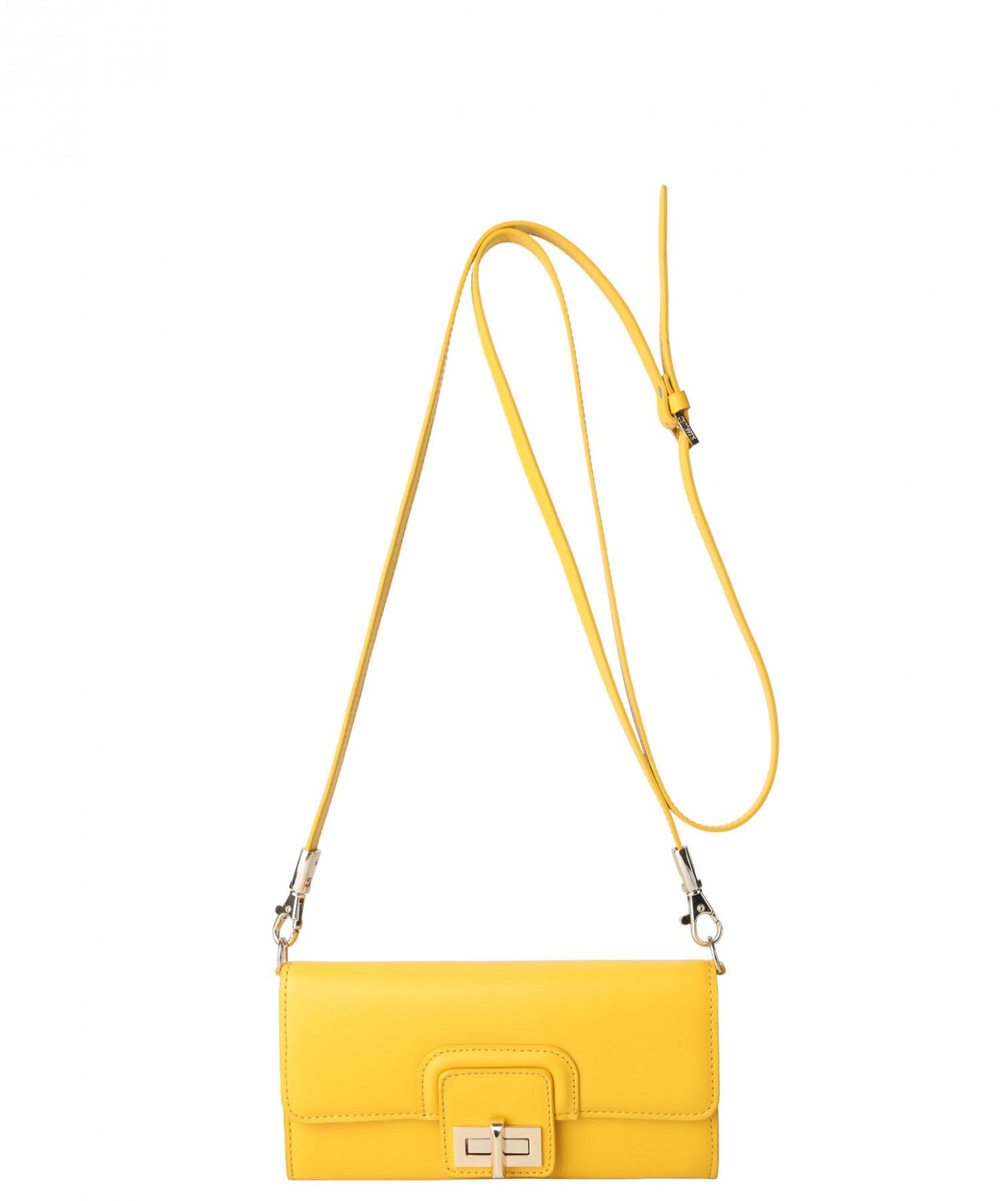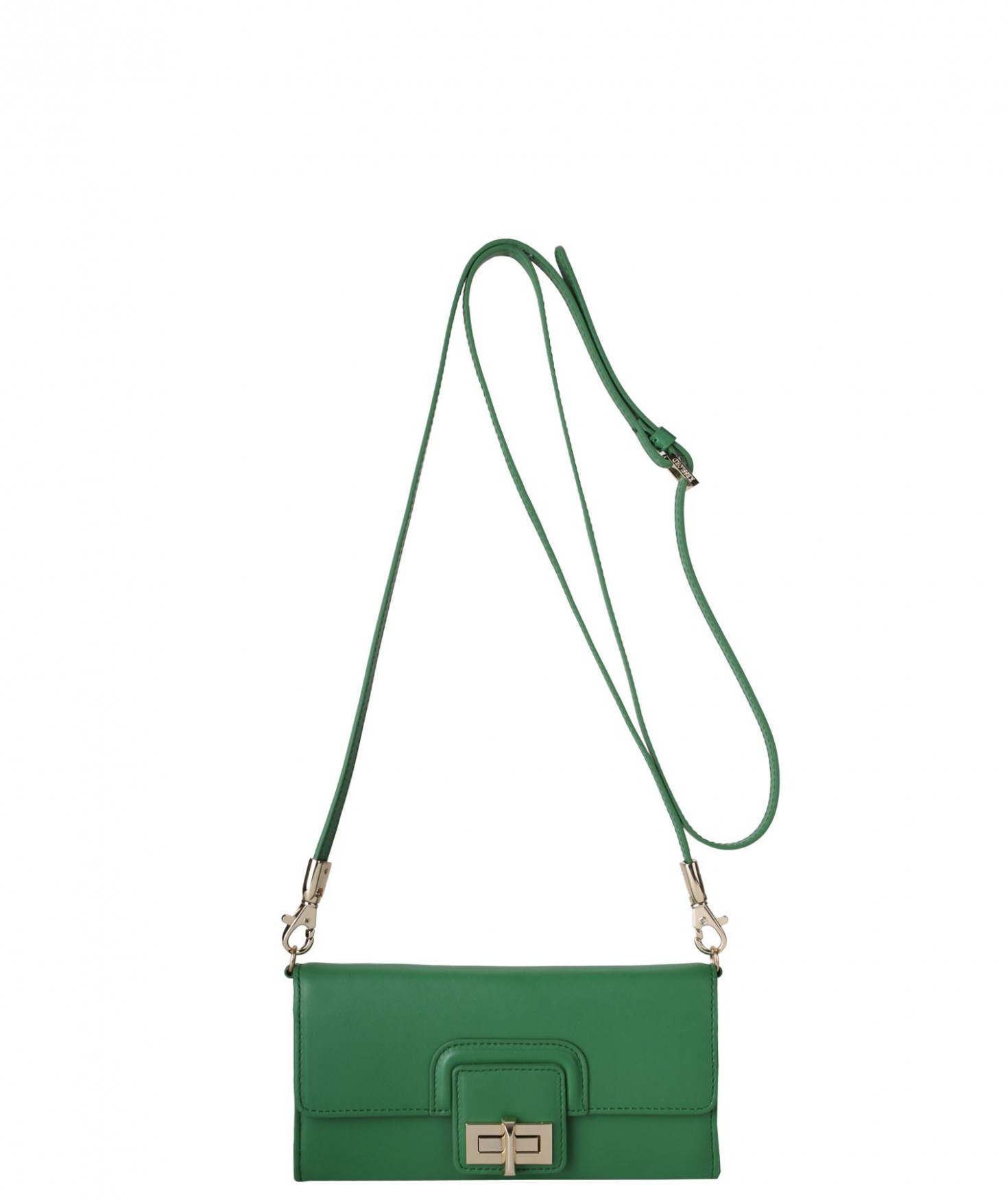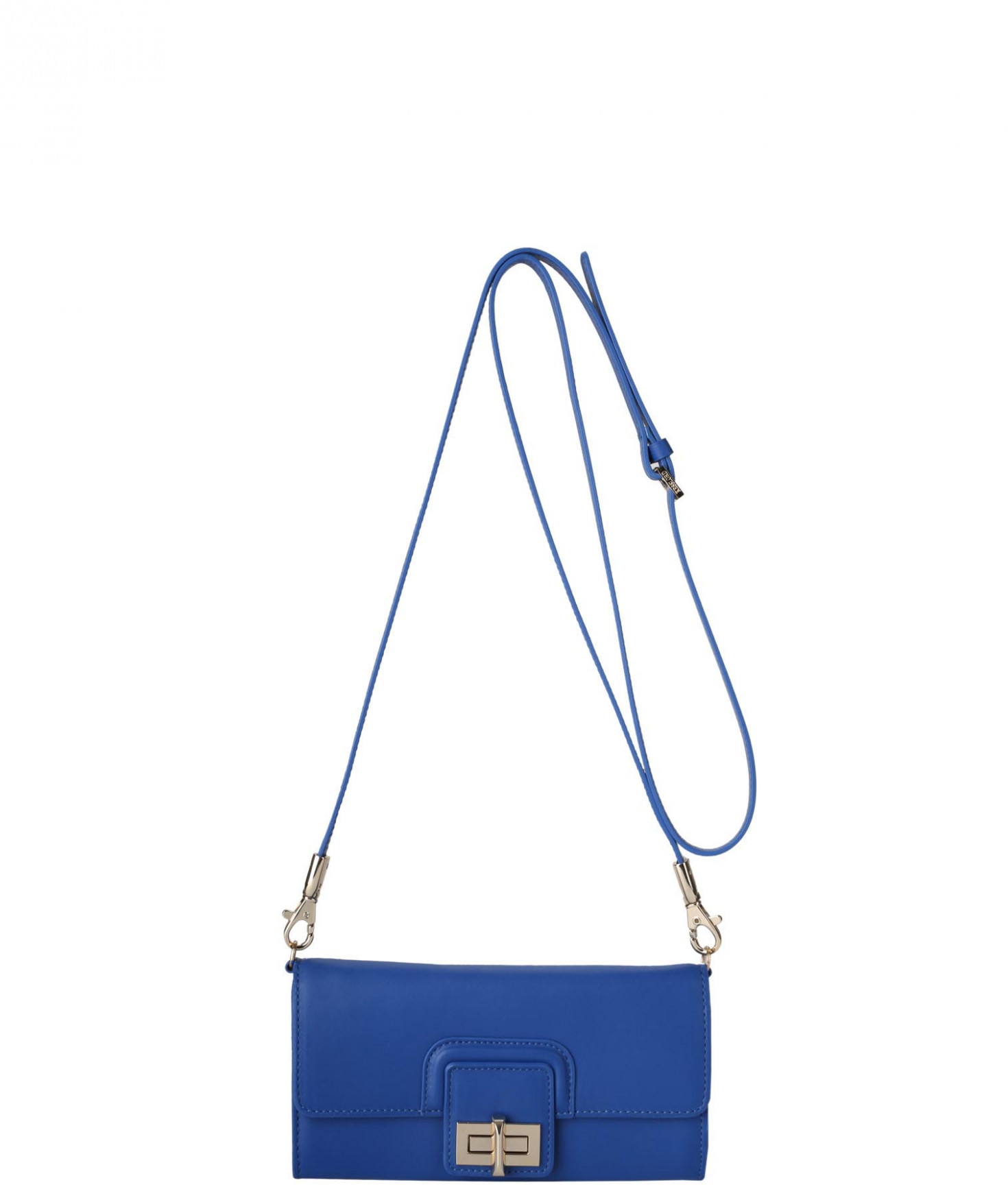Pochette dotée d'une bandoulière réglable et amovible. Fermeture par un rabat à fermoir. Sous le rabat, des emplacements pour les cartes. A l'intérieur, trois compartiments dont un zippé, de nombreux emplacements pour les cartes. Une poche zippée derrière. Bijouterie finition dorée.