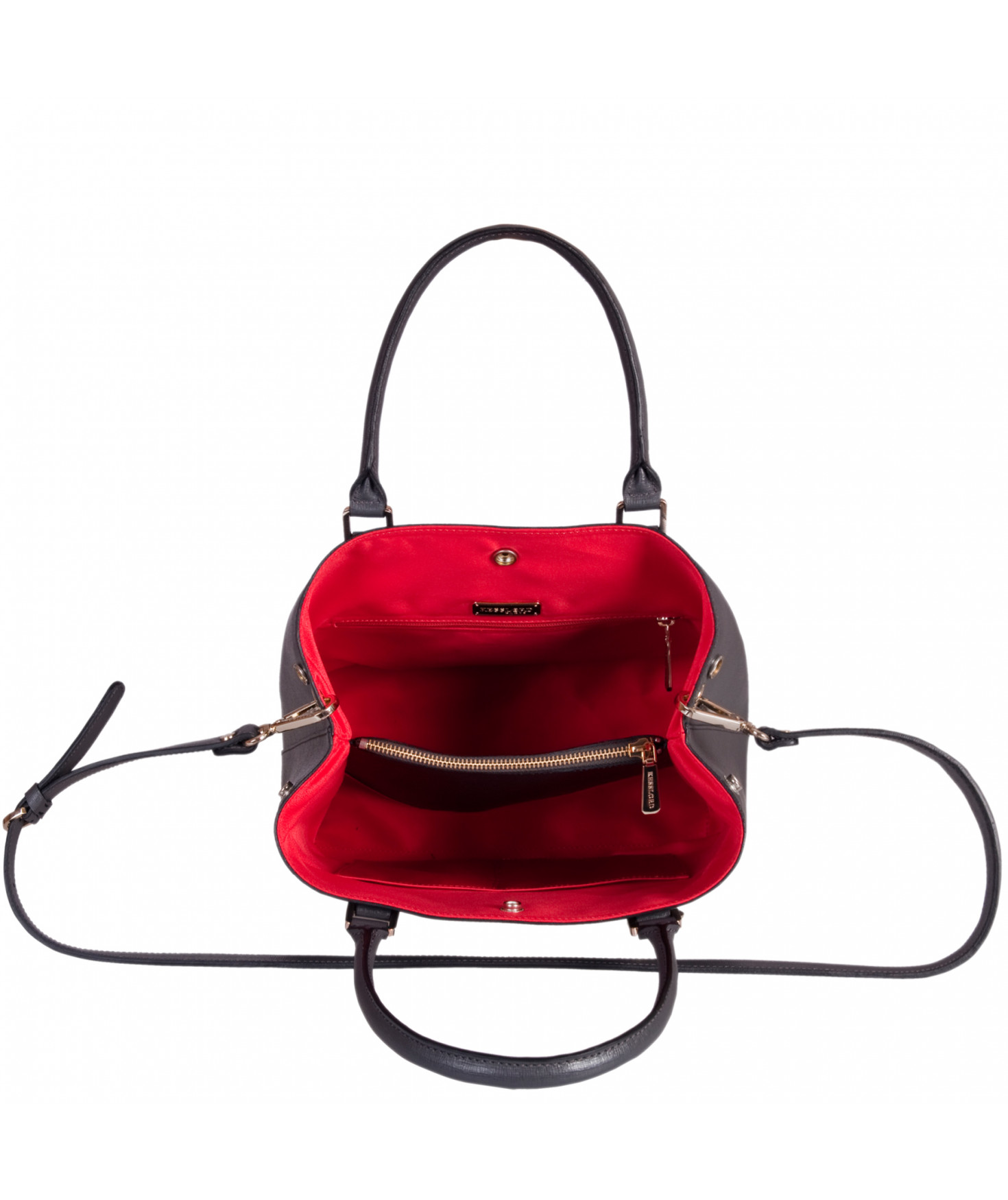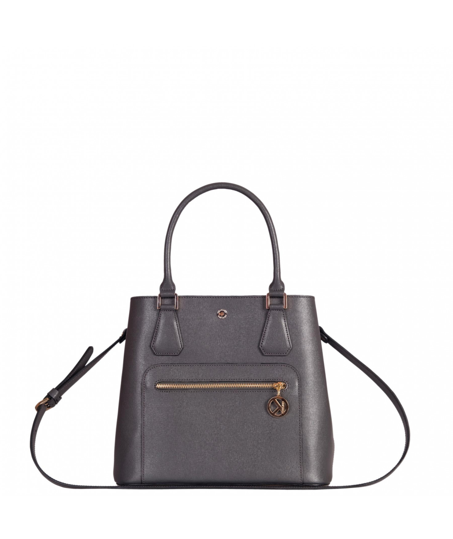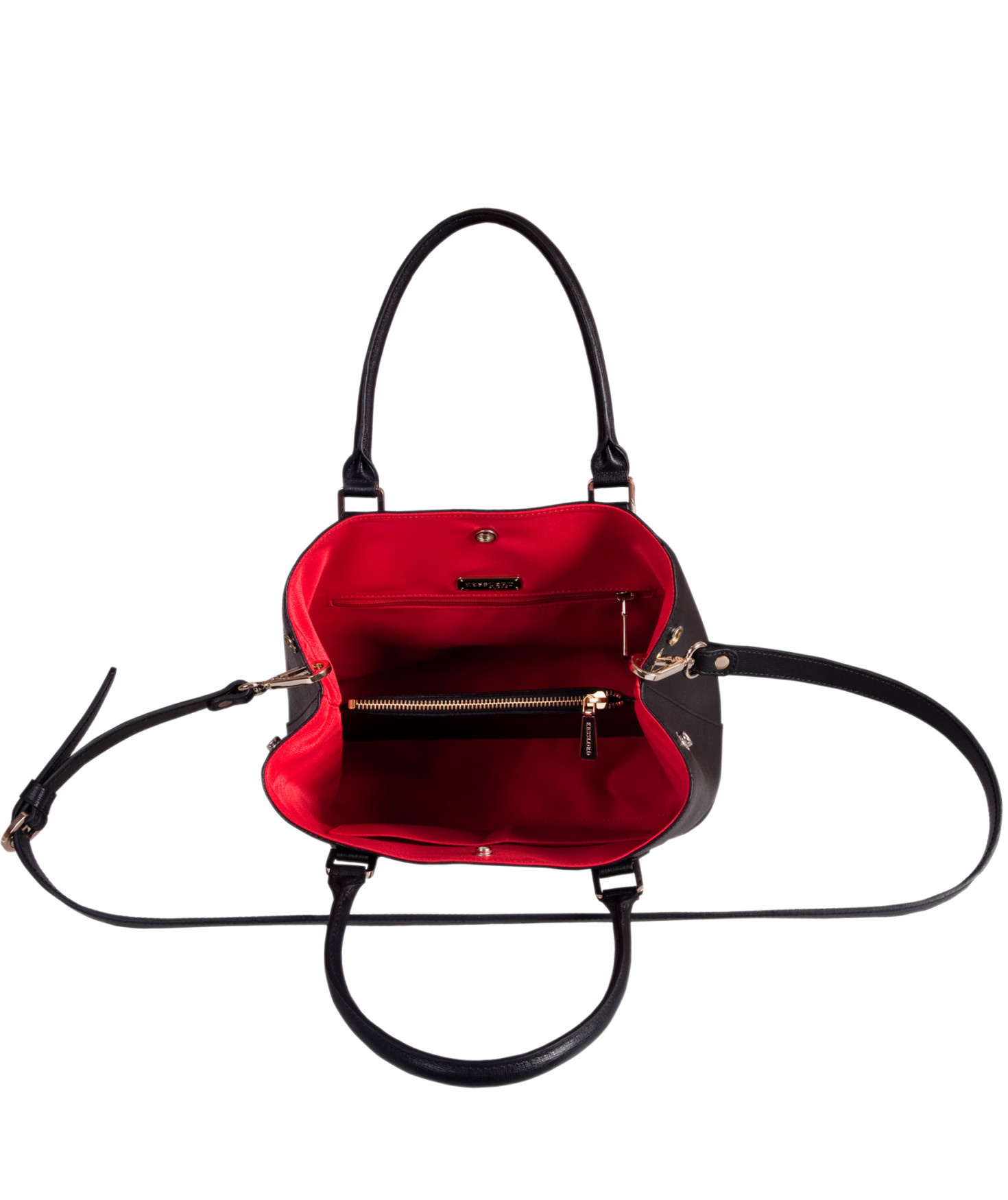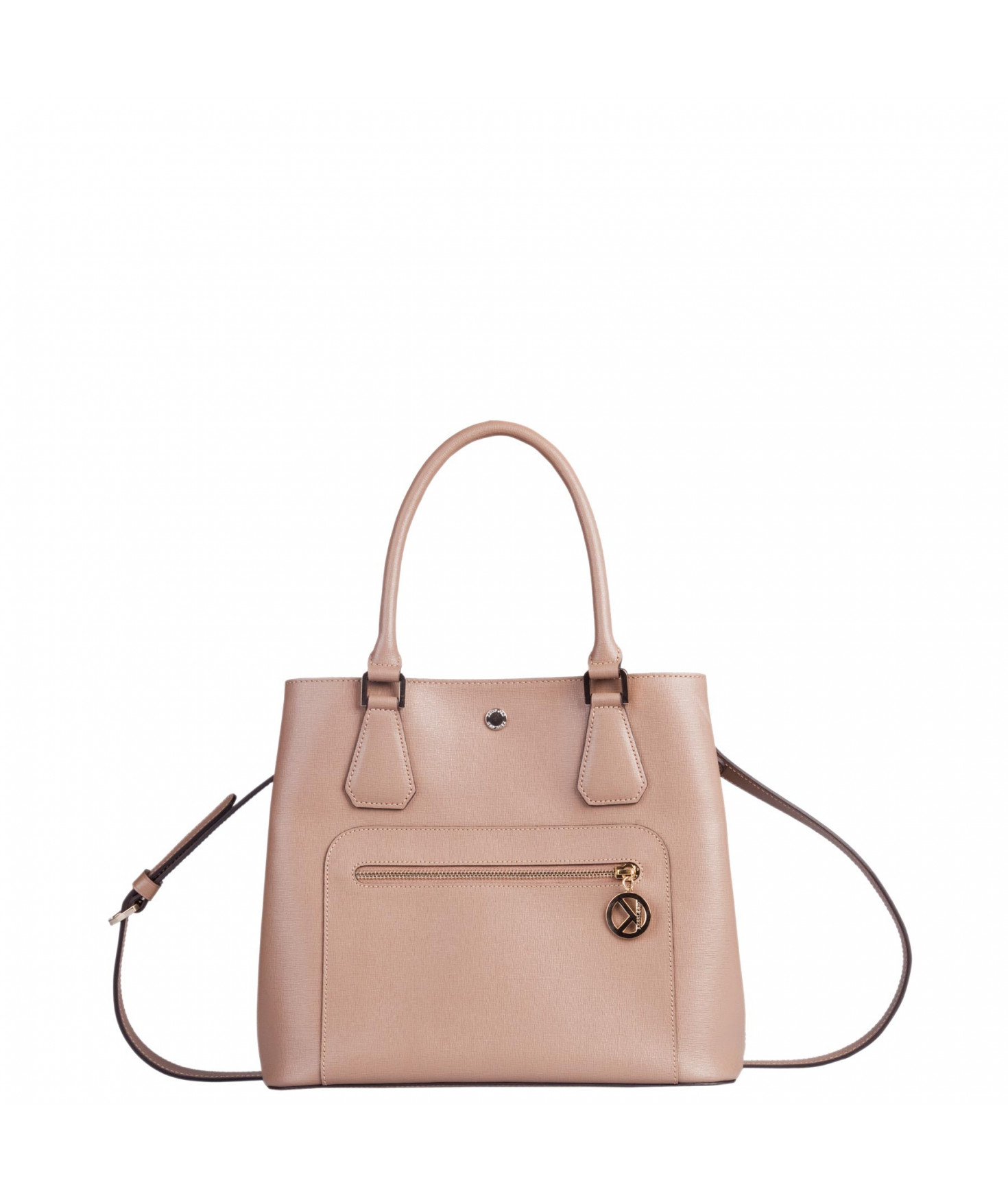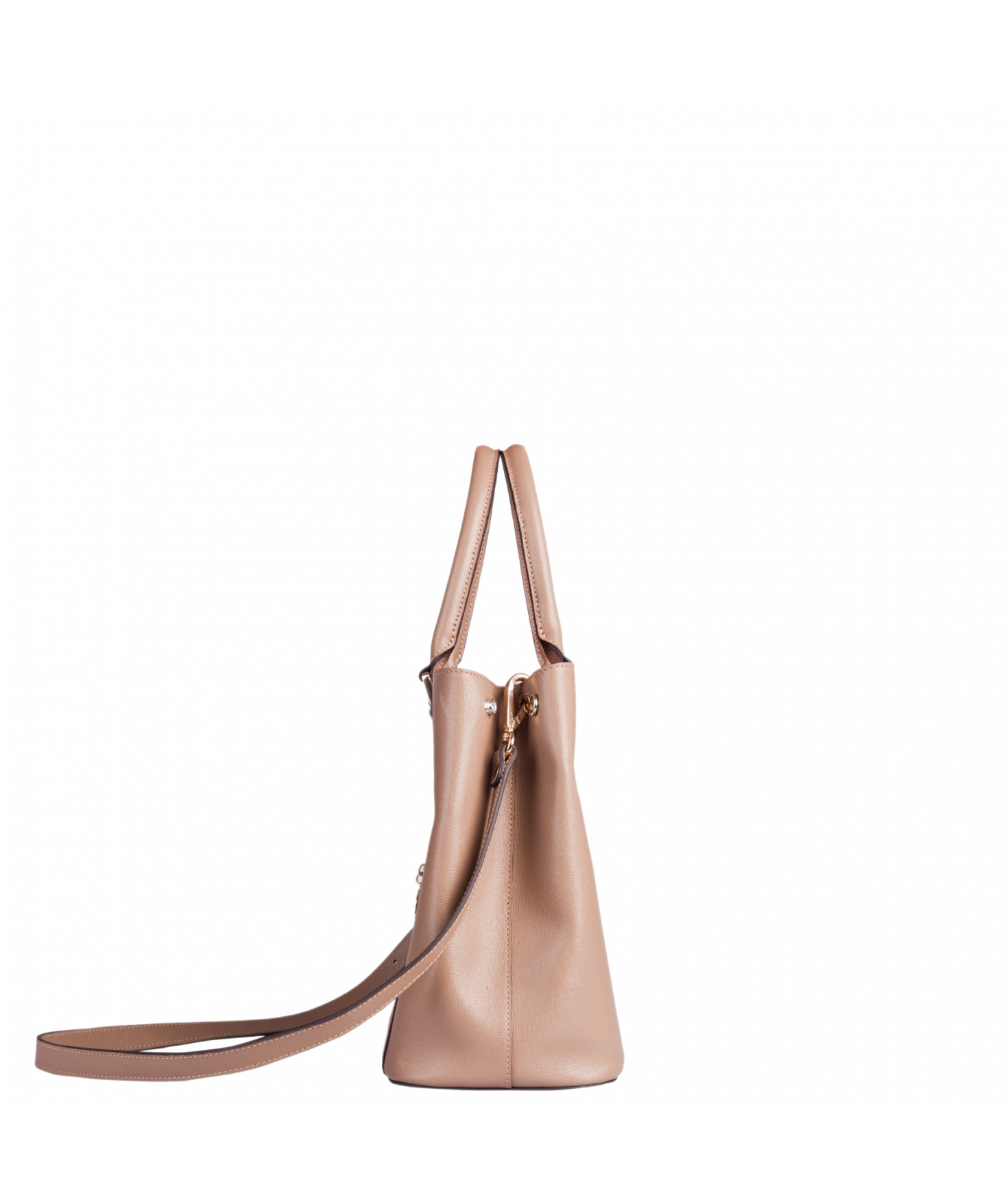 Sac porté main ou épaule. Bandoulière réglable et amovible. Fermeture par bouton pression. Une poche extérieure zippée sur l'arrière. Trois compartiments intérieurs dont un zippé. Une poche intérieure zippée et deux poches intérieures plaquées. Bijouterie en métal finition dorée.