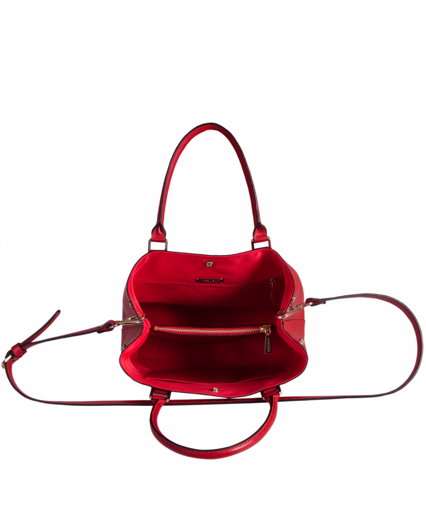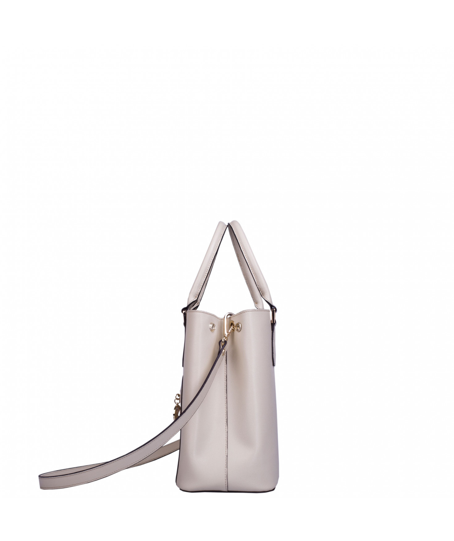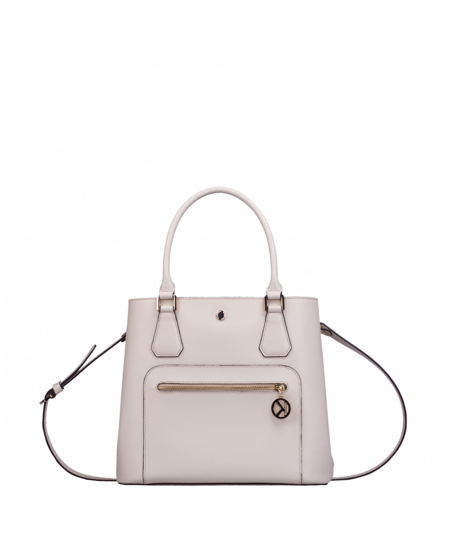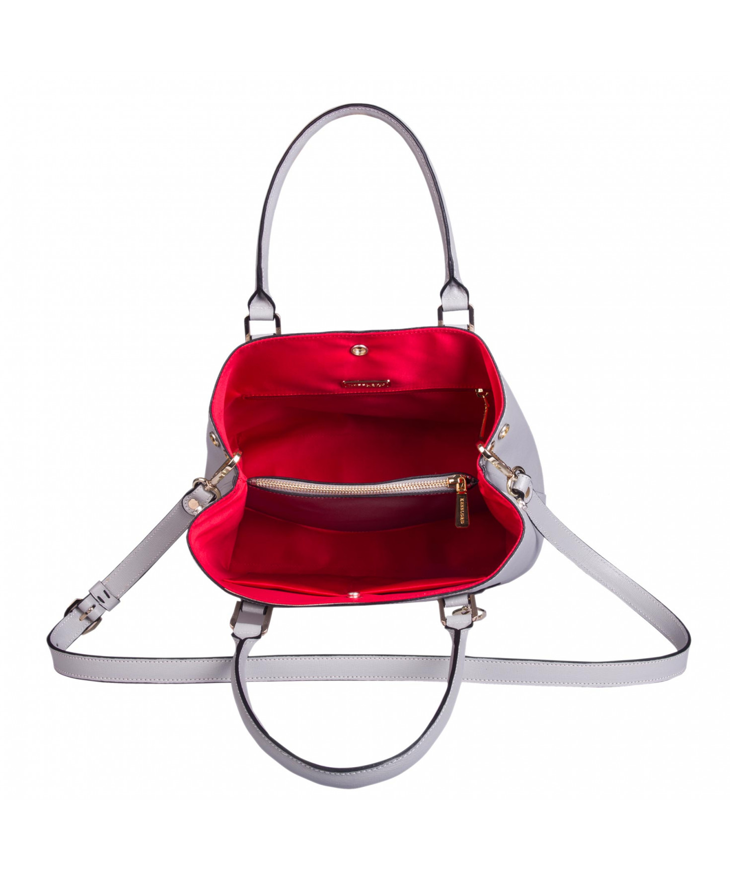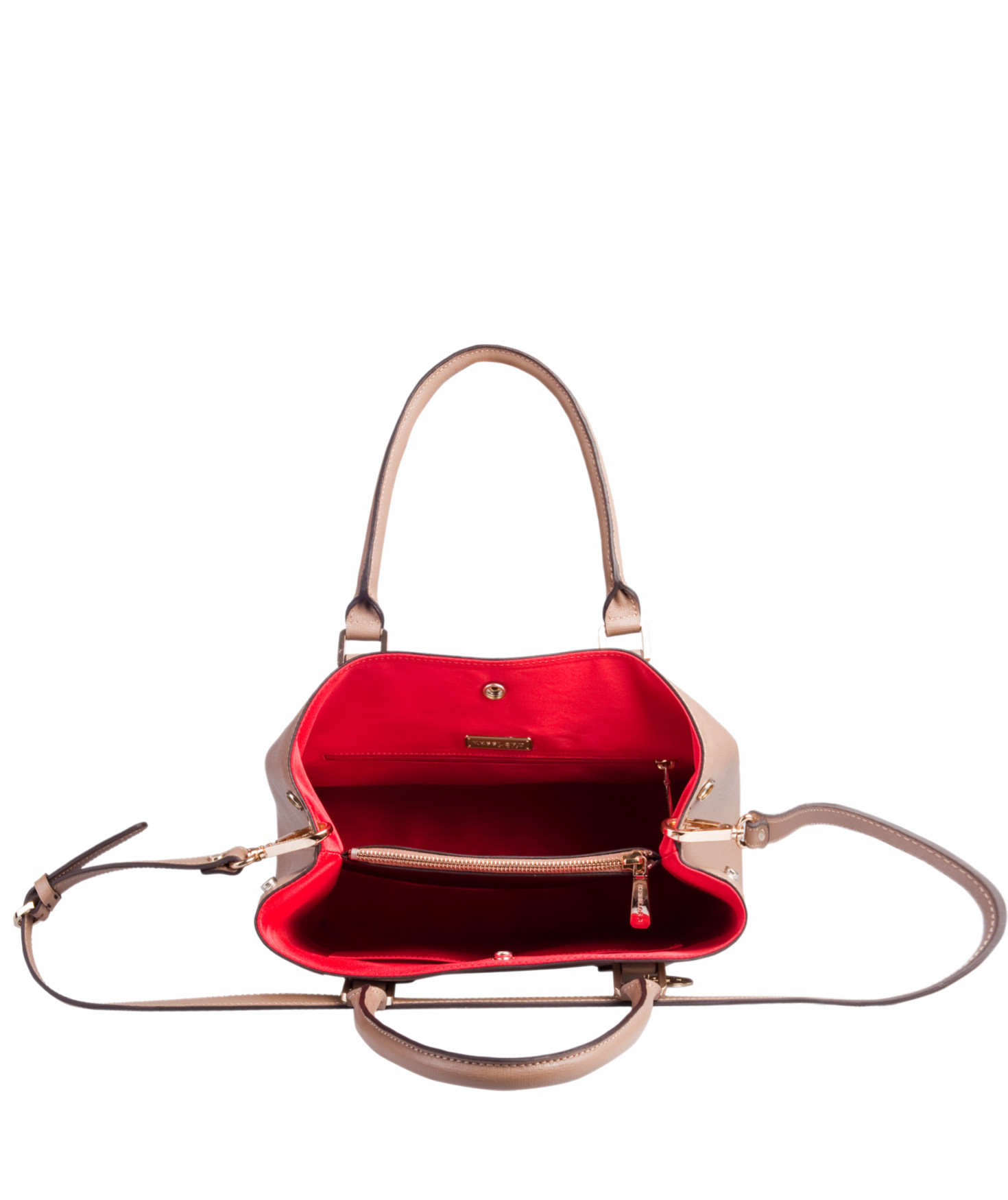 Sac porté main ou épaule. Bandoulière réglable et amovible. Fermeture par bouton pression. Une poche extérieure zippée sur l'arrière. Trois compartiments intérieurs dont un zippé. Une poche intérieure zippée et deux poches intérieures plaquées. Bijouterie en métal finition dorée.