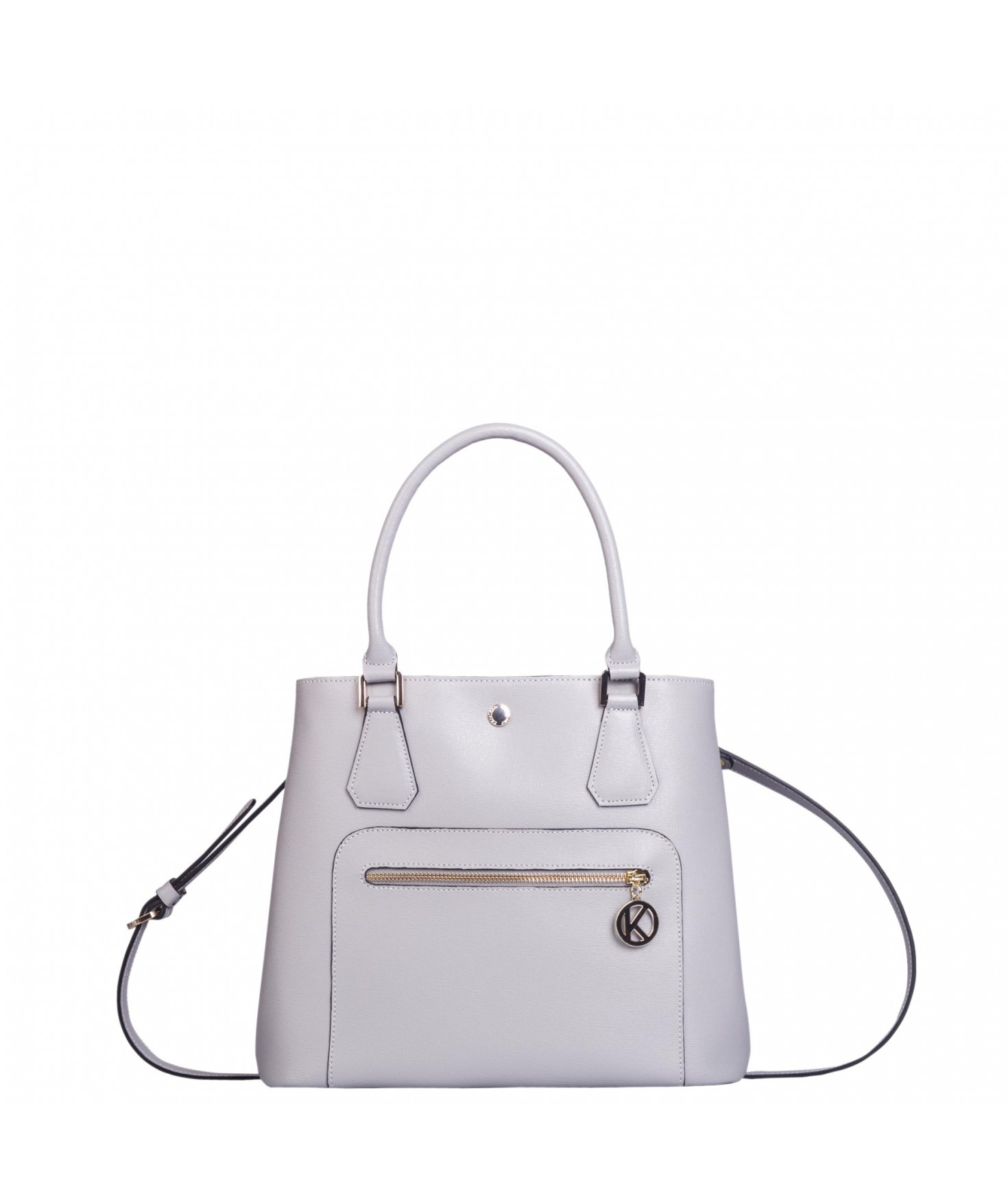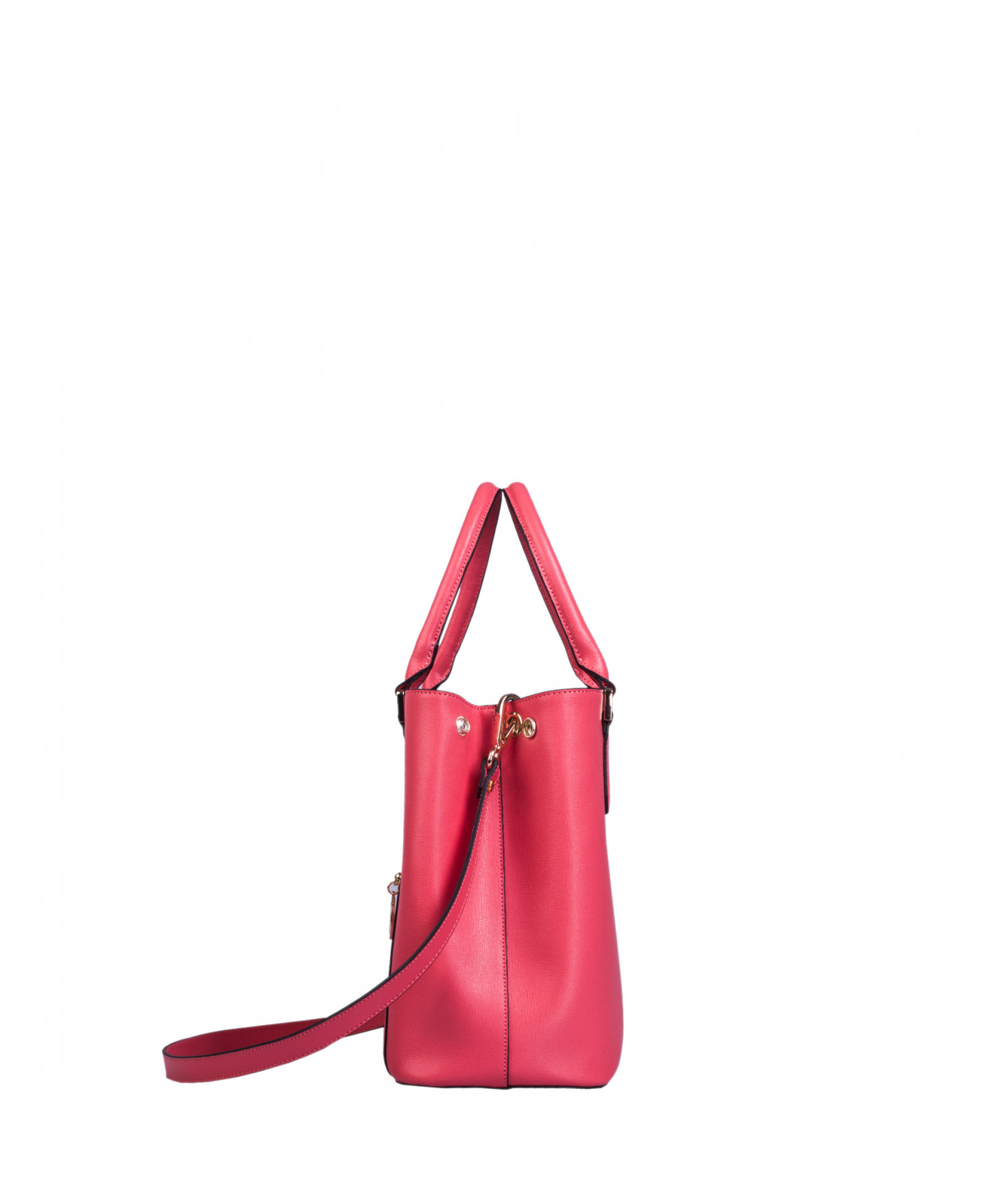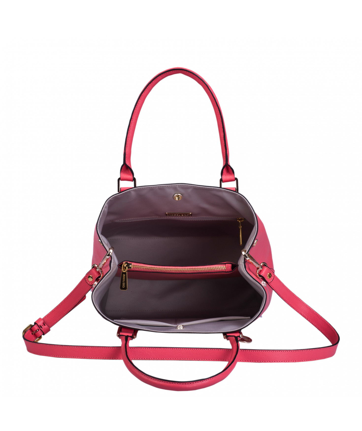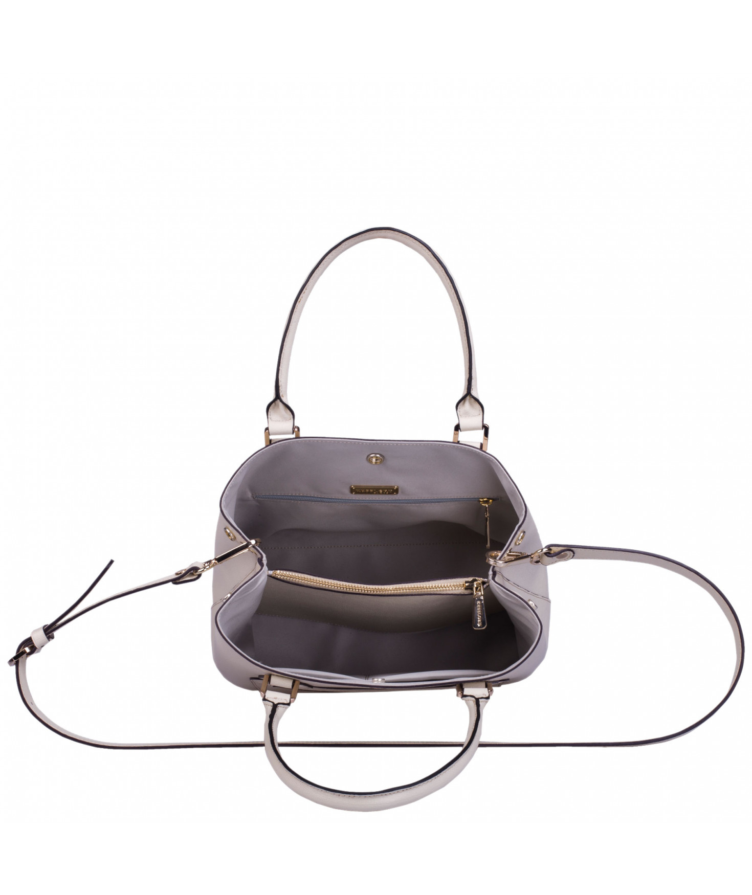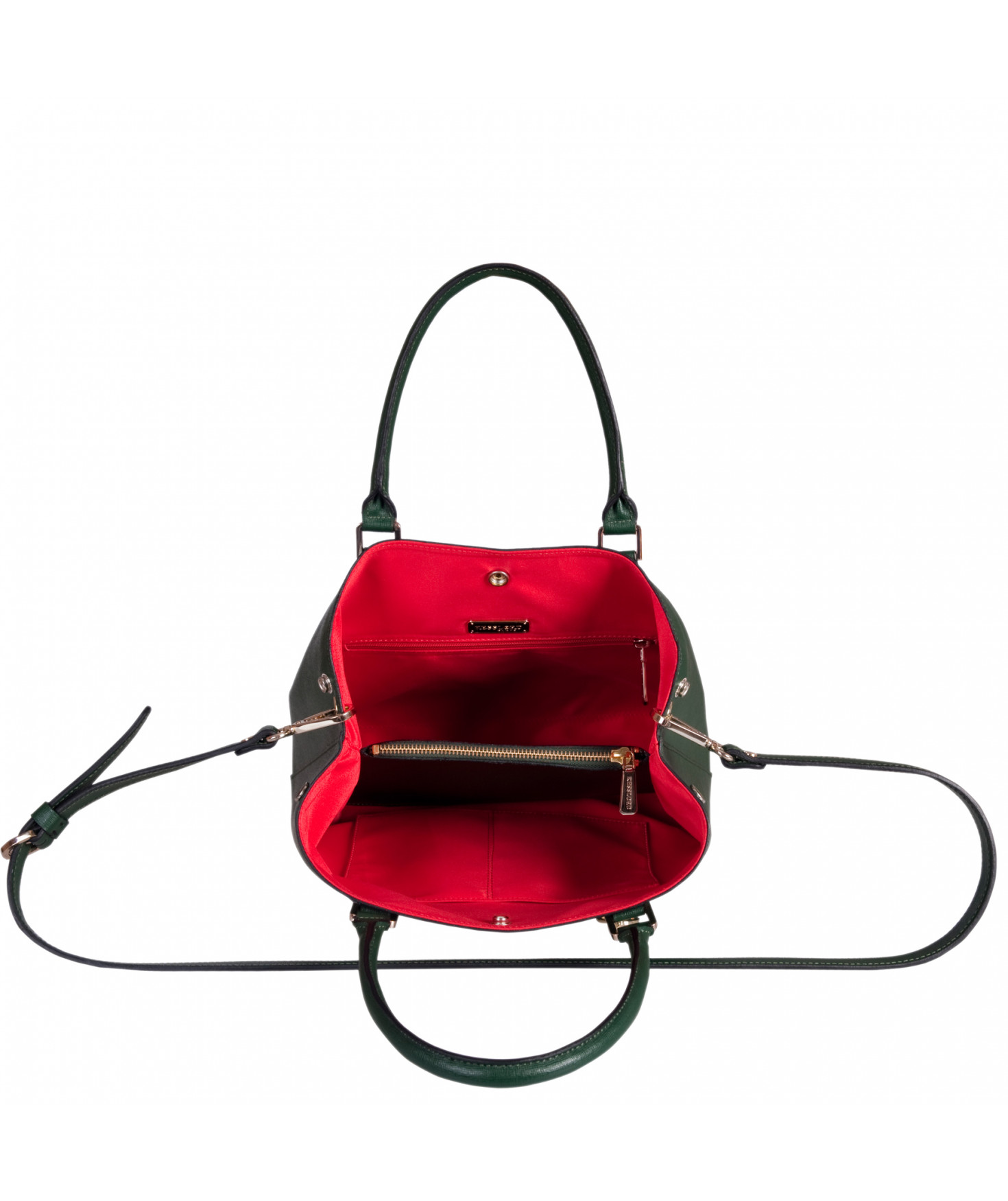 Sac porté main ou épaule. Bandoulière réglable et amovible. Fermeture par bouton pression. Une poche extérieure zippée sur l'arrière. Trois compartiments intérieurs dont un zippé. Une poche intérieure zippée et deux poches intérieures plaquées. Bijouterie en métal finition dorée.