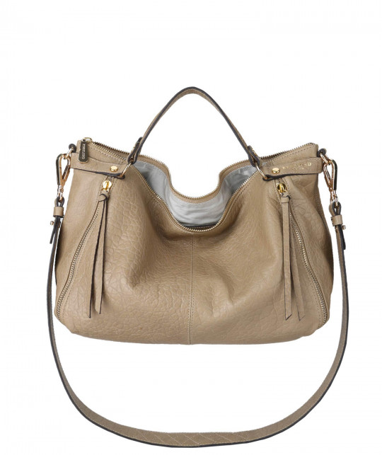 Sac cabas double porter, main ou épaule, bandoulière amovible. Fermeture par un zip. Deux poches zippées sur le devant. A l'intérieur, 2 poches plaquées et une poche zippée. Bijouterie finition dorée. - Dimensions en cm : 37 x 23 x 17