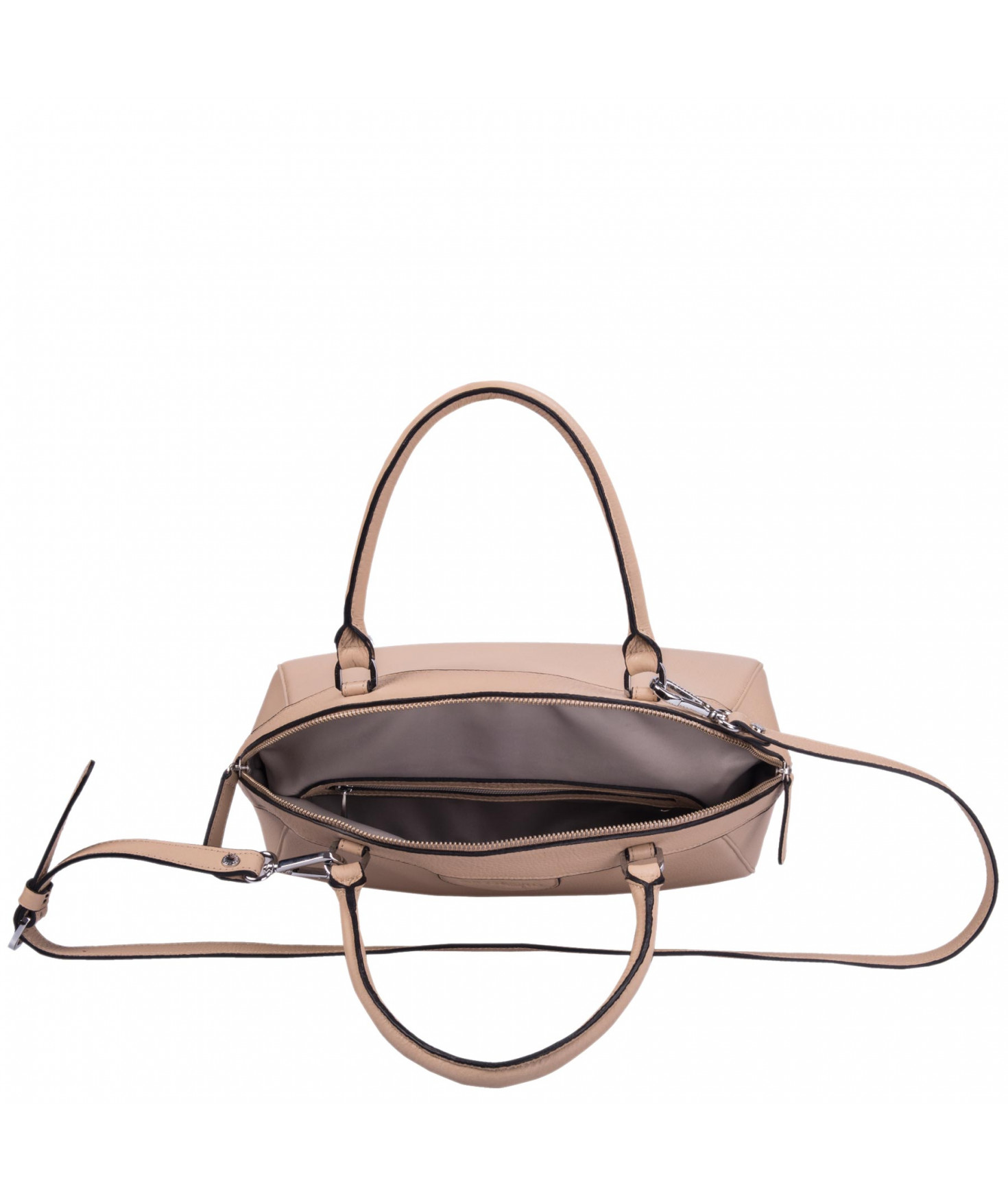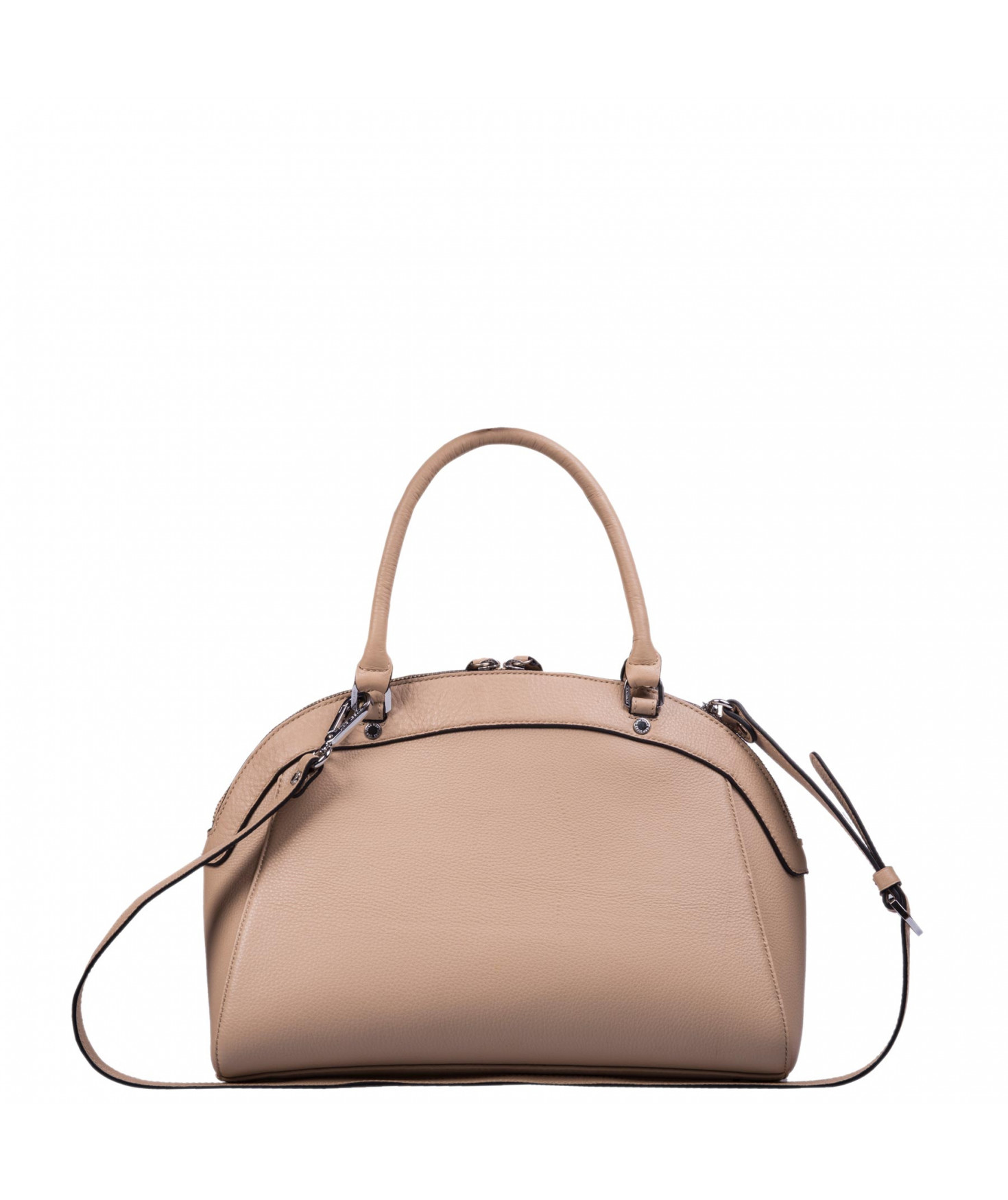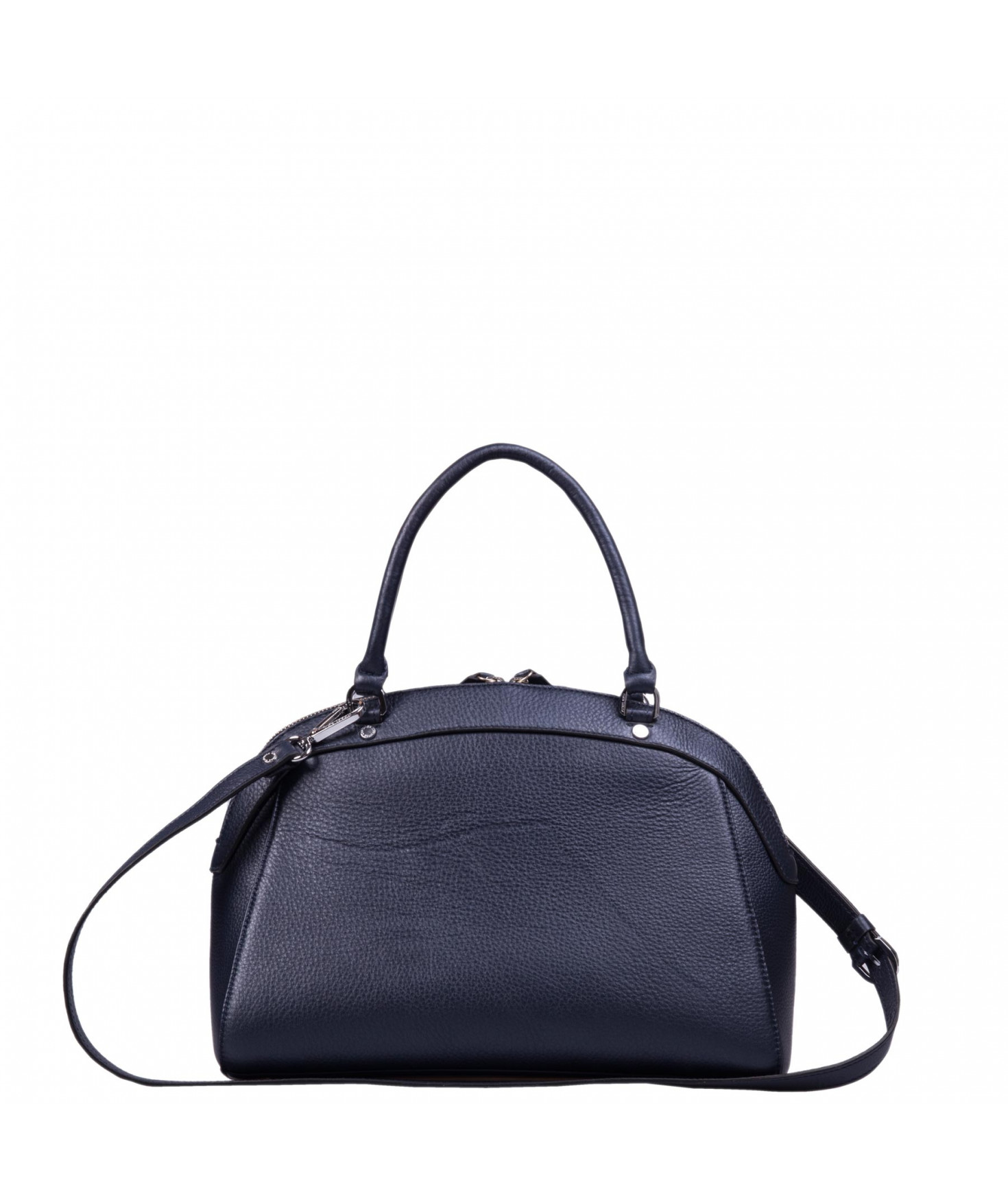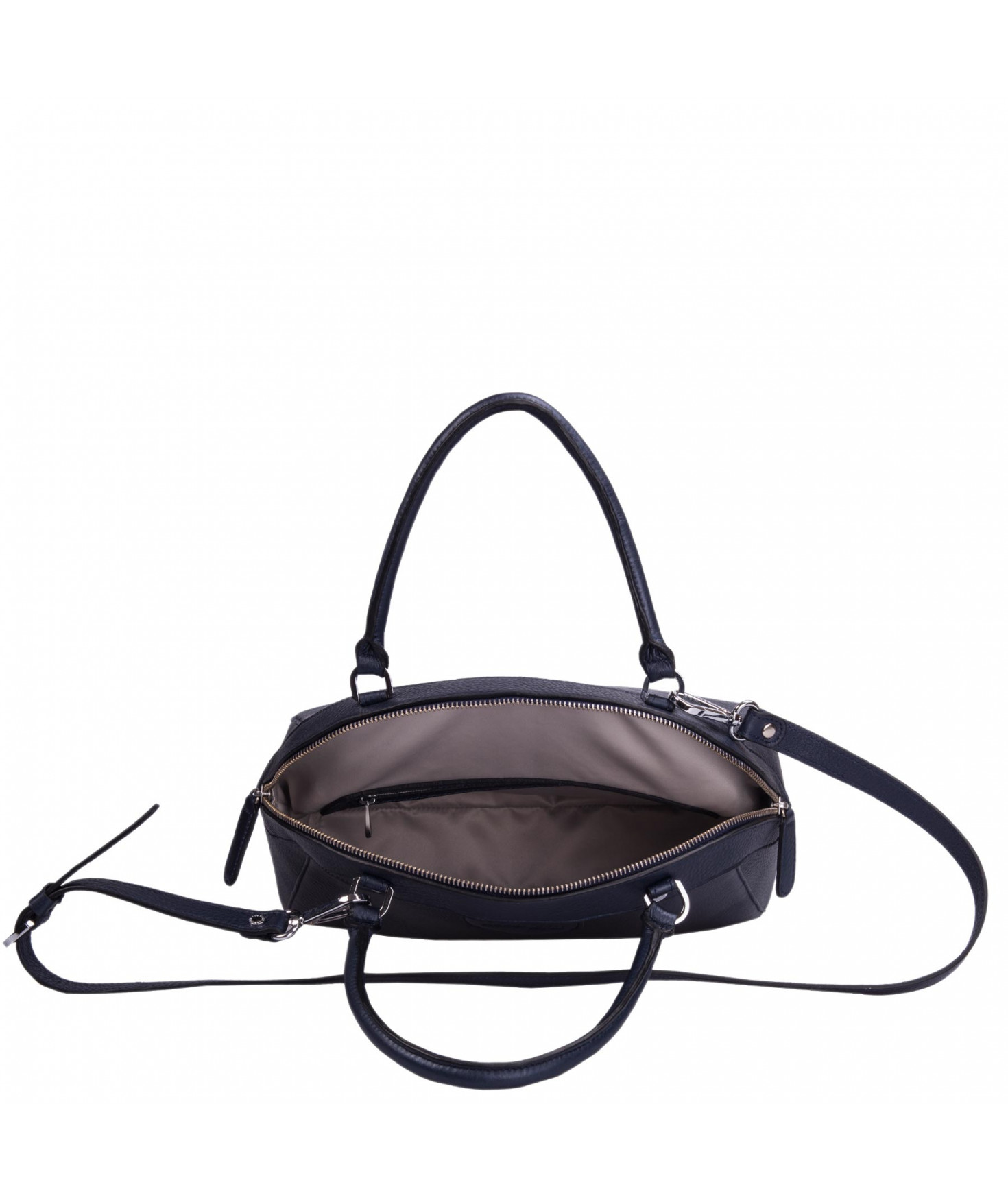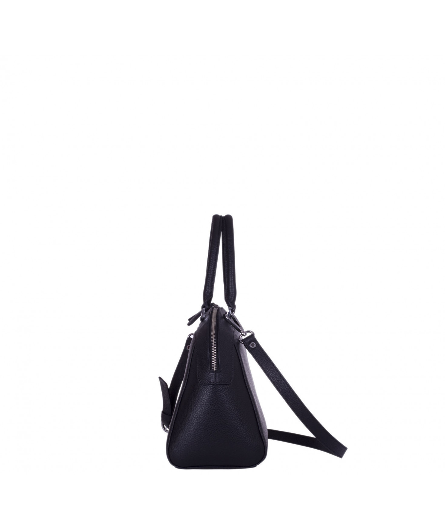 Sac porté main, épaule ou croisé grâce à une bandoulière réglable et amovible. Fermeture à zip. Une poche intérieure zippée et deux poches intérieures plaquées. Bijouterie en métal finition argentée.