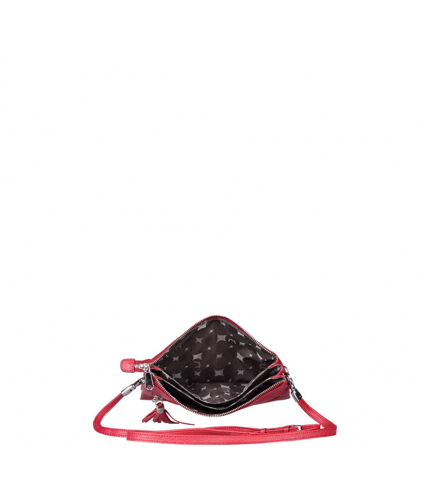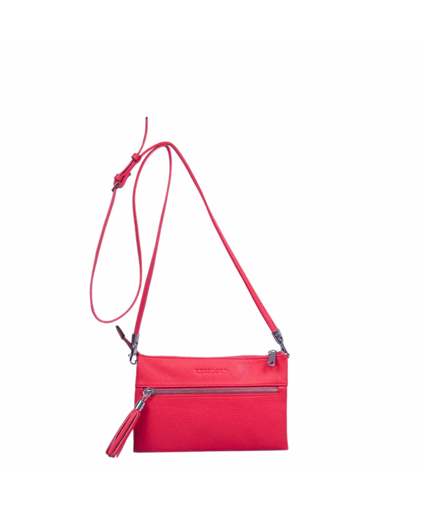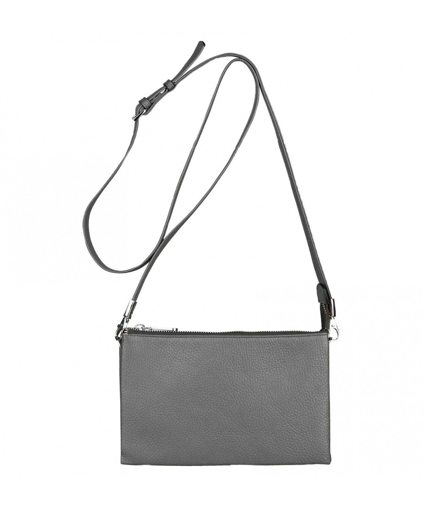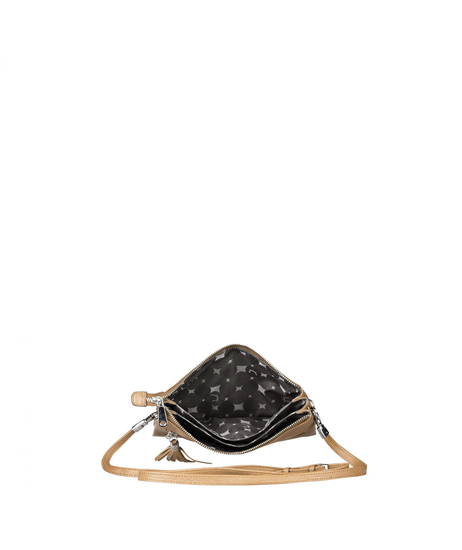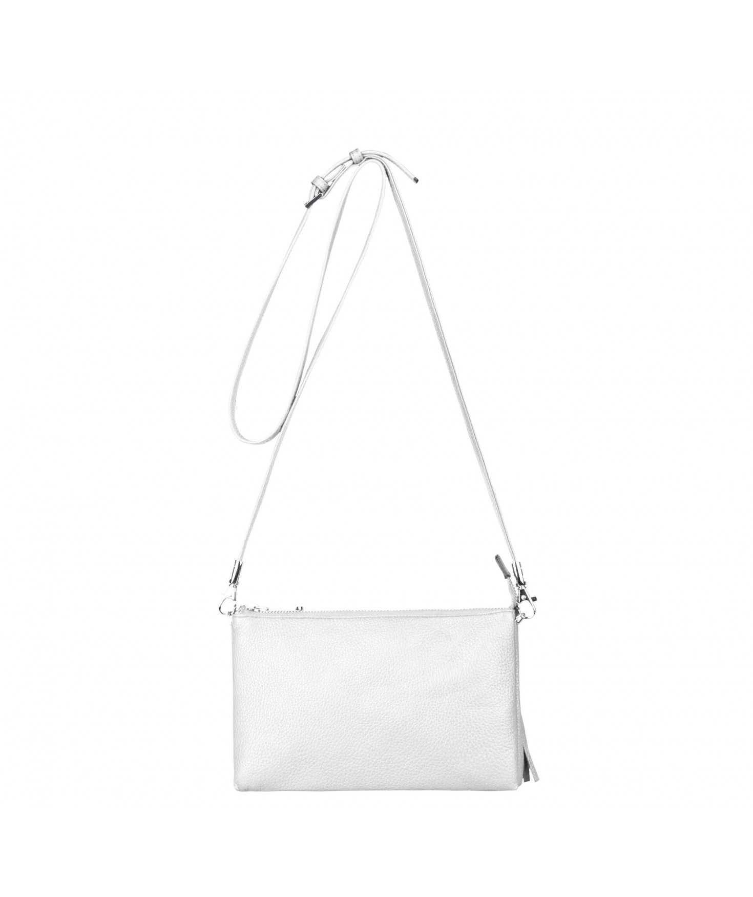 Pochette dotée de trois compartiments intérieurs. Fermeture à zip. Bandoulière réglable et amovible. Une poche extérieure zippée.