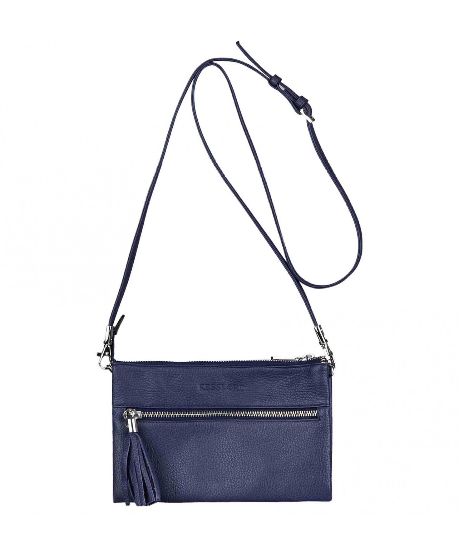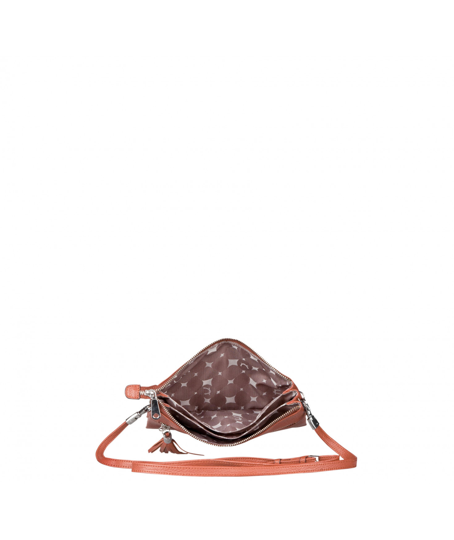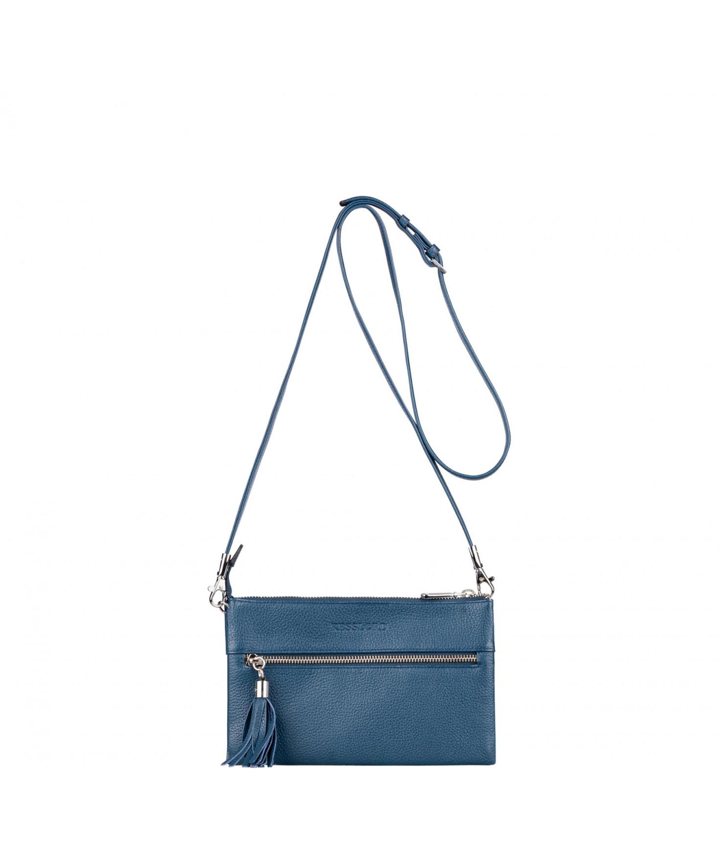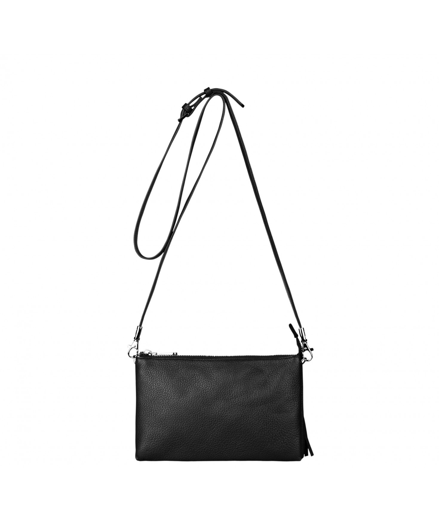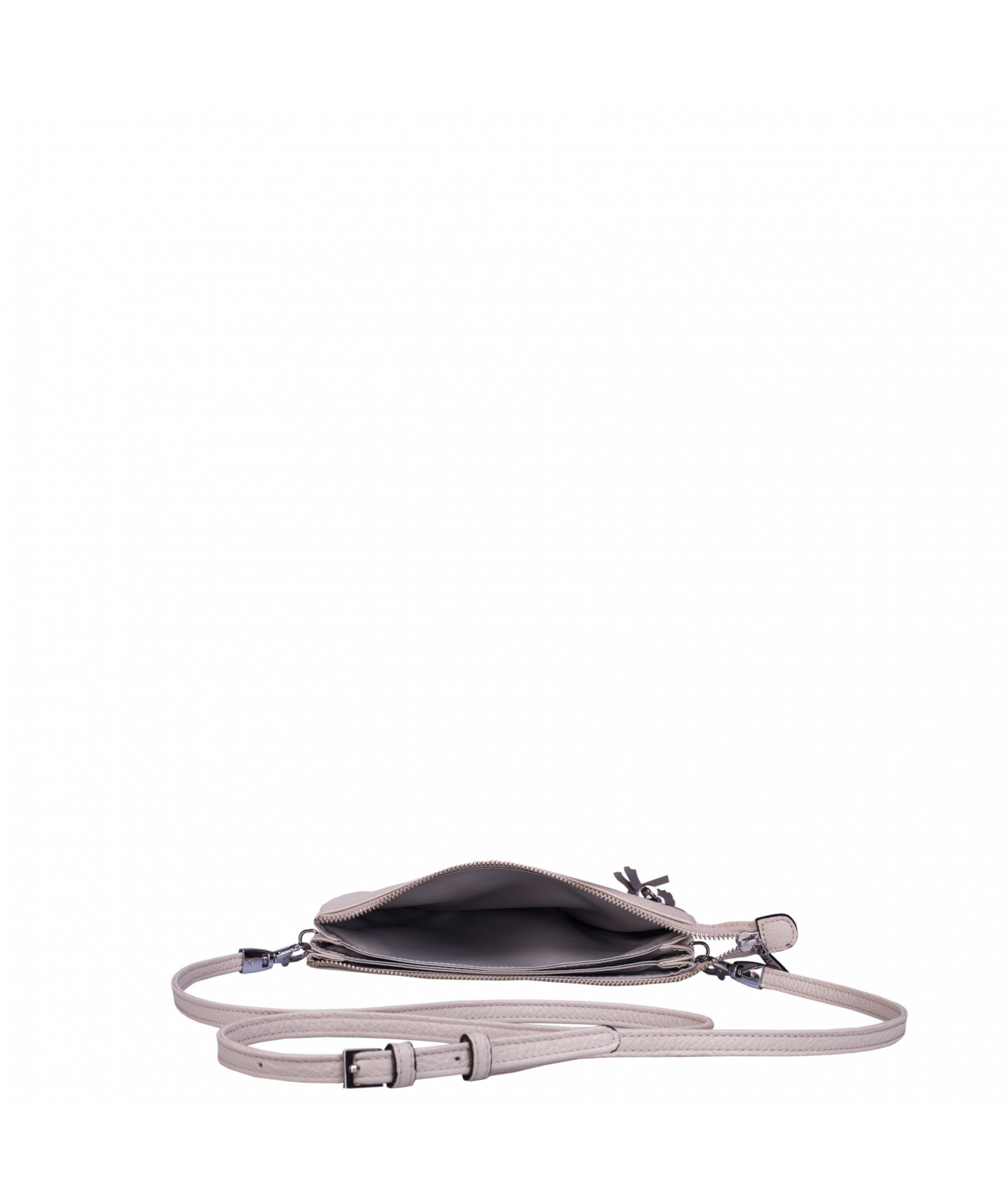 Pochette dotée de trois compartiments intérieurs. Fermeture à zip. Bandoulière réglable et amovible. Une poche extérieure zippée.