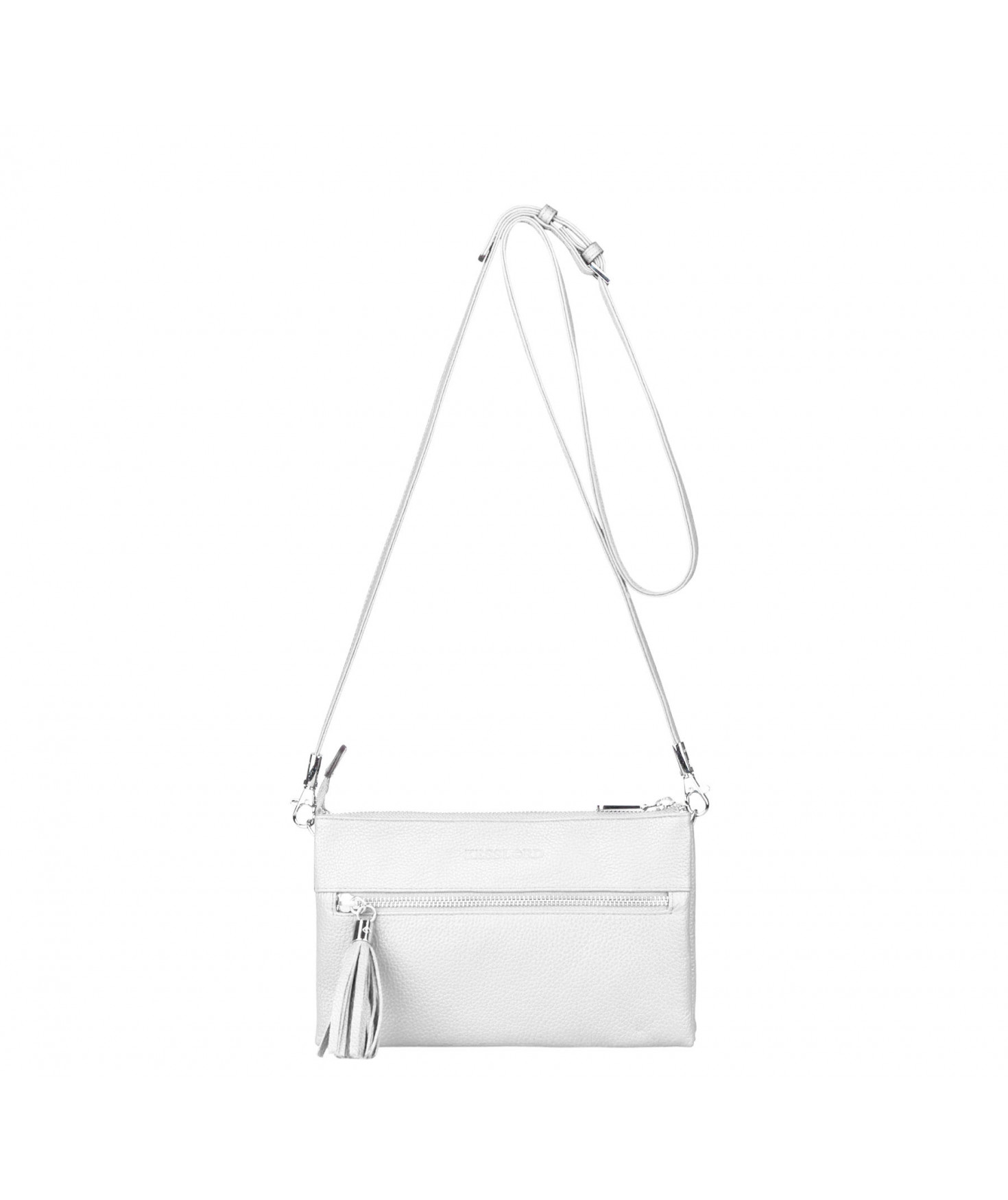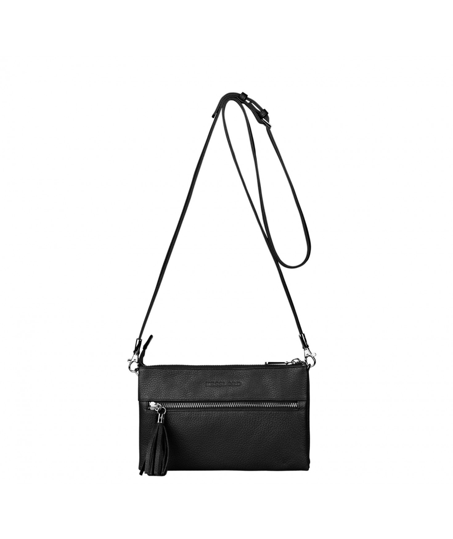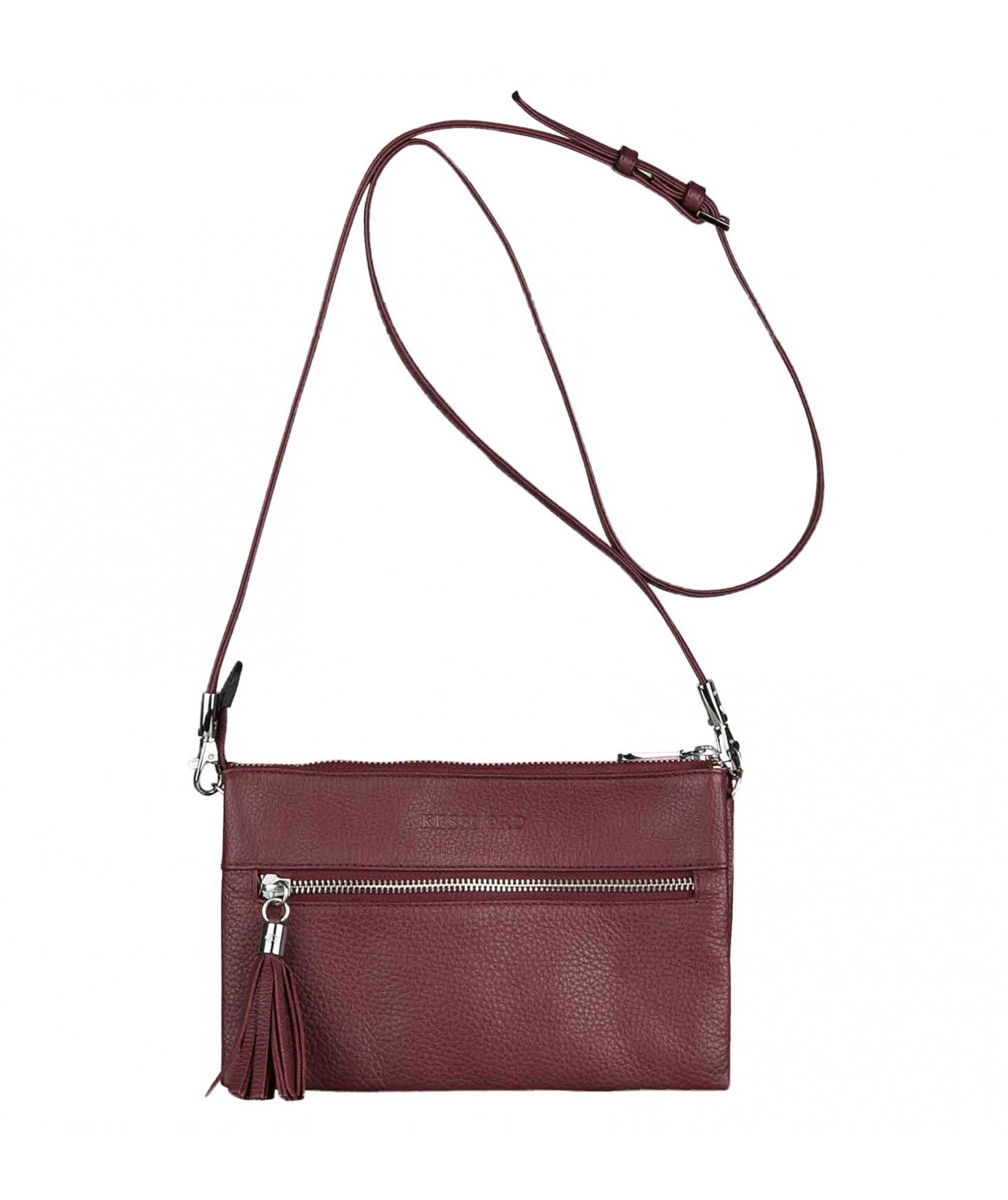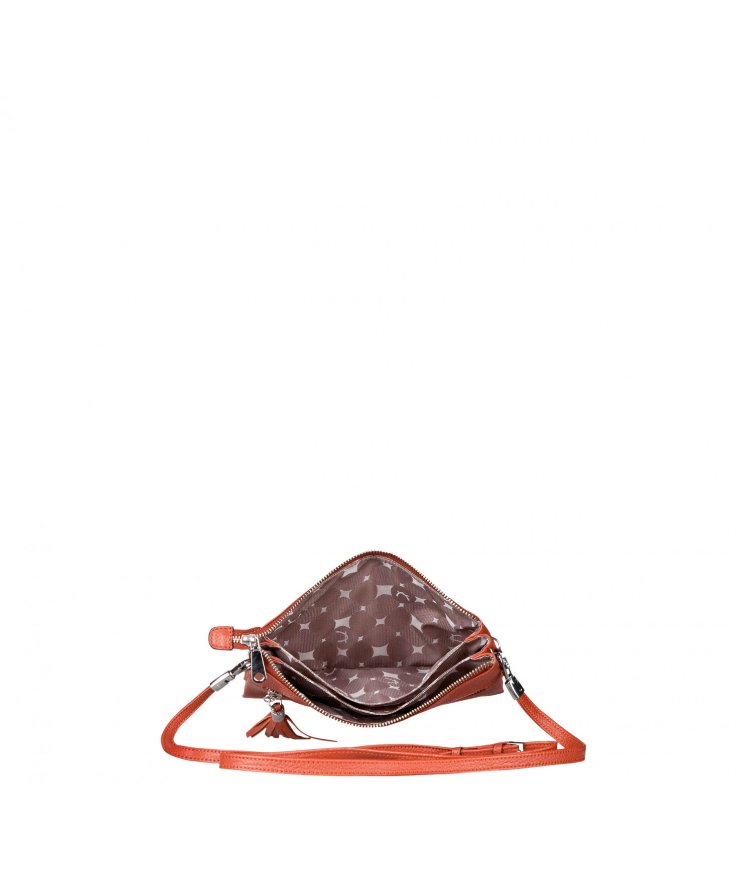 Pochette dotée de trois compartiments intérieurs. Fermeture à zip. Bandoulière réglable et amovible. Une poche extérieure zippée.