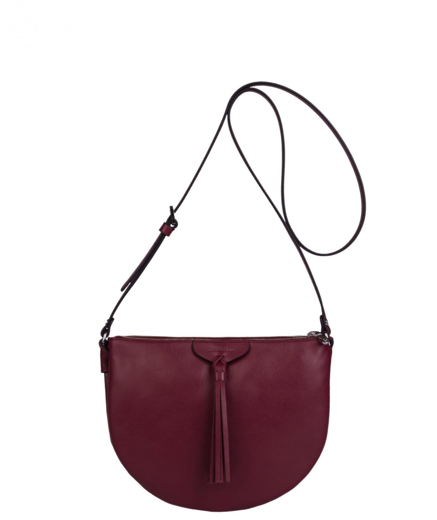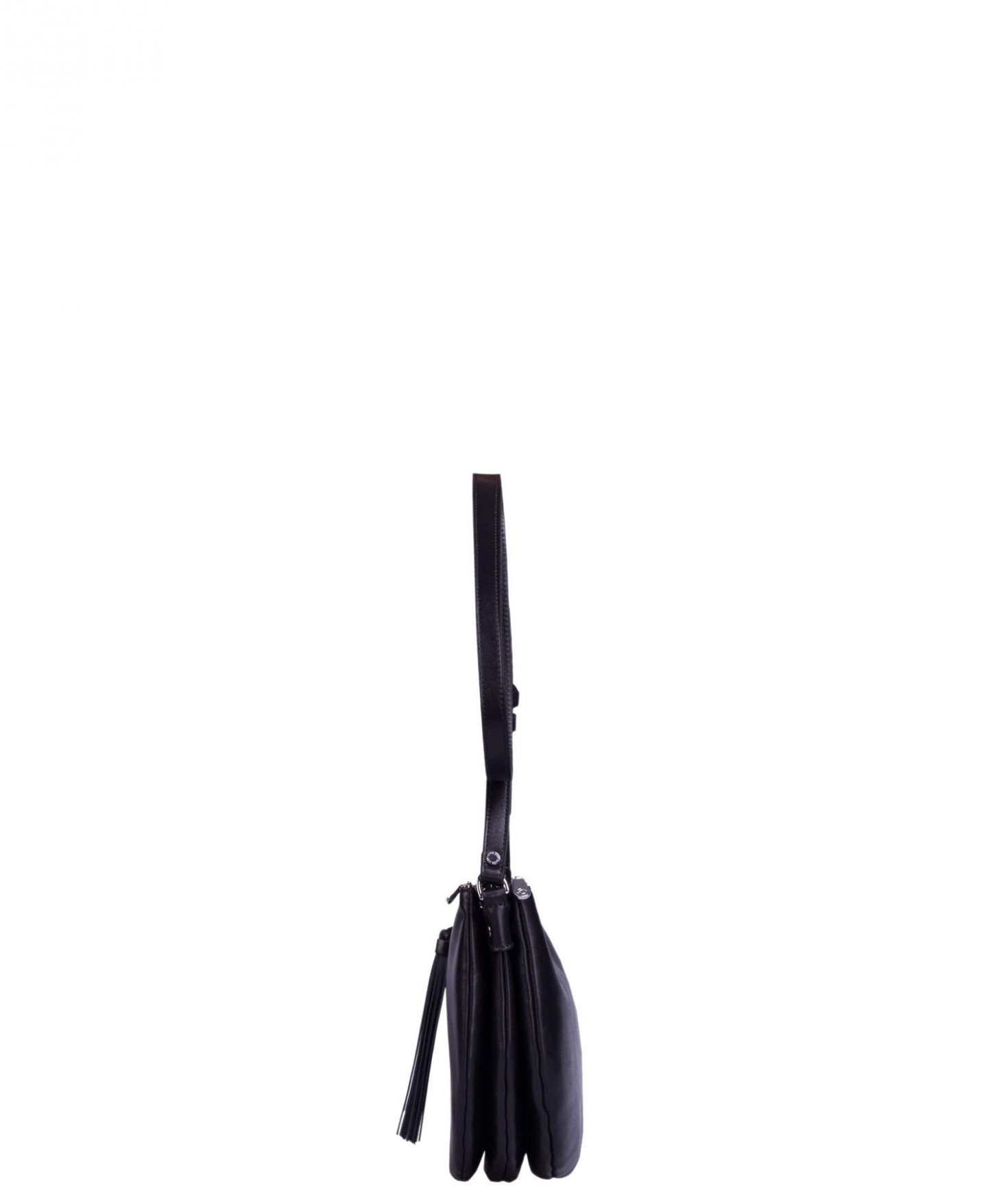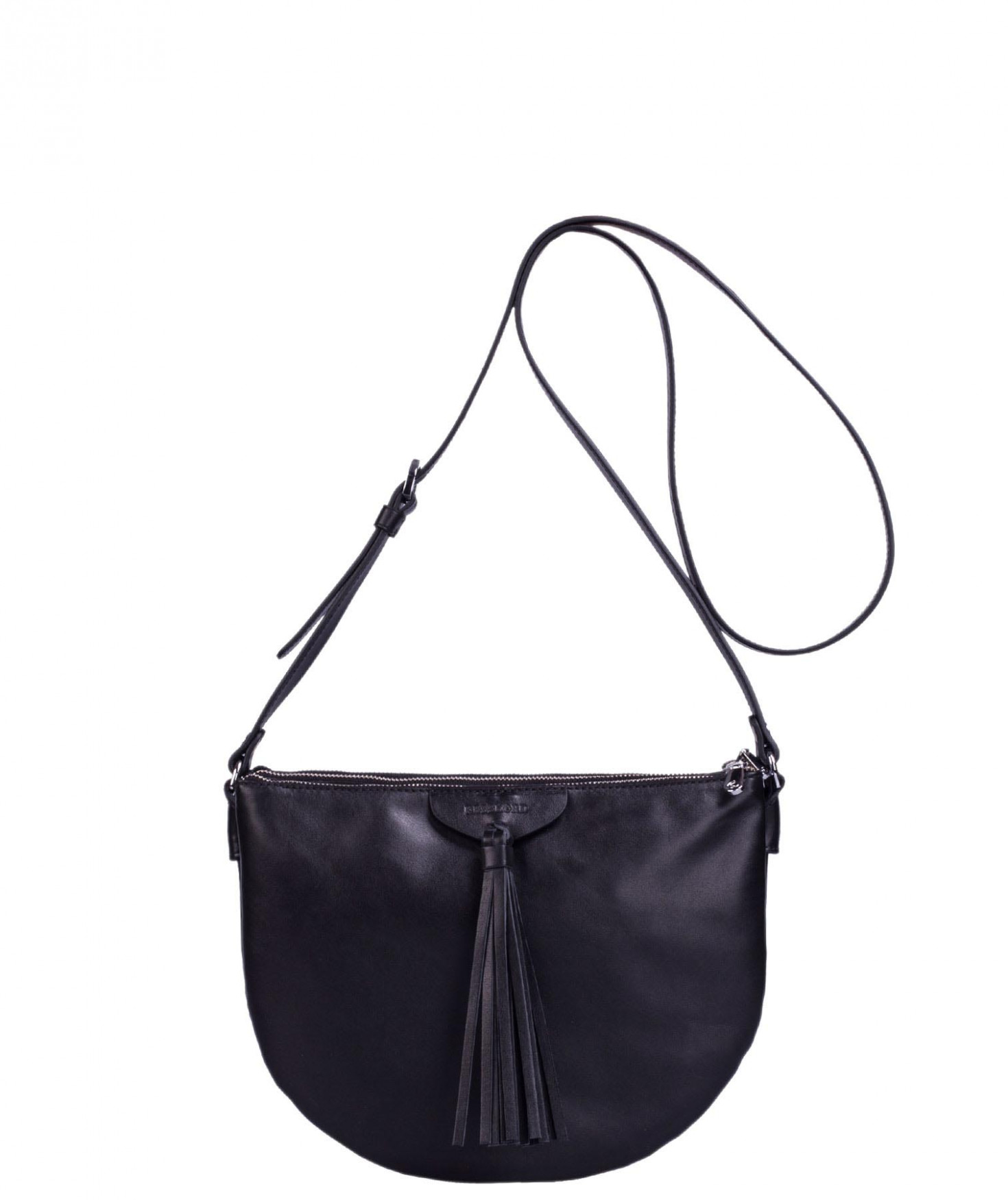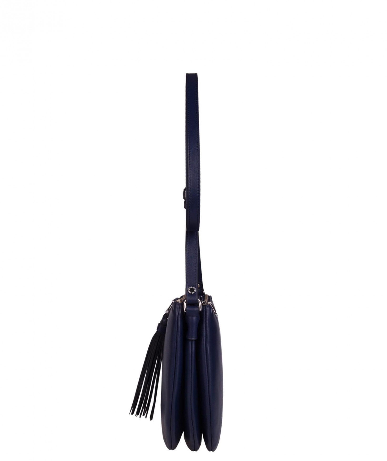 Besace portée épaule ou croisée grâce à sa bandoulière réglable. Trois compartiments fermés par des zips. Pompon à franges sur le devant. Bijouterie finition argentée.