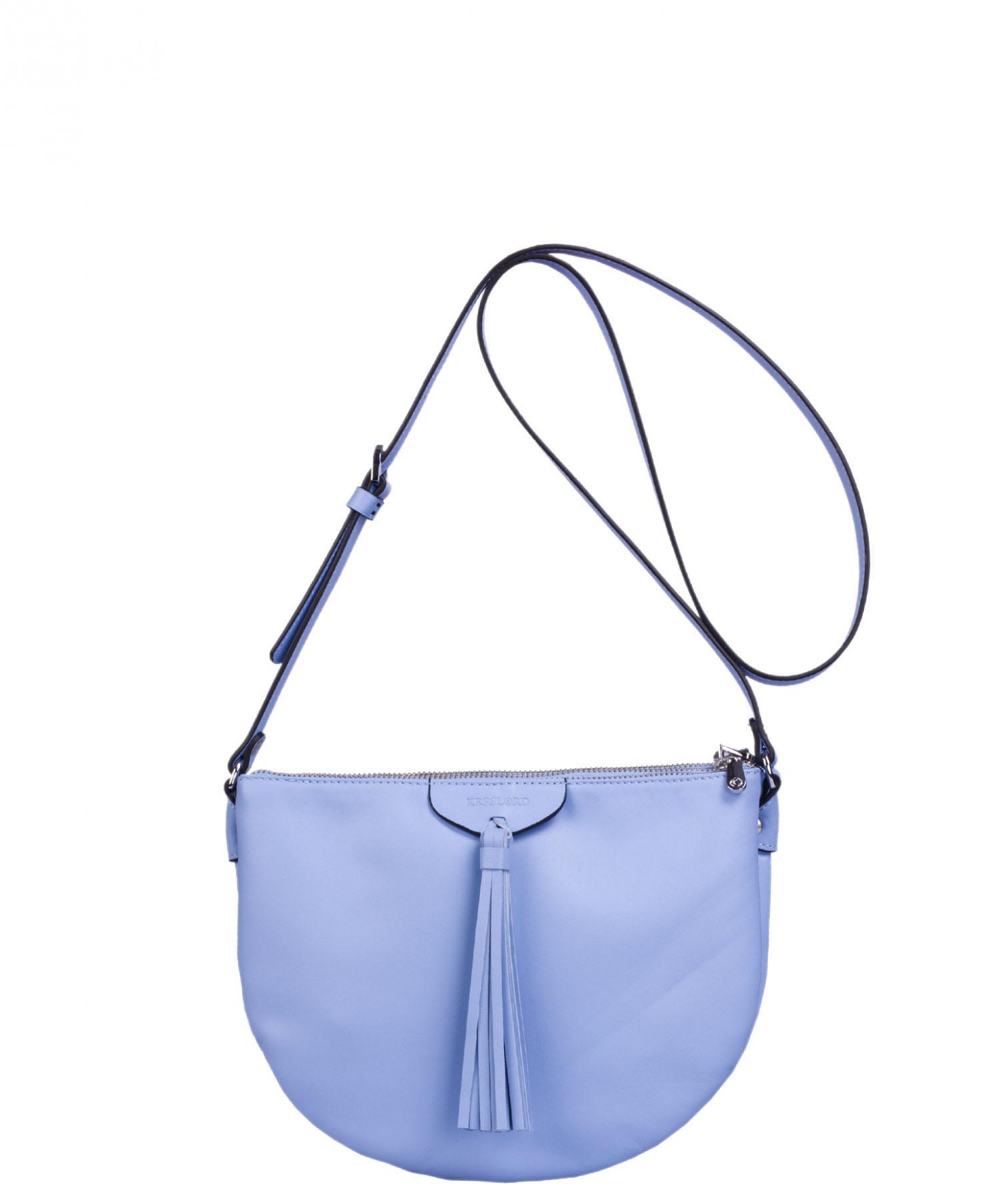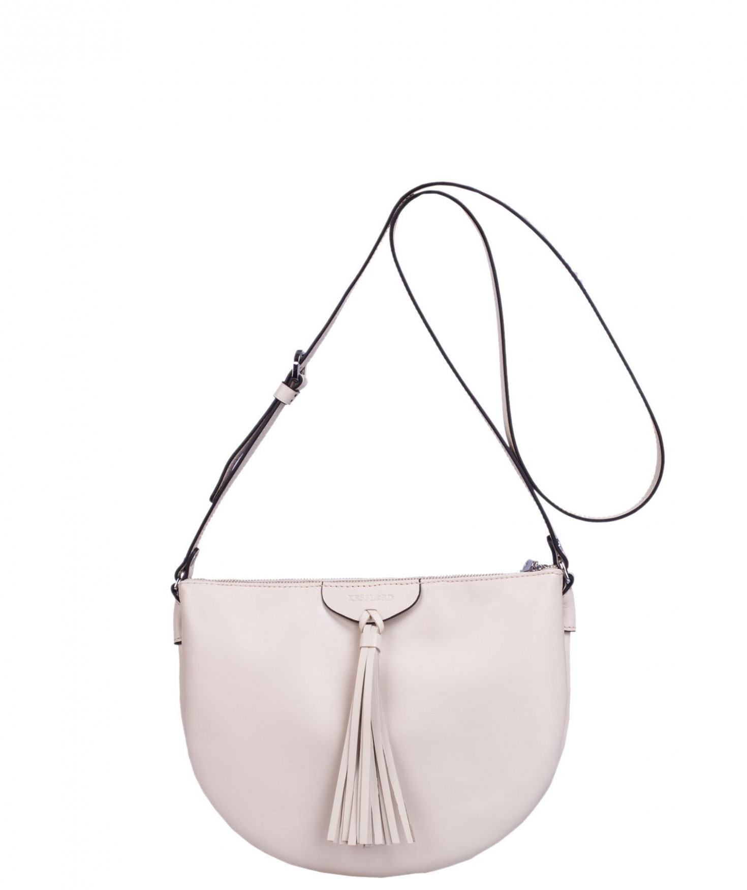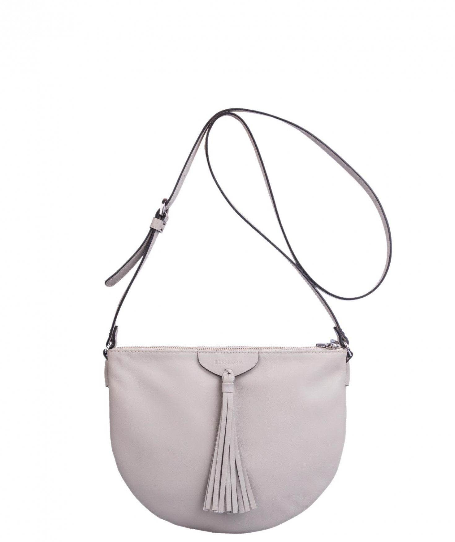 Besace portée épaule ou croisée grâce à sa bandoulière réglable. Trois compartiments fermés par des zips. Pompon à franges sur le devant. Bijouterie finition argentée.