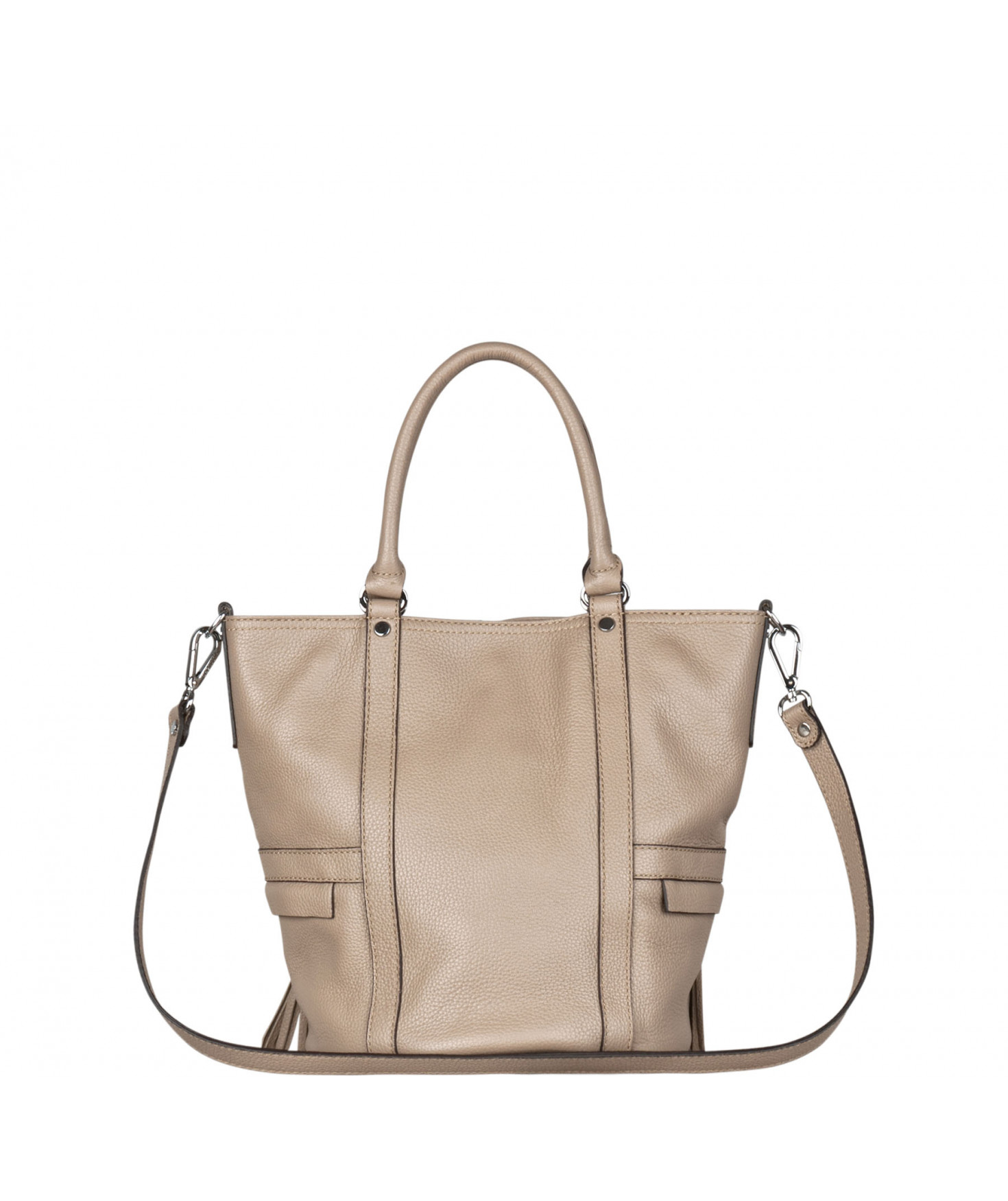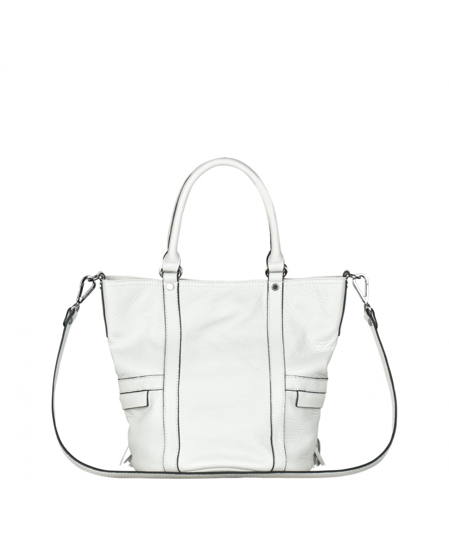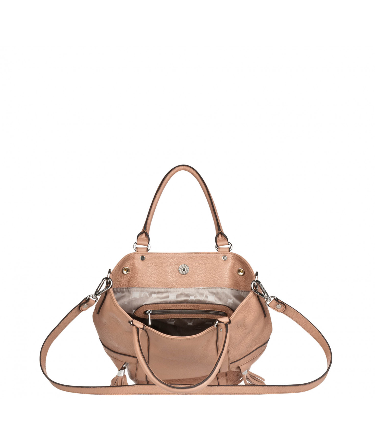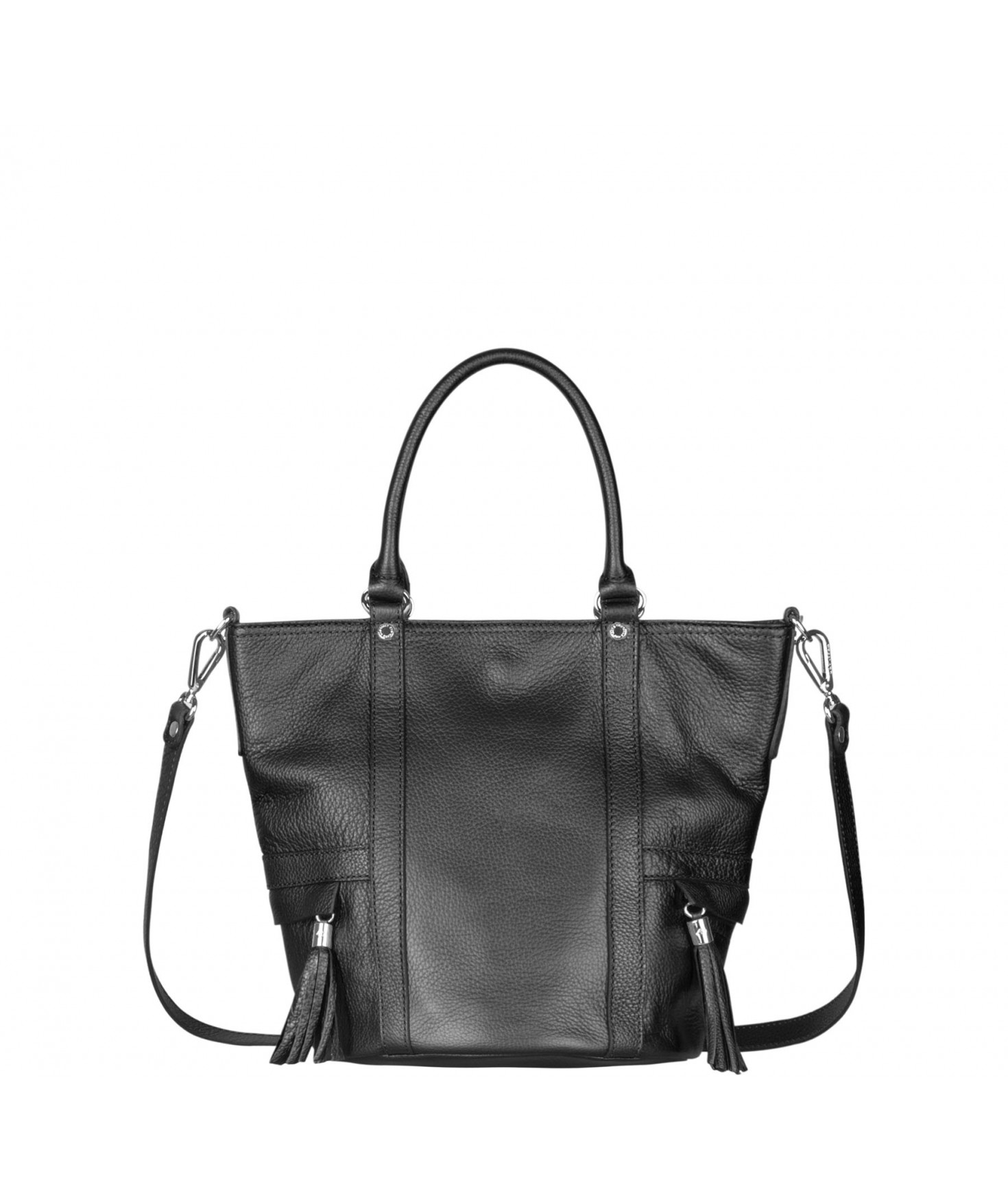 Sac seau porté épaule, fermé par magnétique, deux anses et une bandoulière amovible.