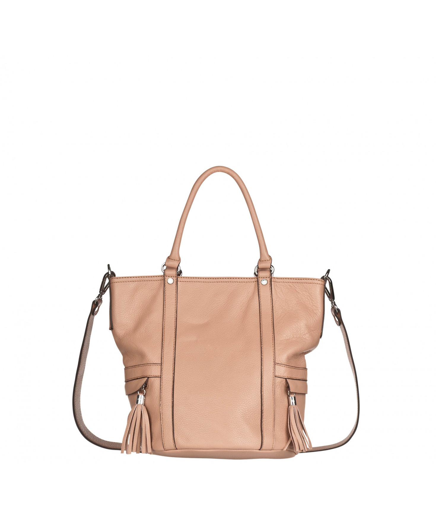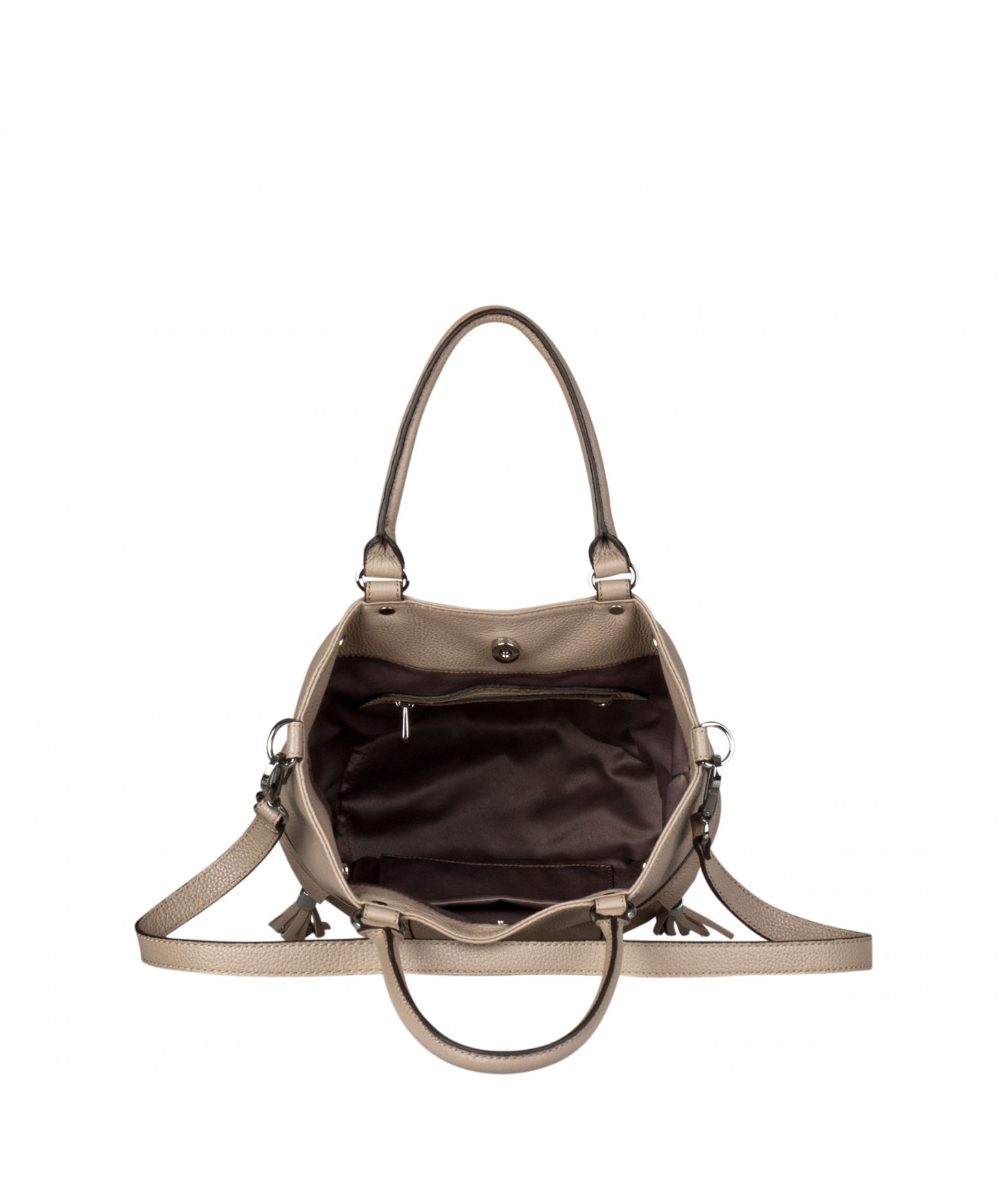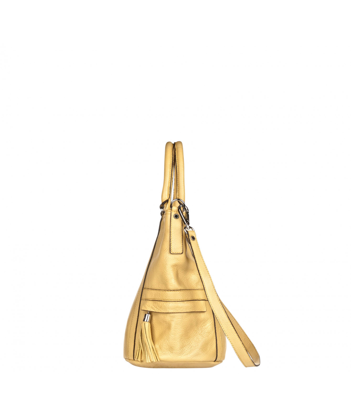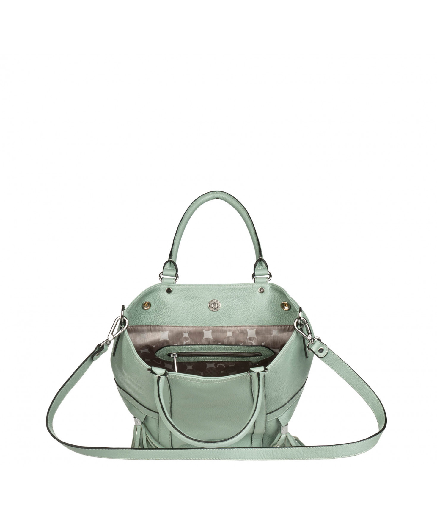 Sac seau porté épaule, fermé par magnétique, deux anses et une bandoulière amovible.