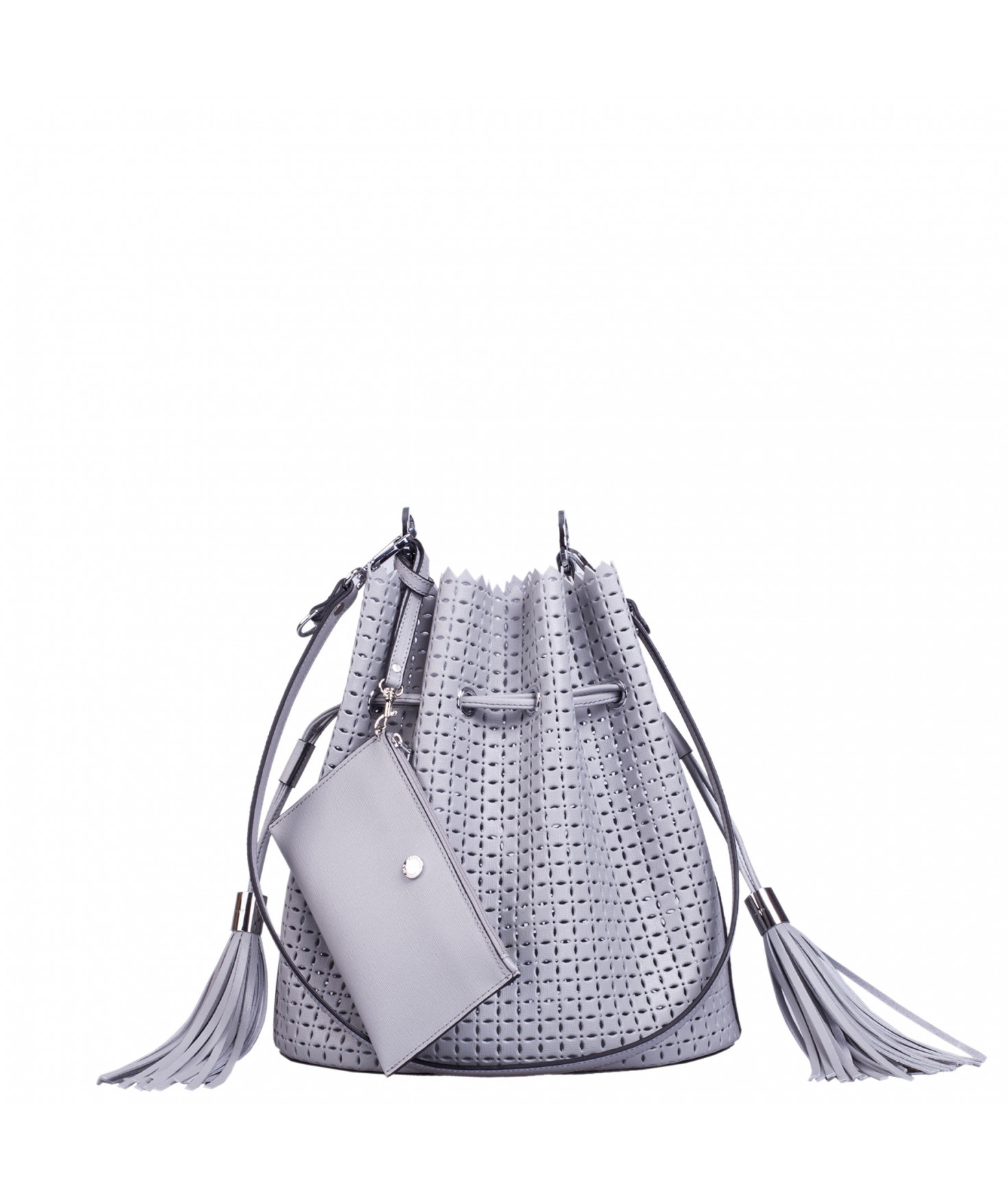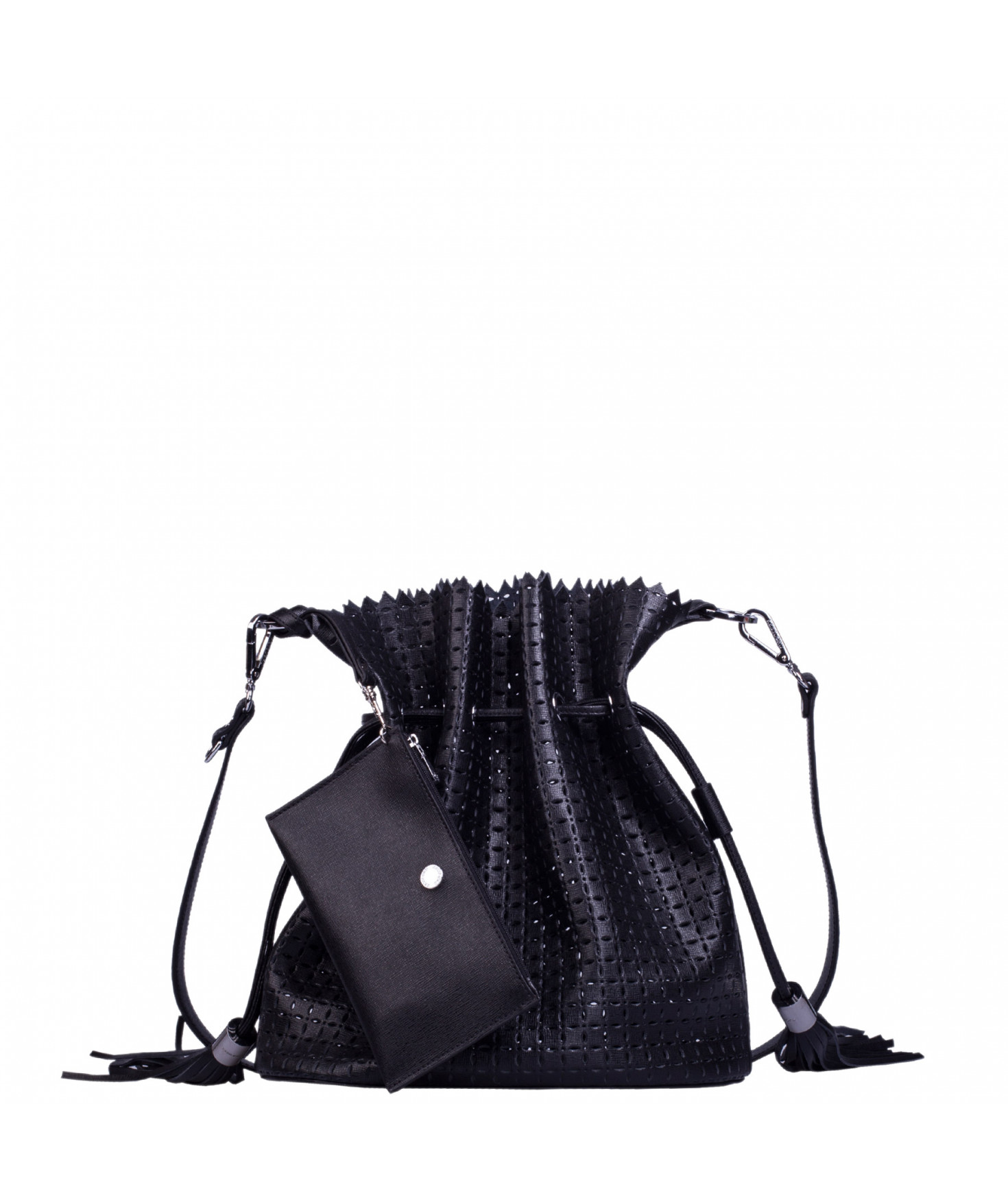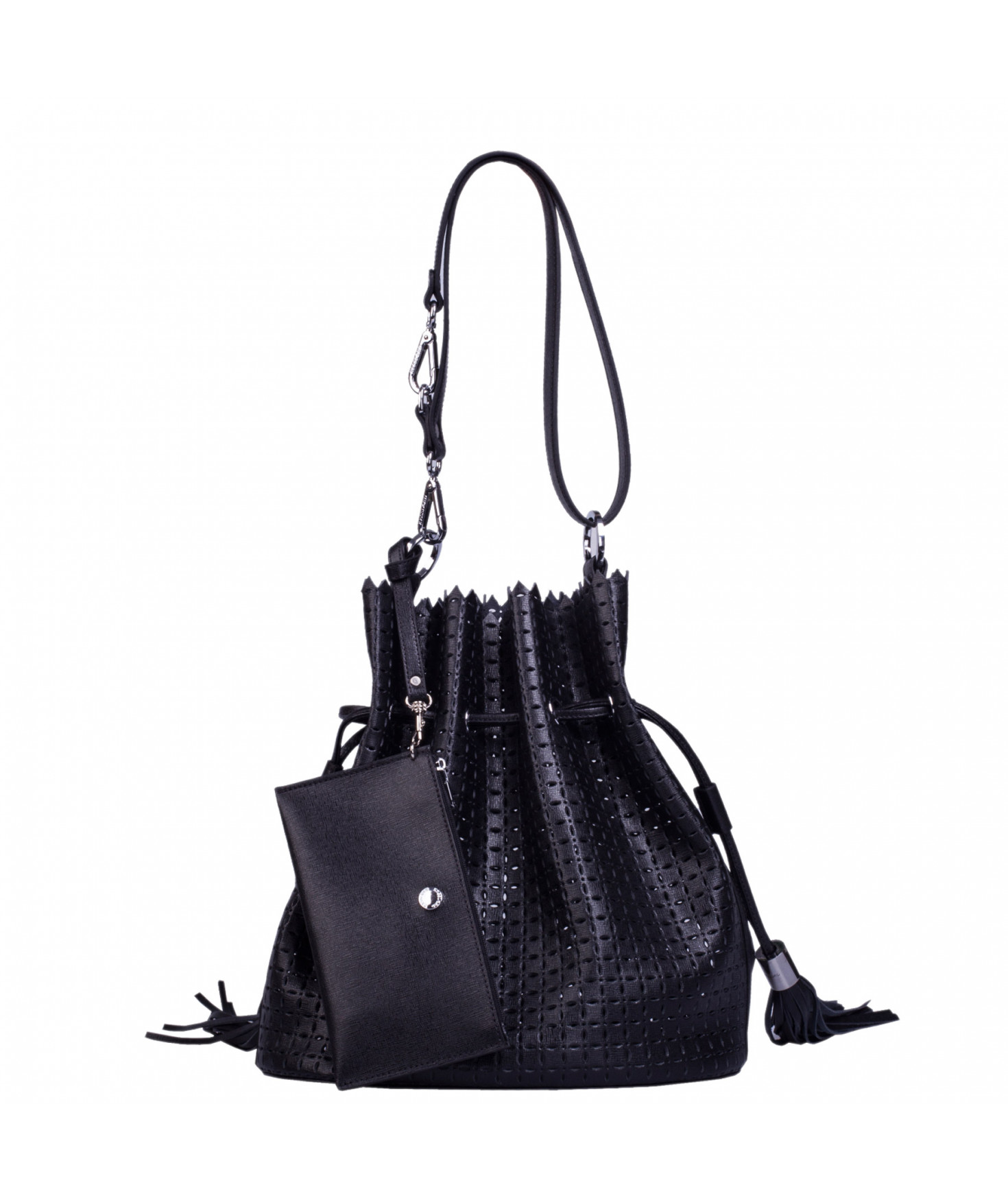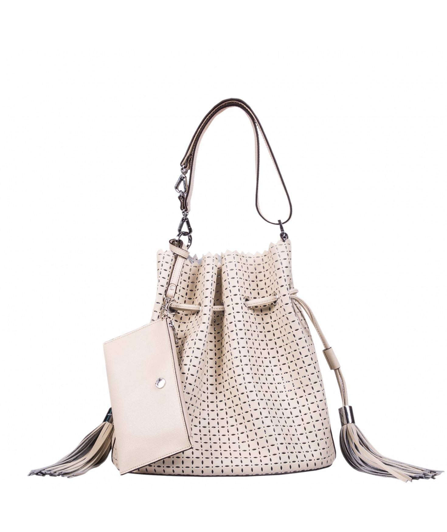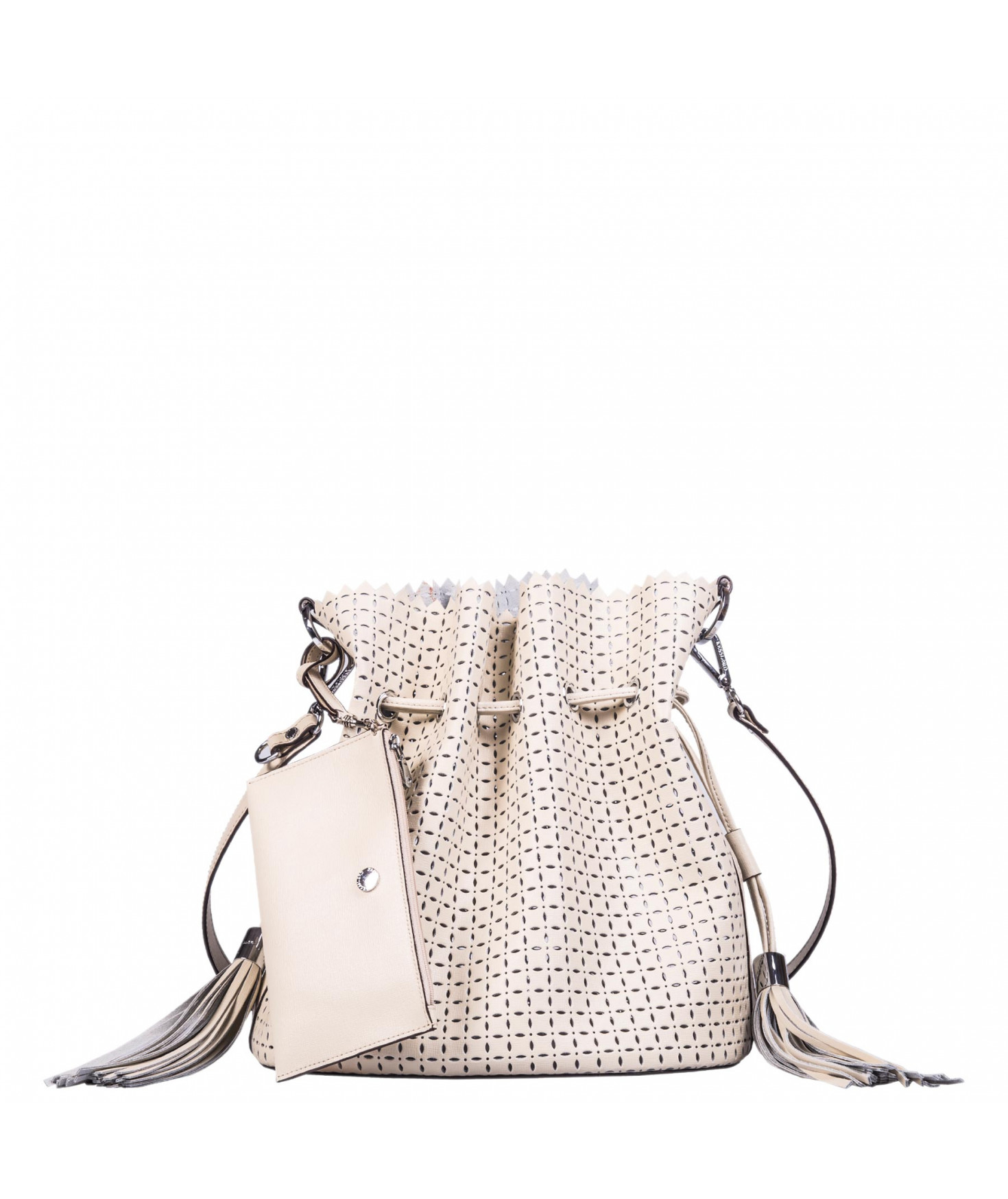 Sac porté main ou épaule court. Fermeture par un lien coulissant à franges. Dotée d'une pochette zippée et amovible grâce à son lien et son mousqueton. Bijouterie en métal finition argentée.