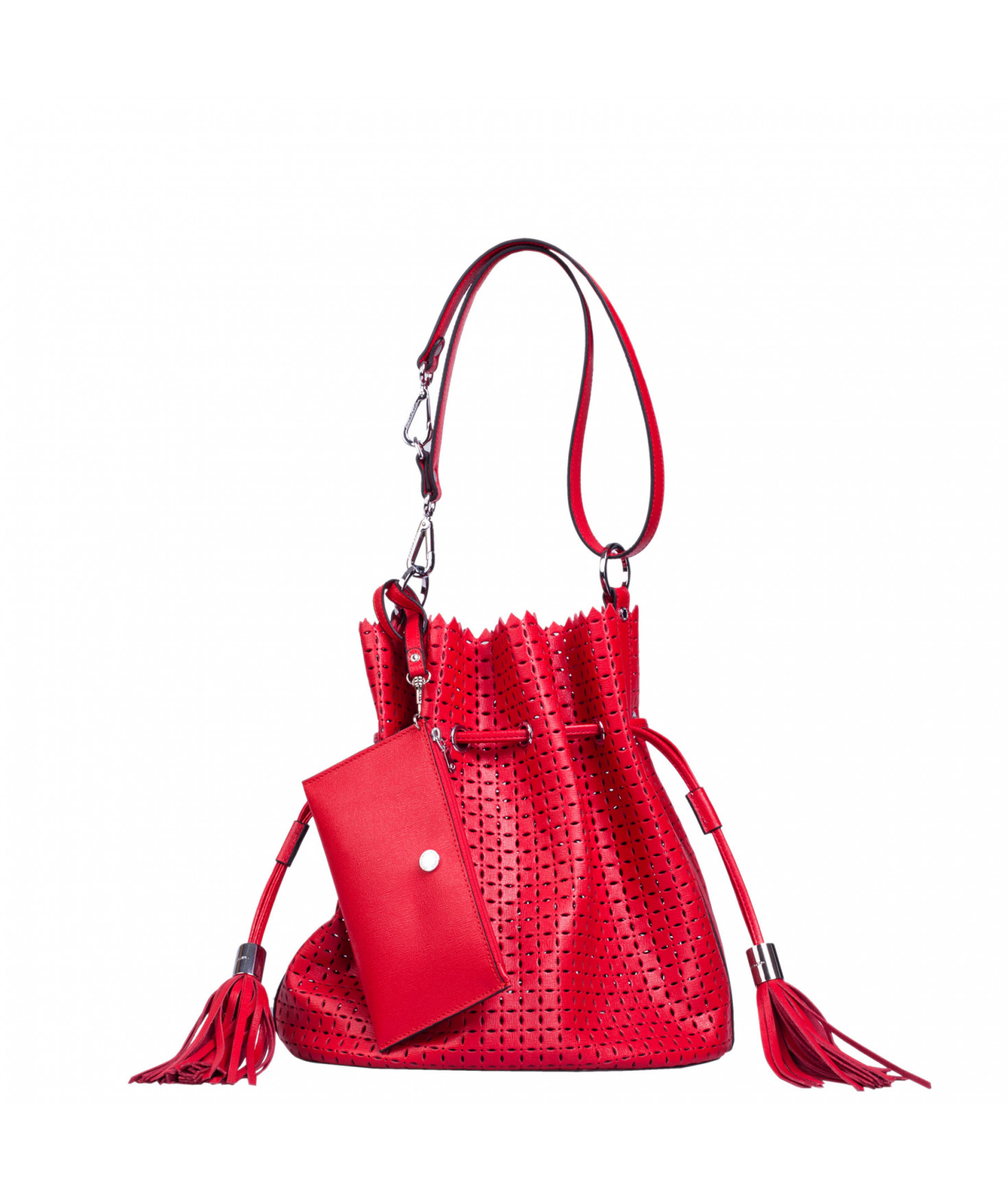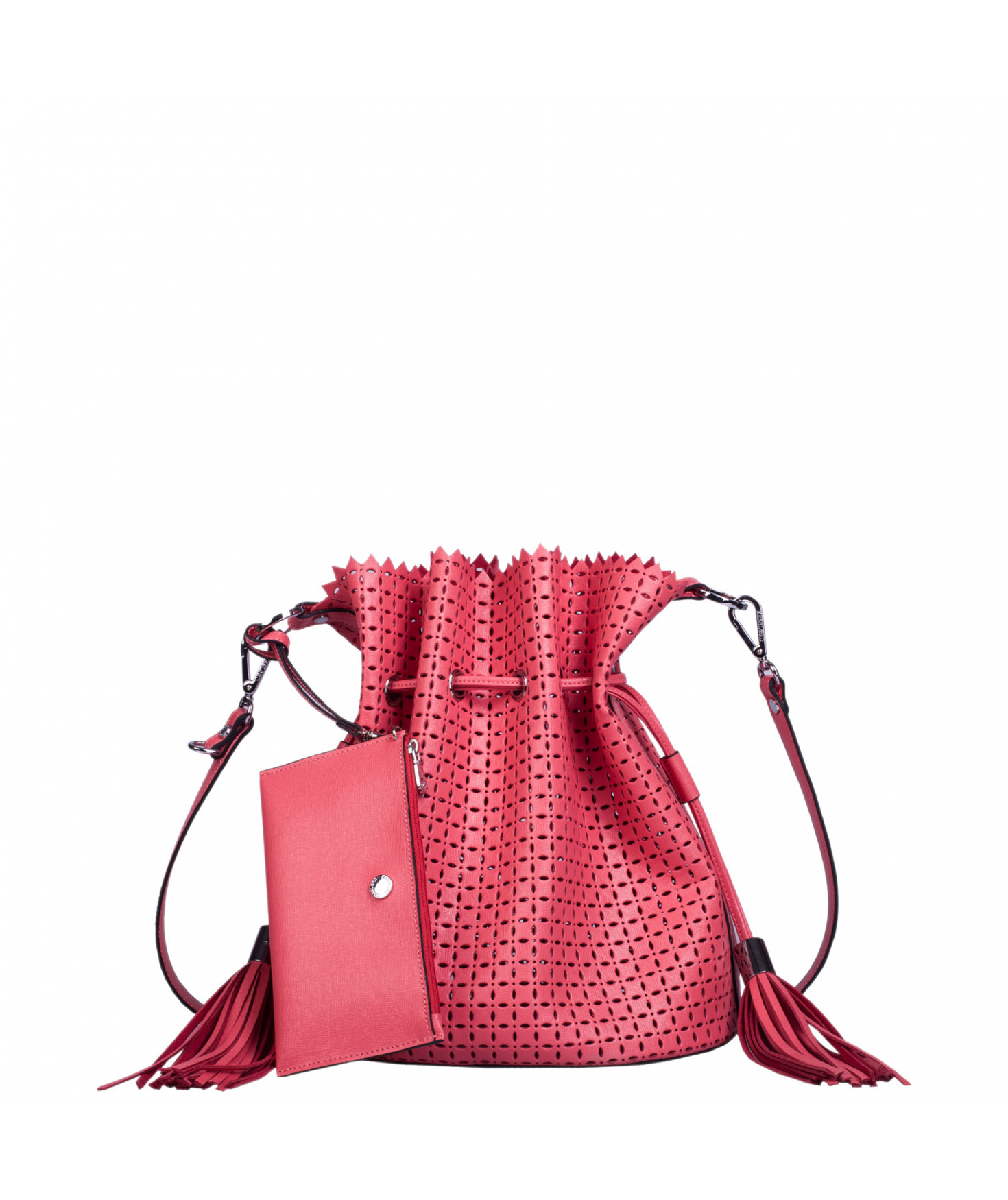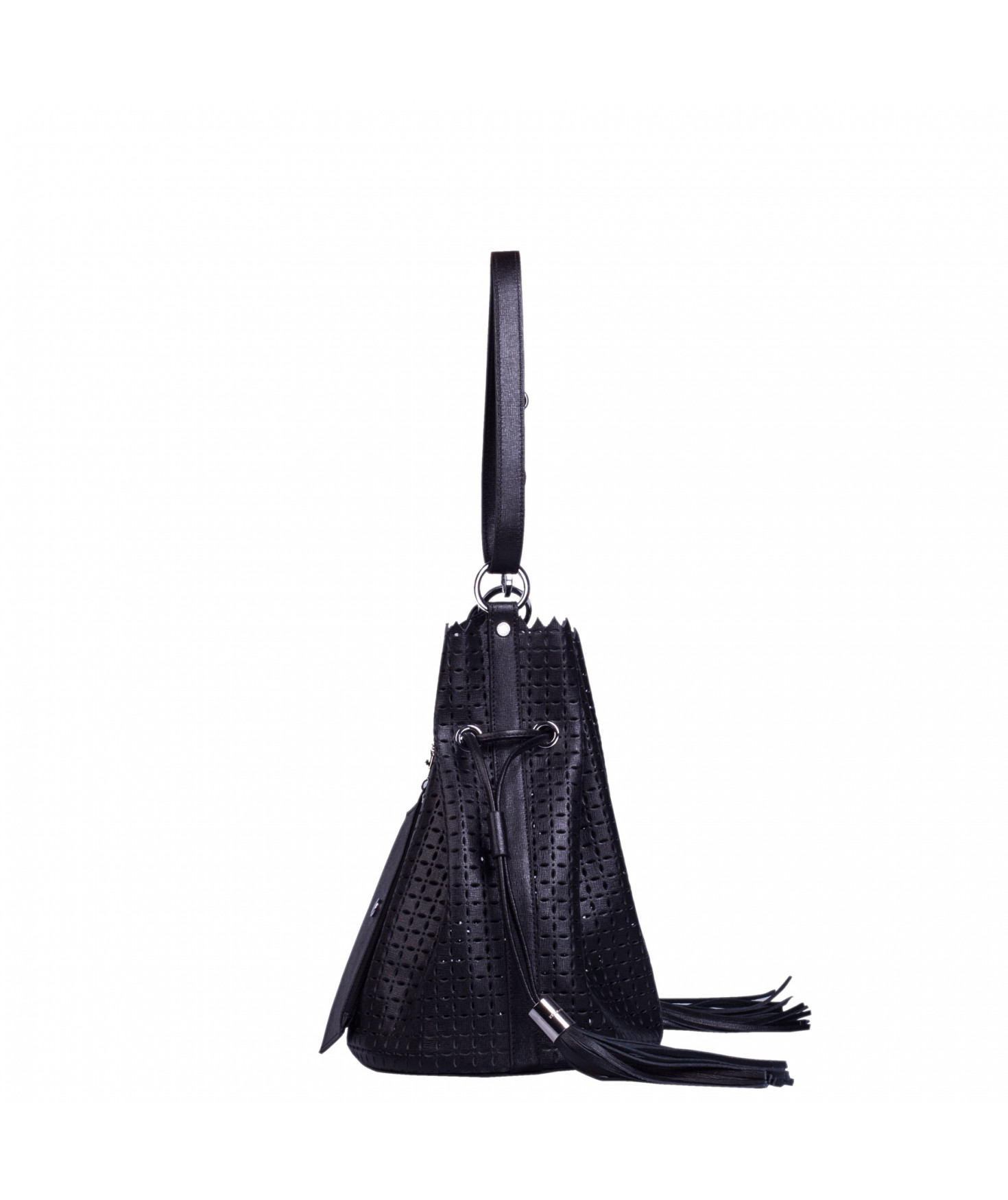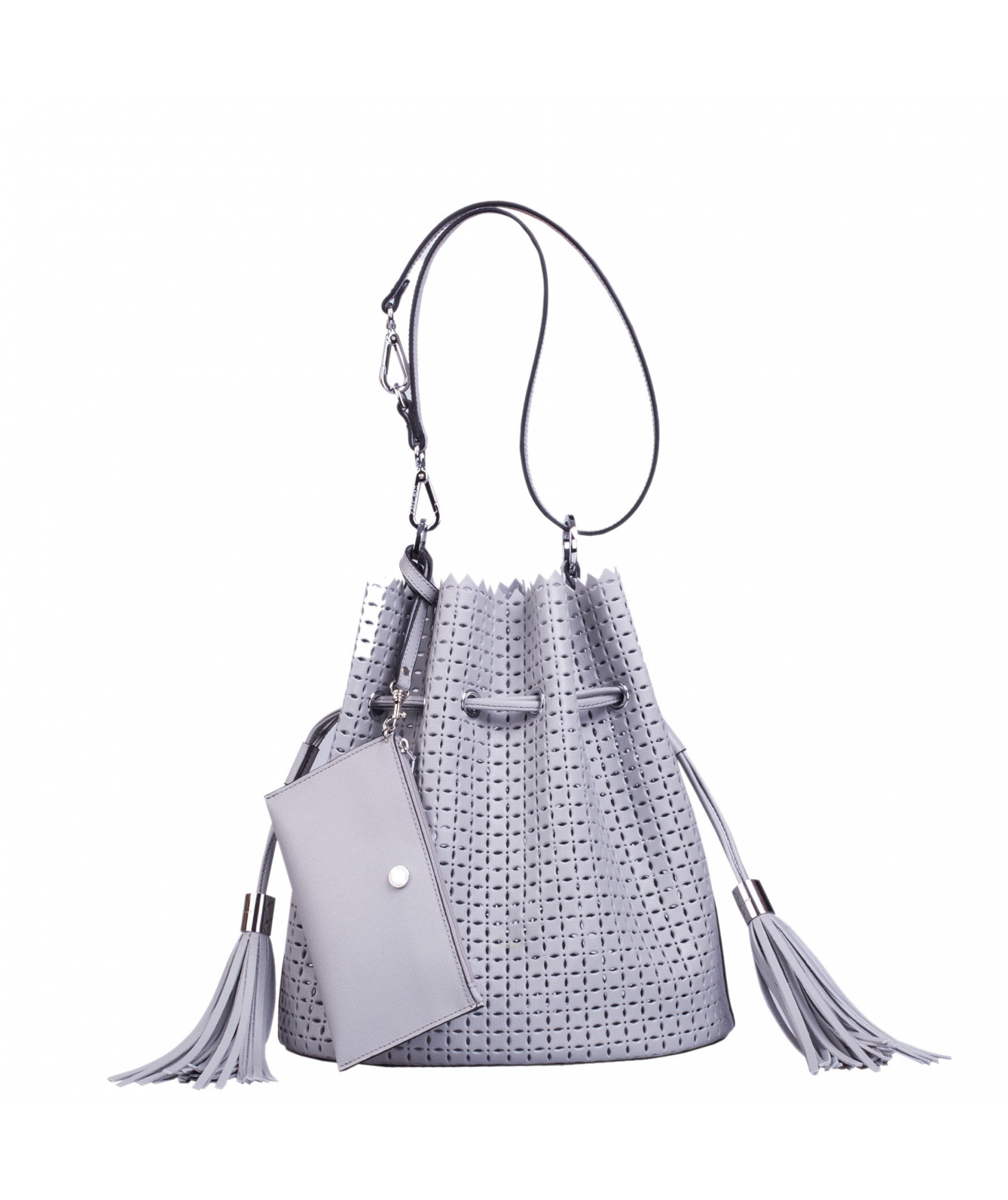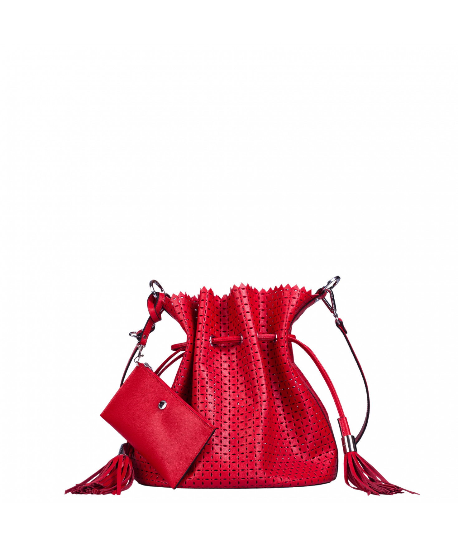 Sac porté main ou épaule court. Fermeture par un lien coulissant à franges. Dotée d'une pochette zippée et amovible grâce à son lien et son mousqueton. Bijouterie en métal finition argentée.