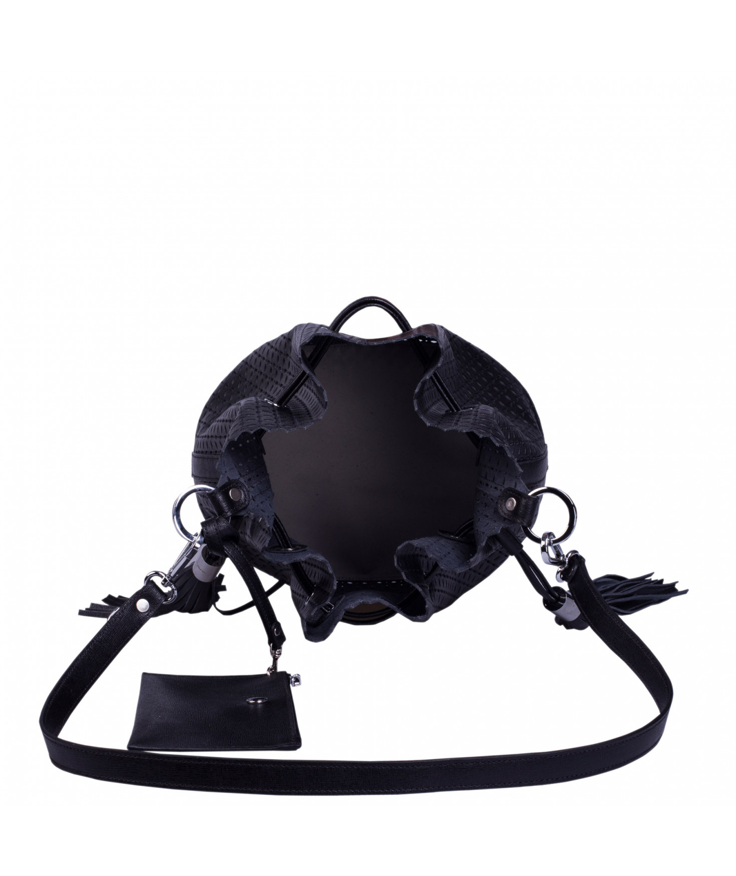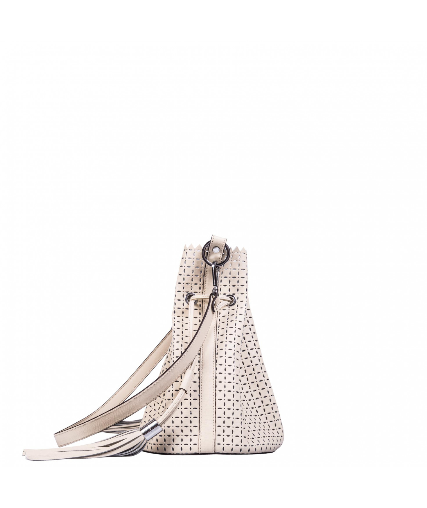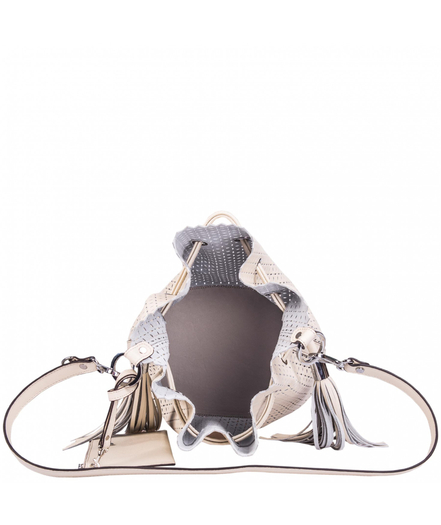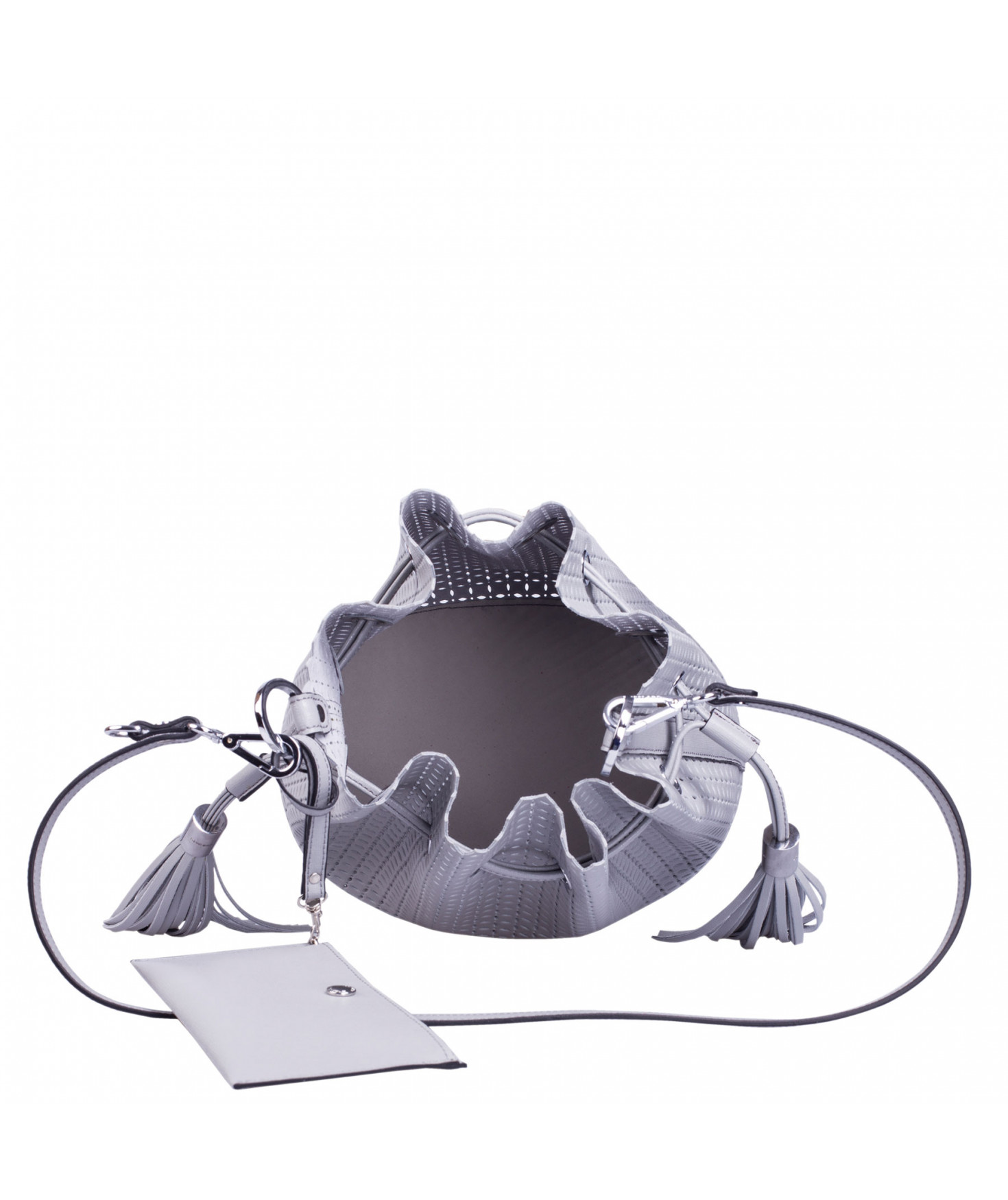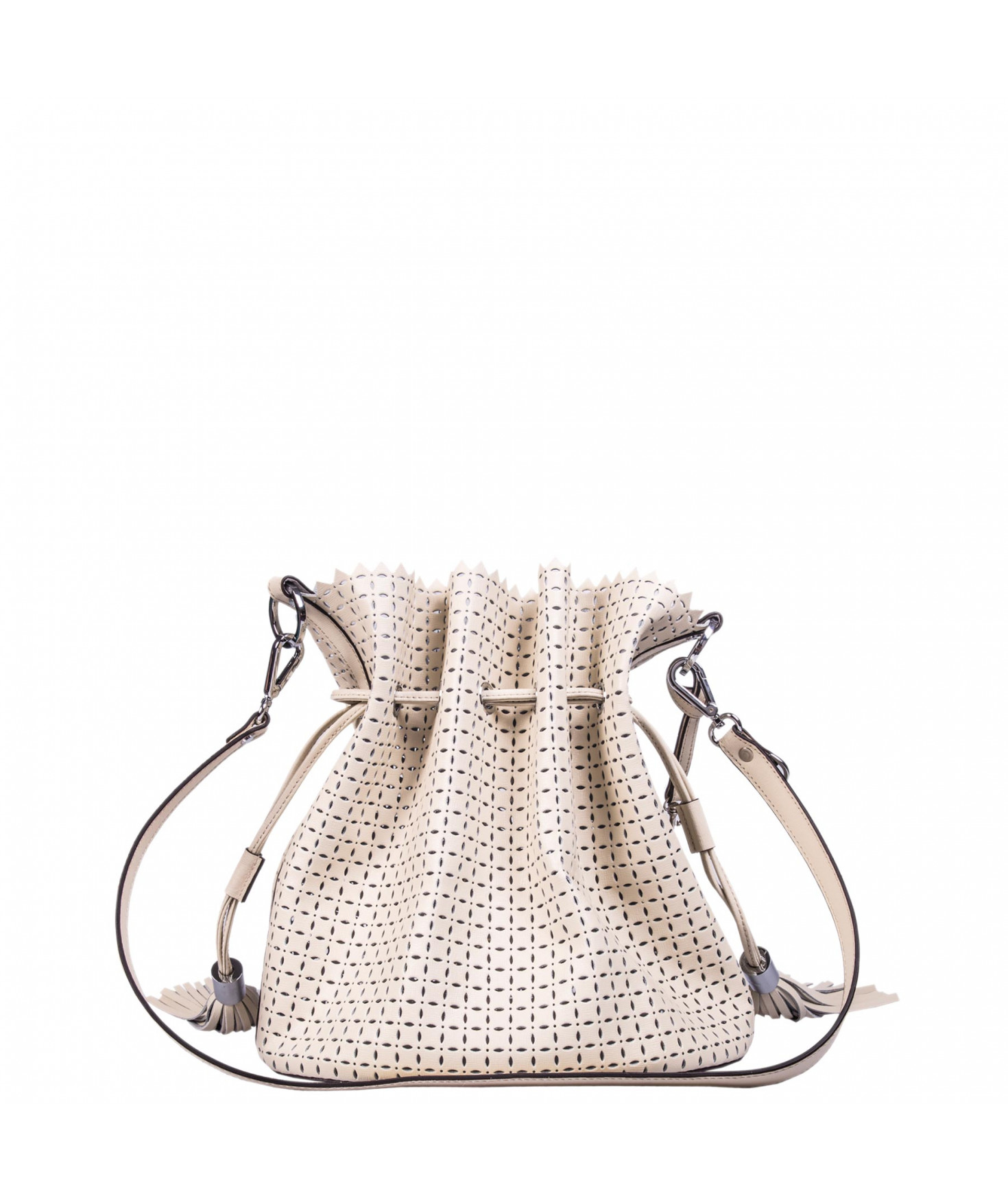 Sac porté main ou épaule court. Fermeture par un lien coulissant à franges. Dotée d'une pochette zippée et amovible grâce à son lien et son mousqueton. Bijouterie en métal finition argentée.