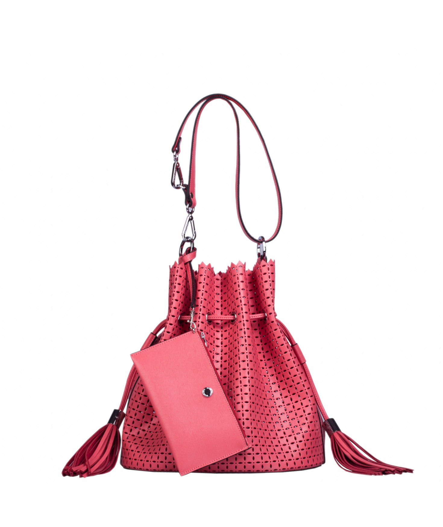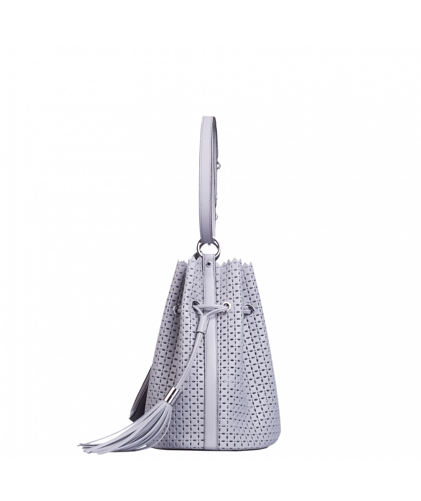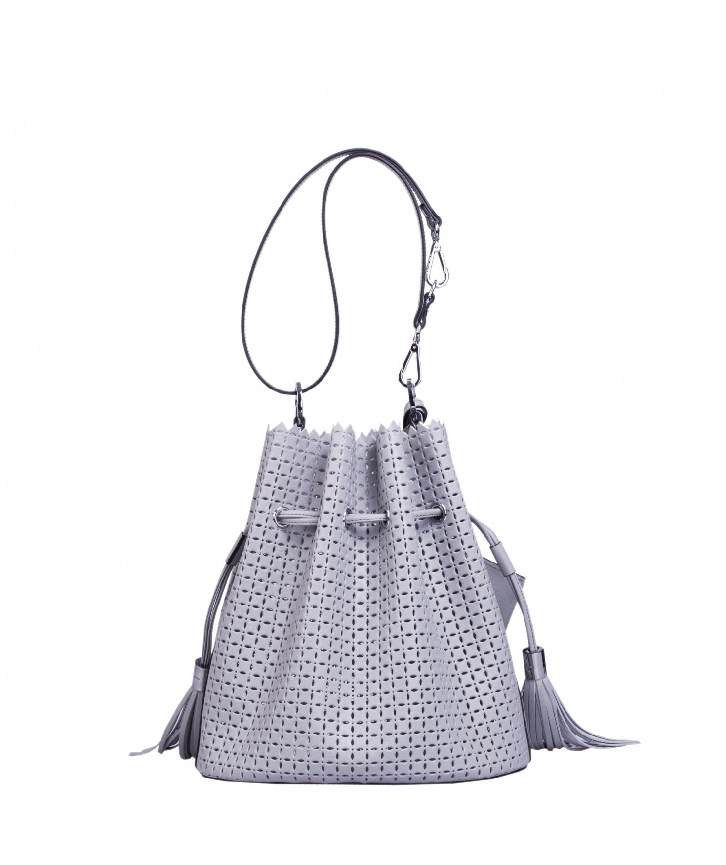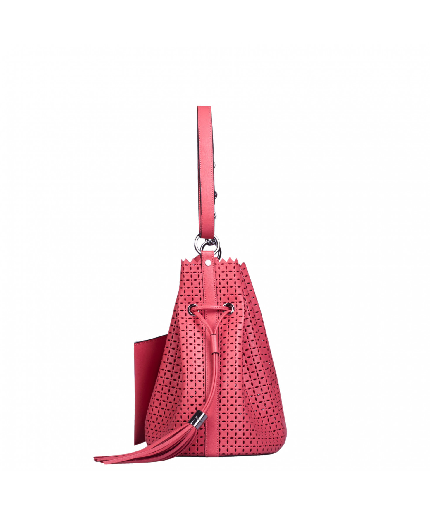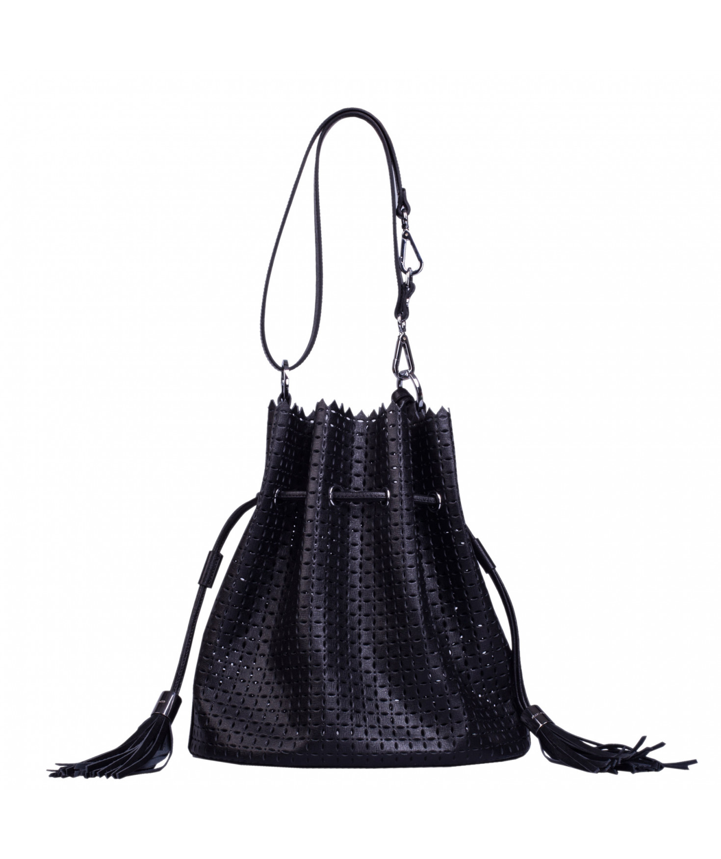Sac porté main ou épaule court. Fermeture par un lien coulissant à franges. Dotée d'une pochette zippée et amovible grâce à son lien et son mousqueton. Bijouterie en métal finition argentée.