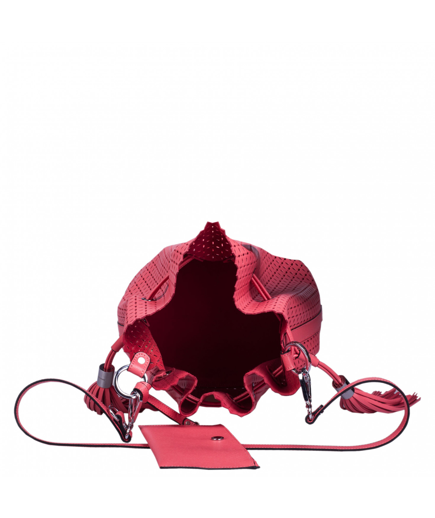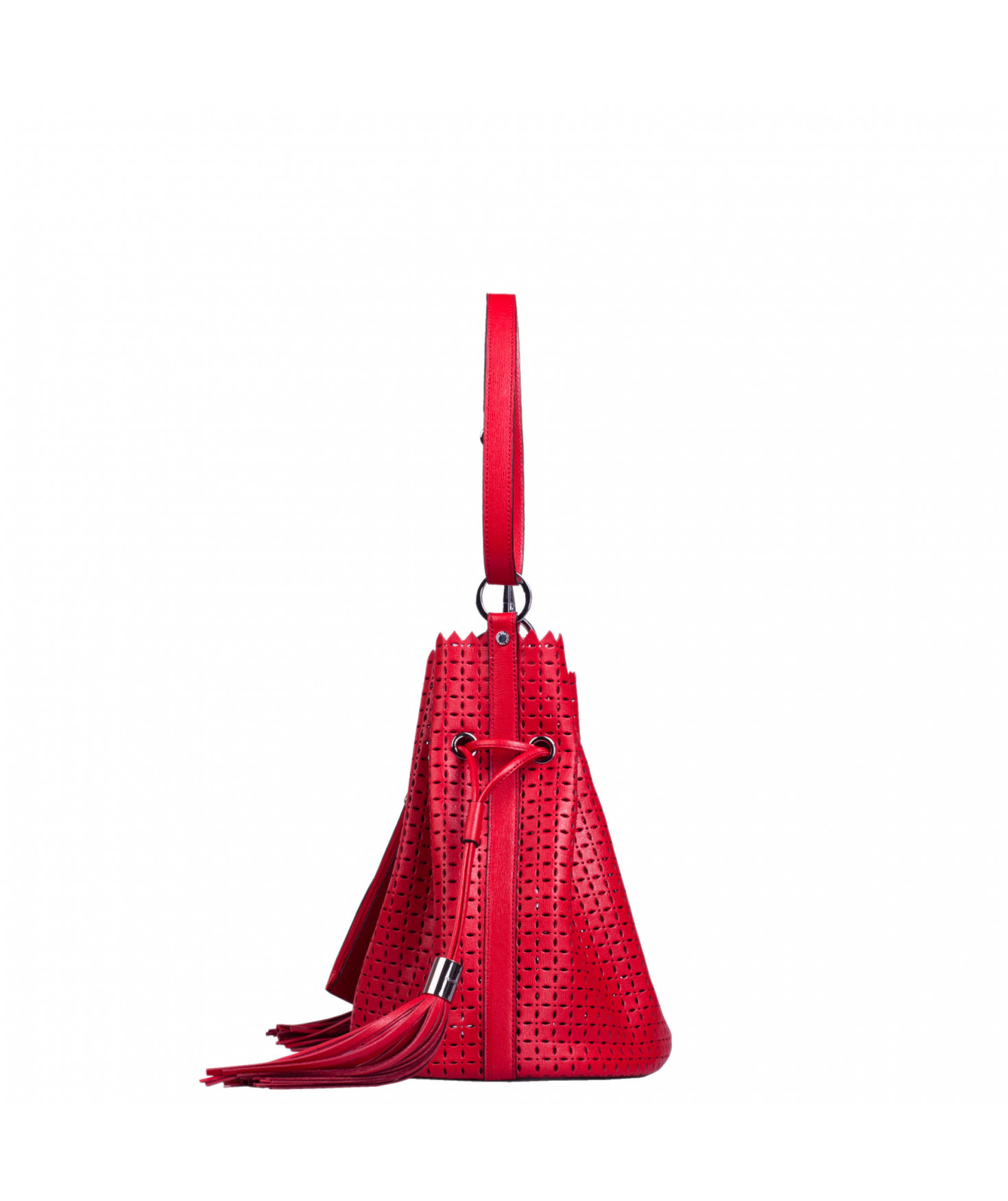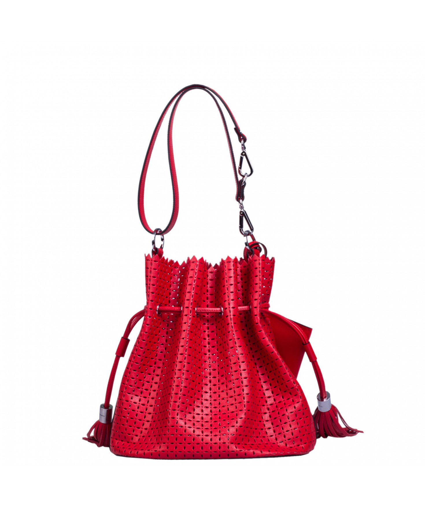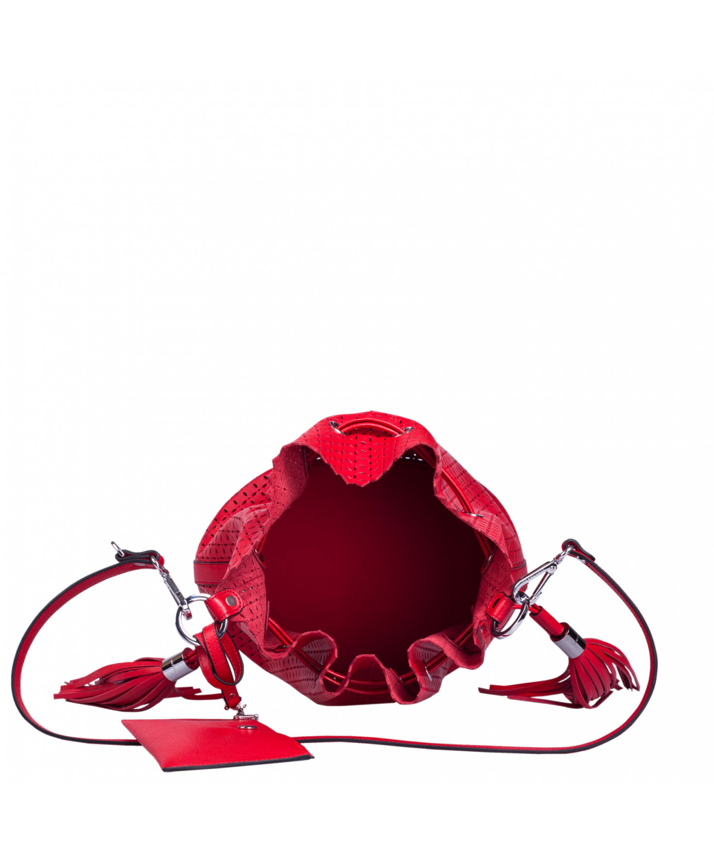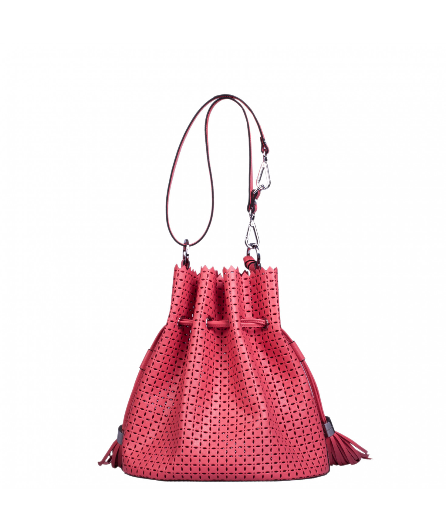 Sac porté main ou épaule court. Fermeture par un lien coulissant à franges. Dotée d'une pochette zippée et amovible grâce à son lien et son mousqueton. Bijouterie en métal finition argentée.