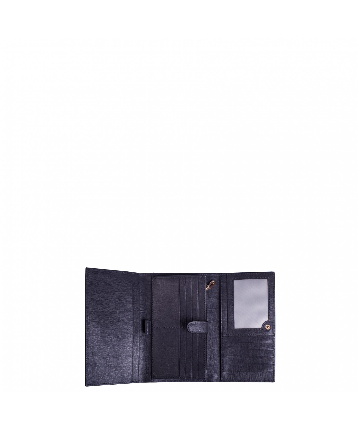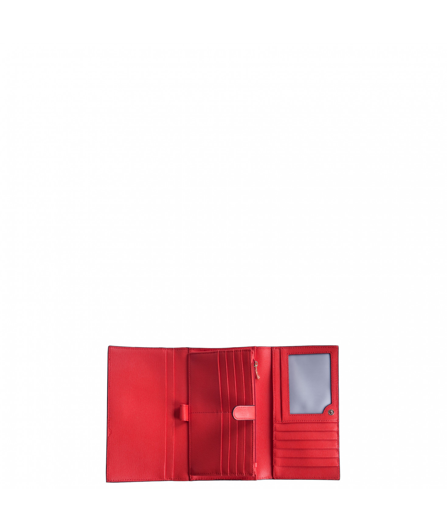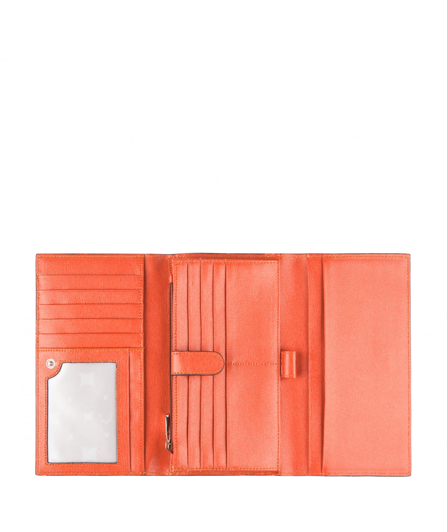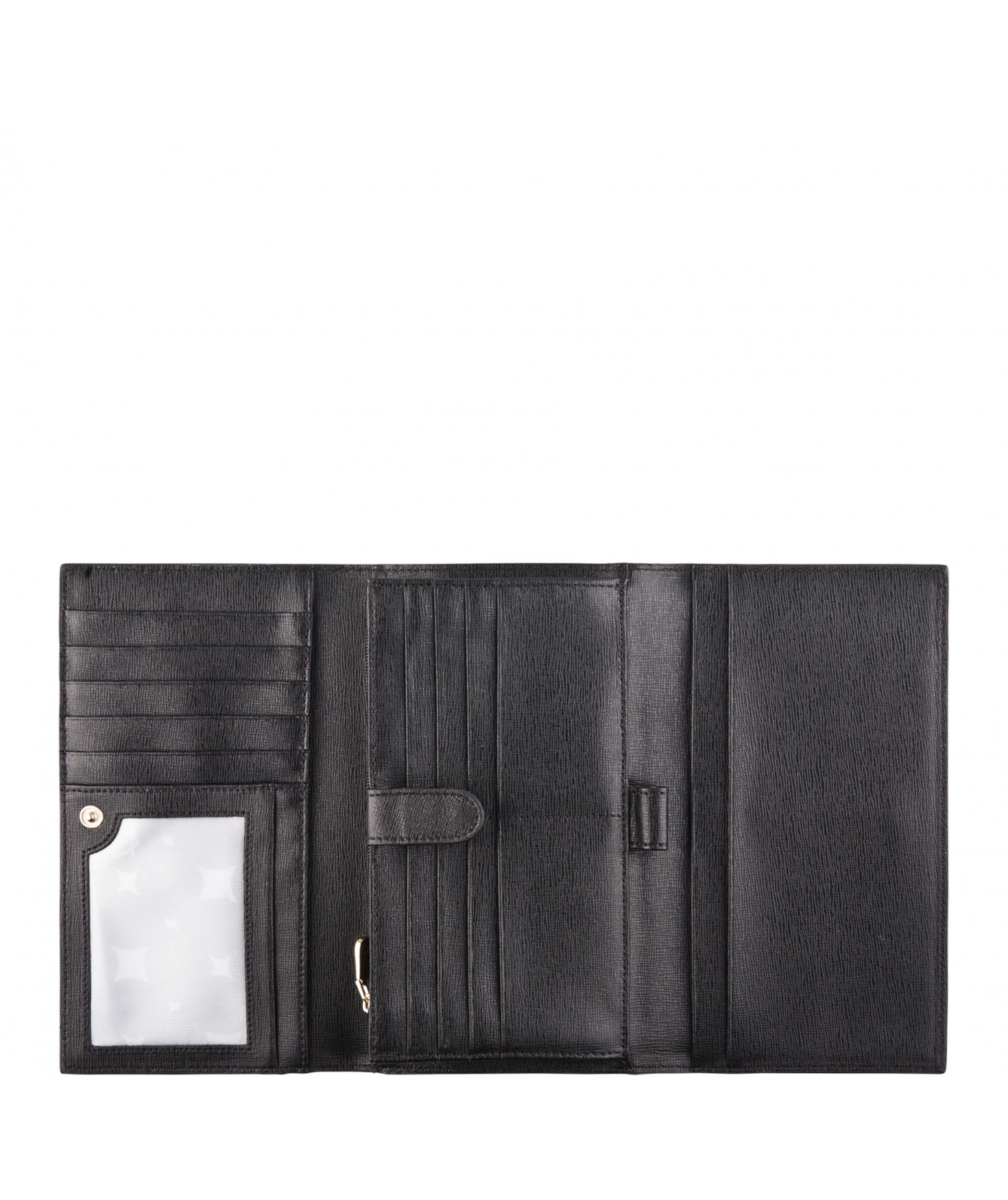 Tout-en-un porte chéquier, porte/stylo, un emplacement pour carte d'identité, 5 autres emplacements pour papiers, 13 emplacements pour cartes bancaires, porte-monnaie fermé par un zip, une poche zippée extérieure au dos.
