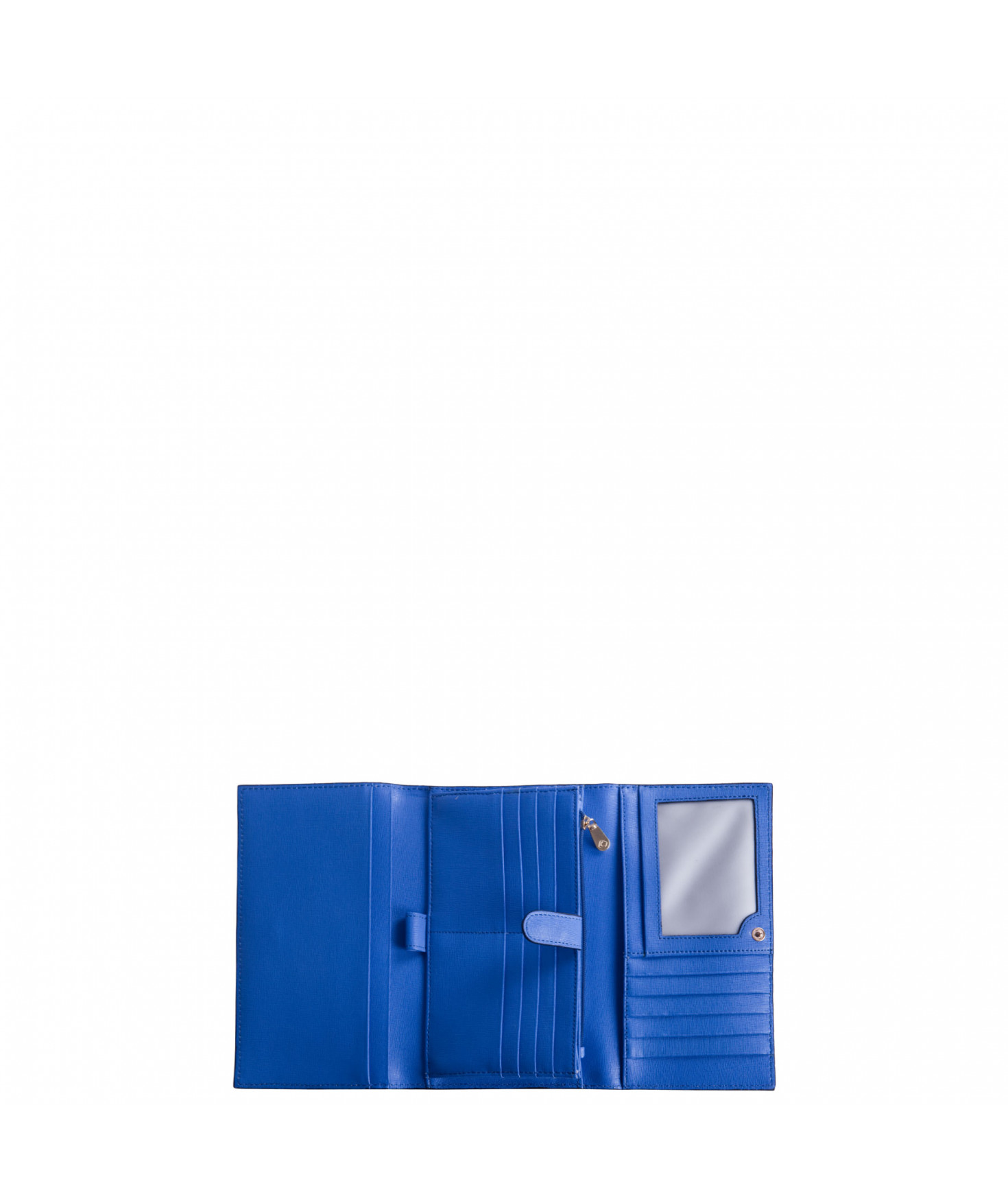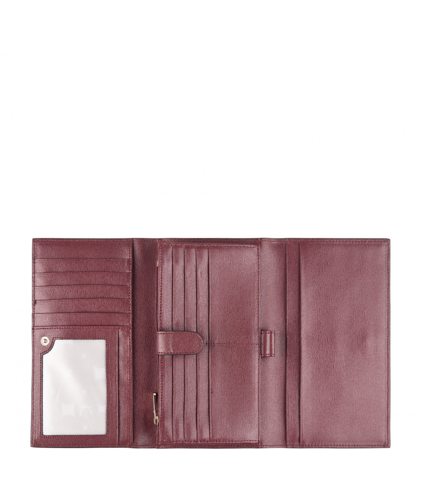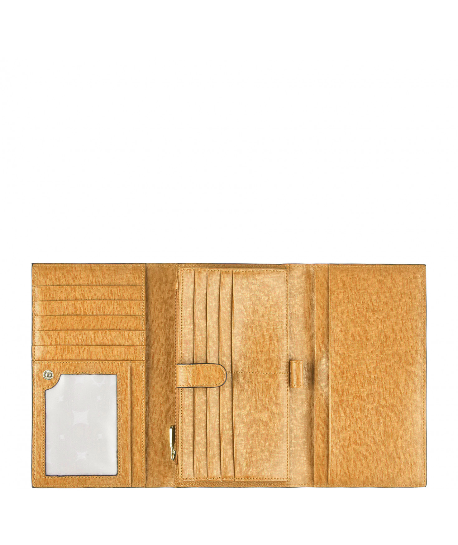Tout-en-un porte chéquier, porte/stylo, un emplacement pour carte d'identité, 5 autres emplacements pour papiers, 13 emplacements pour cartes bancaires, porte-monnaie fermé par un zip, une poche zippée extérieure au dos.