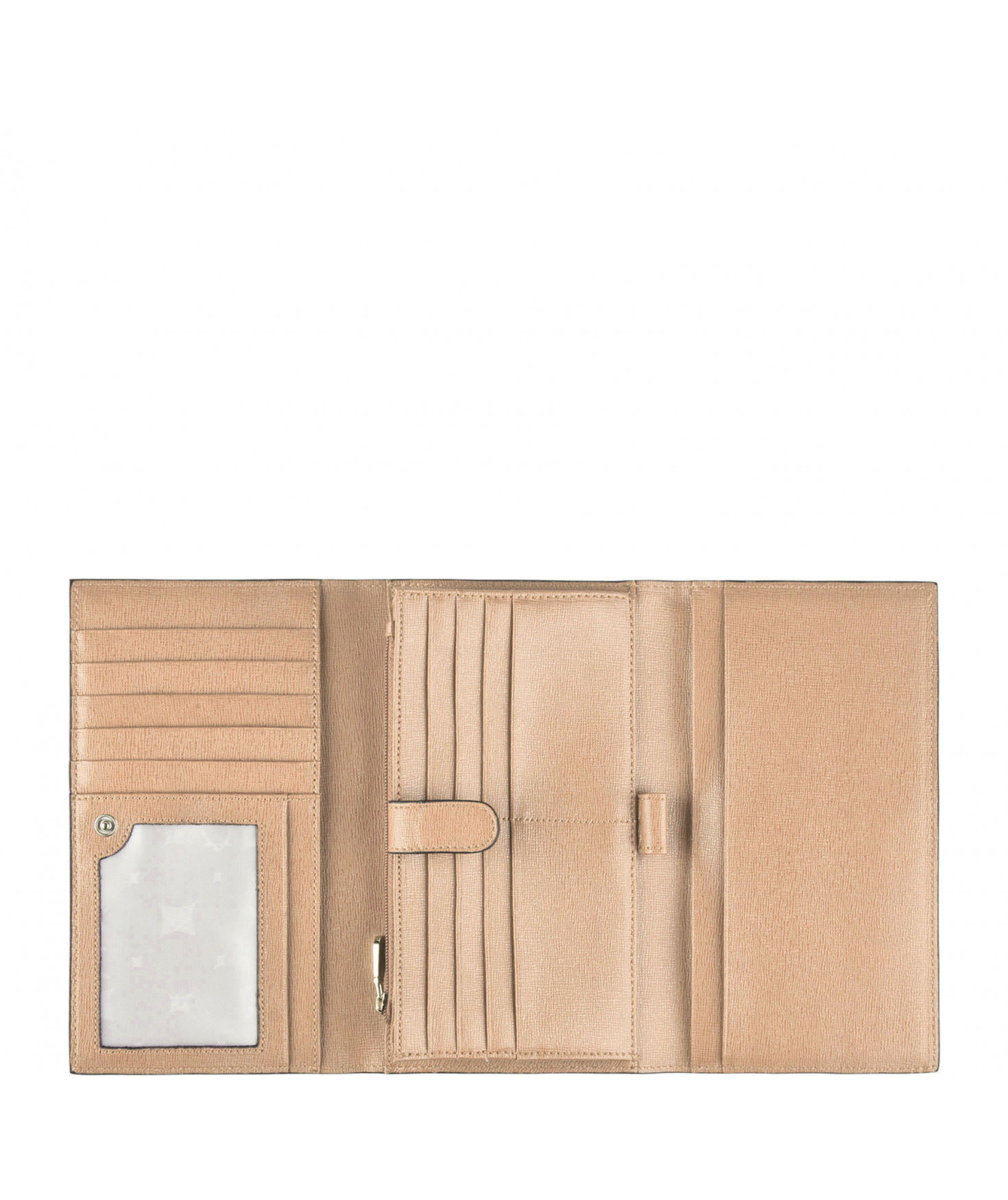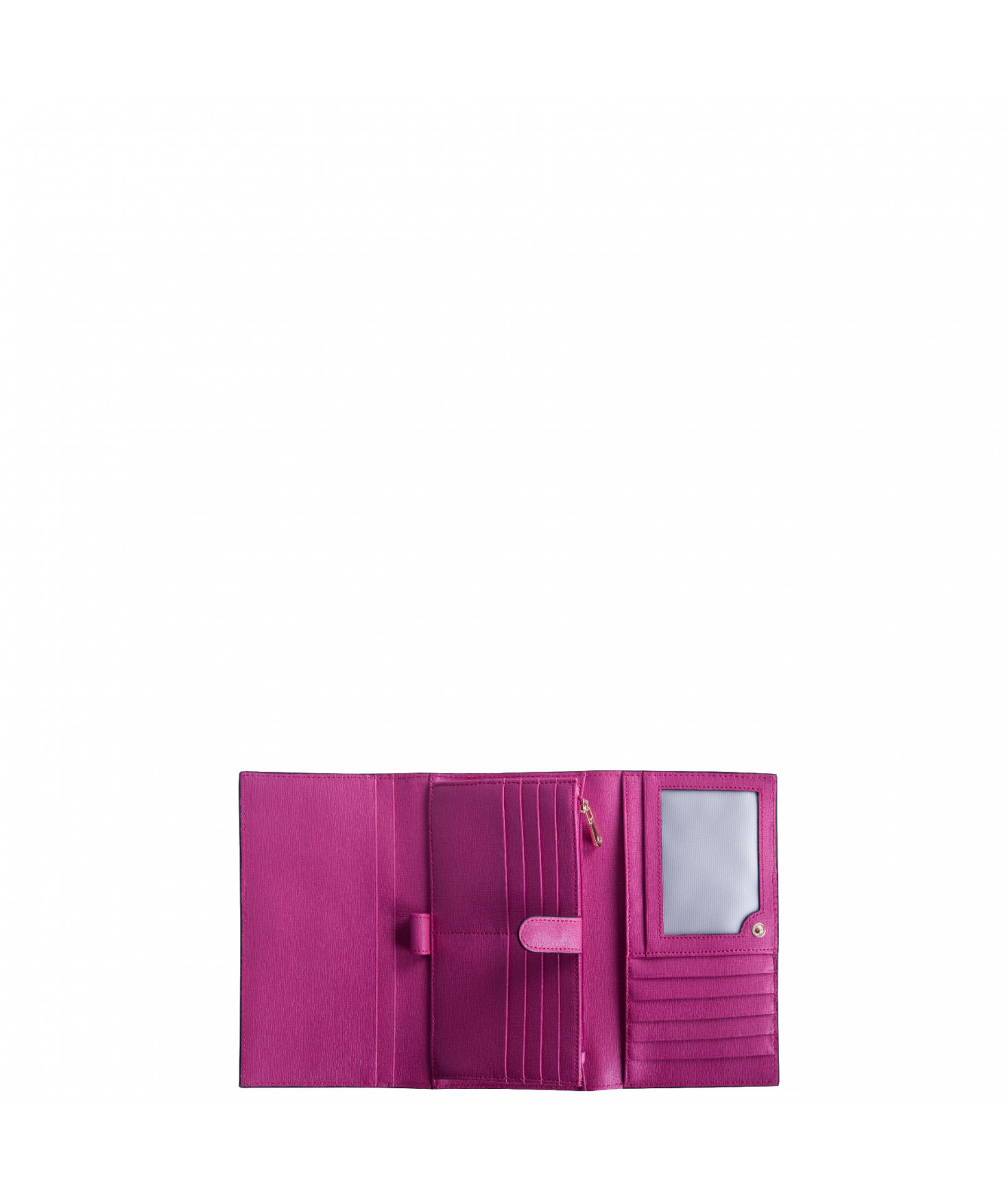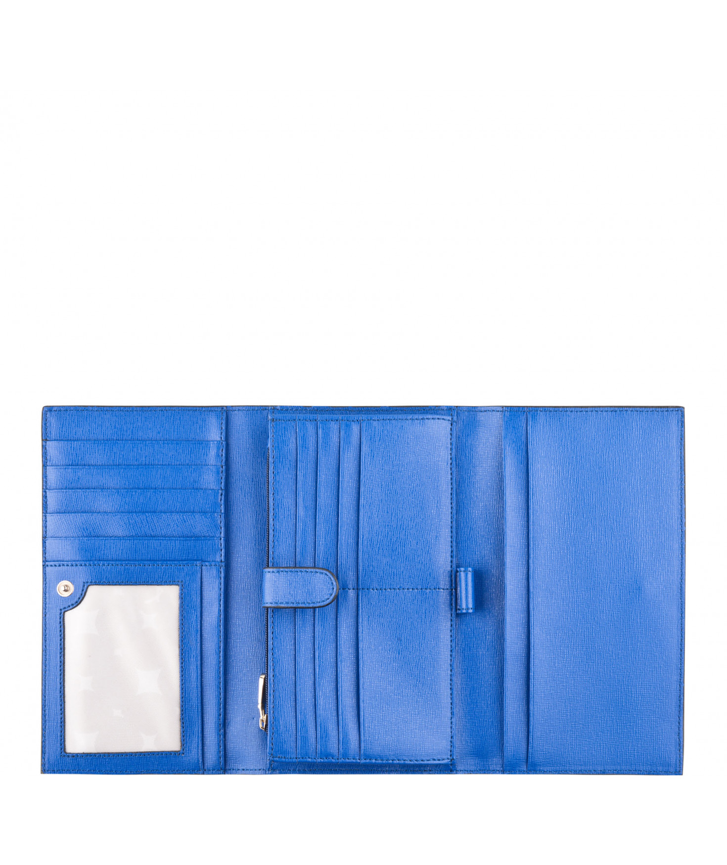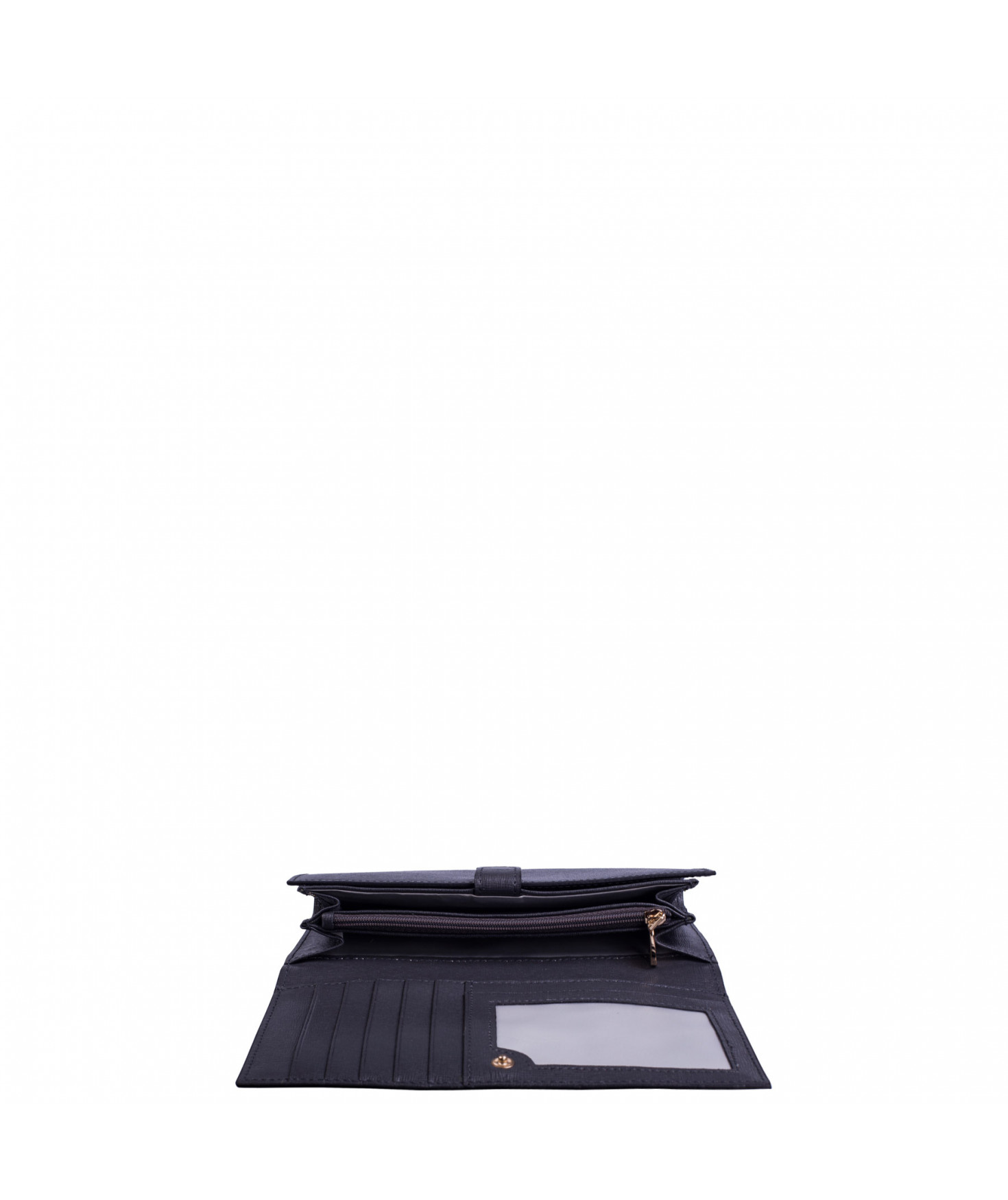 Tout-en-un porte chéquier, porte/stylo, un emplacement pour carte d'identité, 5 autres emplacements pour papiers, 13 emplacements pour cartes bancaires, porte-monnaie fermé par un zip, une poche zippée extérieure au dos.
